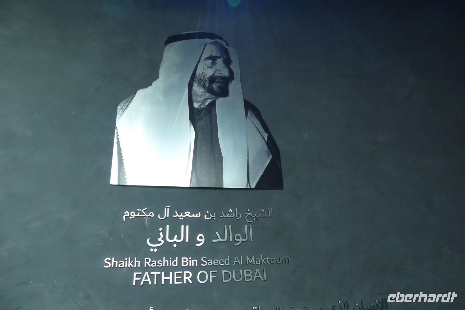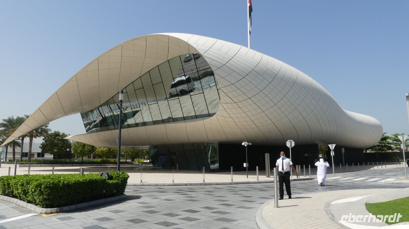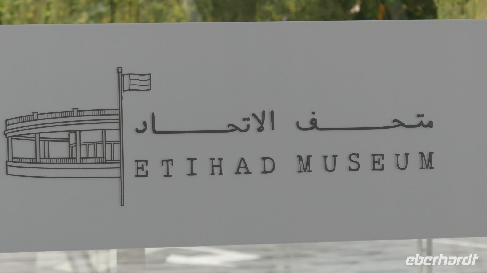 Nächster Halt: Etihad Museum. Das neue und auch architektonisch interessante Museum wurde an jenem Ort errichtet, an dem am 2. Dezember 1971 der Zusammenschluss der sechs bzw. sieben Emirate zu den Vereinigten Arabischen Emiraten erfolgte. Unsere emiratische Museumsführerin zeigt uns den Ort der Vertragsunterzeichnung (Union House), Empfangs- und Bankettsaal von Sheikh Rashid (1910 – 1990) sowie das moderne unterirdische Museum.