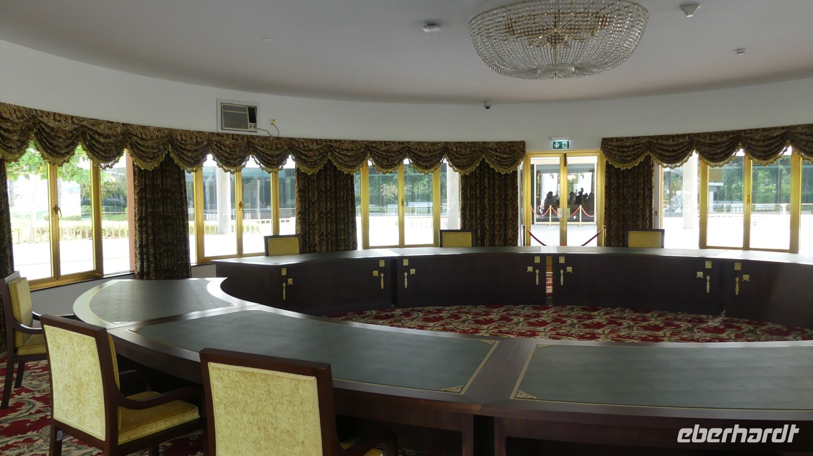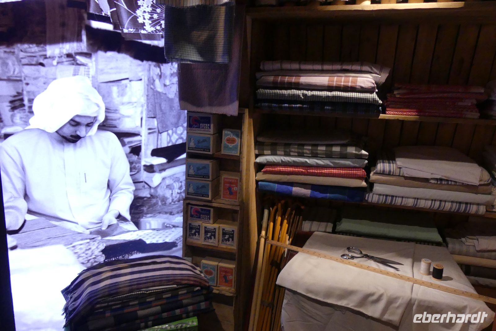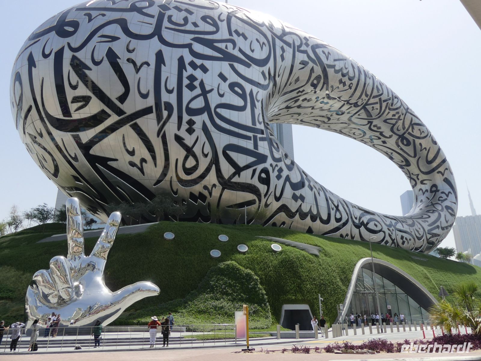 Nächster Halt: Etihad Museum. Das neue und auch architektonisch interessante Museum wurde an jenem Ort errichtet, an dem am 2. Dezember 1971 der Zusammenschluss der sechs bzw. sieben Emirate zu den Vereinigten Arabischen Emiraten erfolgte. Unsere emiratische Museumsführerin zeigt uns den Ort der Vertragsunterzeichnung (Union House), Empfangs- und Bankettsaal von Sheikh Rashid (1910 – 1990) sowie das moderne unterirdische Museum.