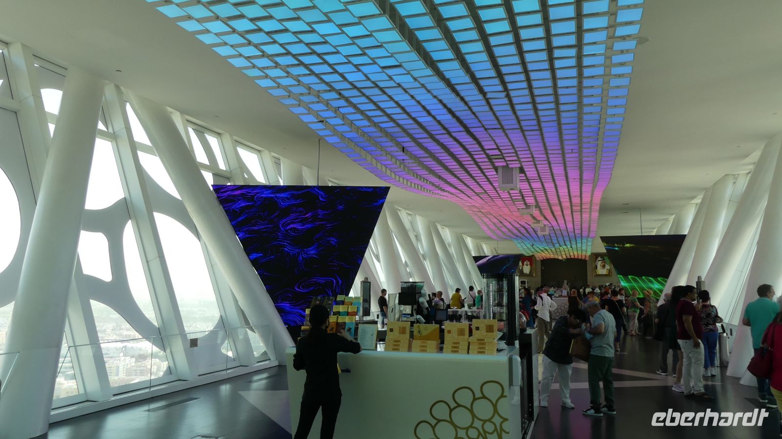 Der Nachmittag und Abend gehören der Dubai Mall und dem Burj Khalifa. Zunächst gibt Ibrahim einen kurzen Überblick über die riesige Dubai Mall mit mehr als 1.200 Geschäften. Von der Dubai Mall aus gelangt man zur Aussichtsplattform des Burj Khalifa in der 124./125. Etage. Aufgrund des permanent hohen Andrangs ist eine Gruppenführung auf der Aussichtsplattform nicht möglich. Jeder erhält von Ibrahim sein Ticket und besucht individuell den Burj Khalifa.