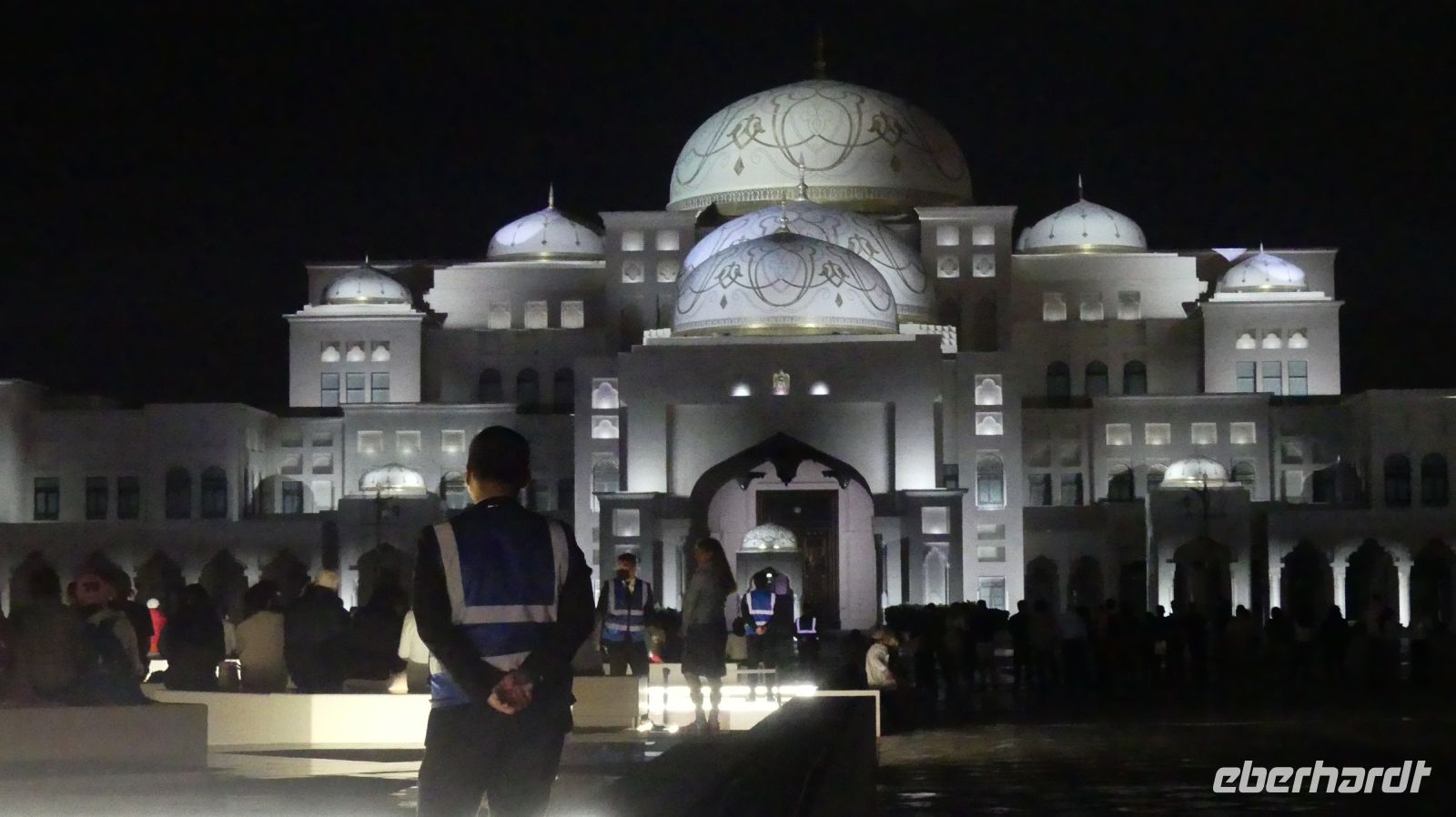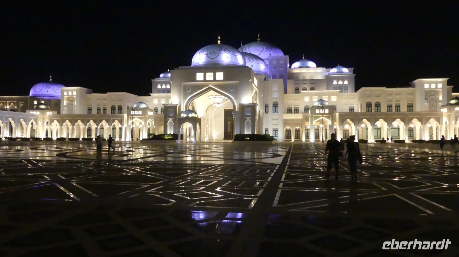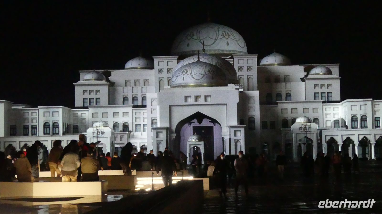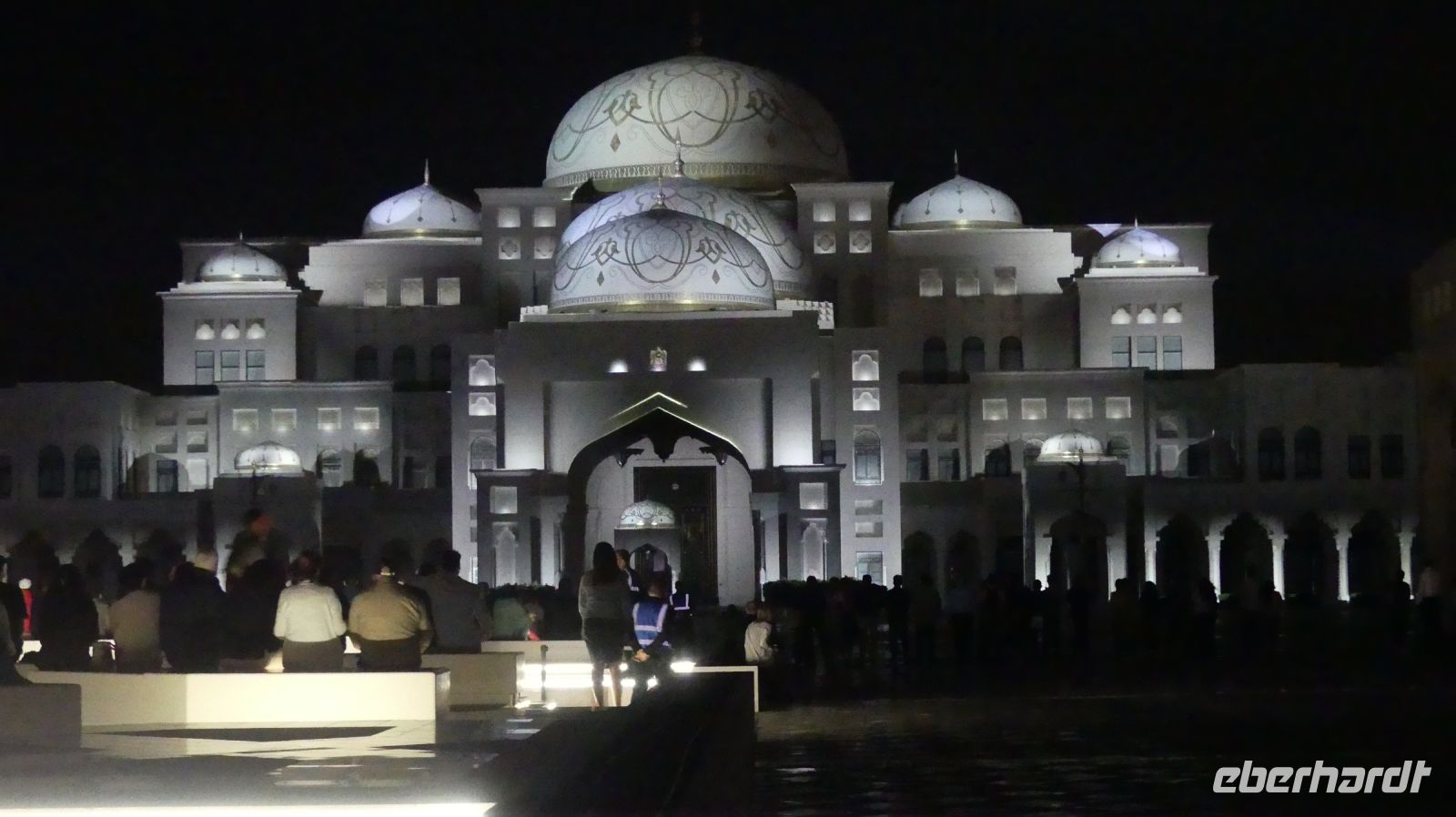 Am späten Nachmittag wartet noch ein weiterer Höhepunkt auf uns: der Besuch des Präsidentenpalastes der Vereinigten Arabischen Emirate. Das ist schon etwas Außergewöhnliches, denn wir wandeln durch Räumlichkeiten, die sonst nur Staatsgästen zugänglich sind. Zum Beispiel sehen wir den riesigen Empfangssaal, die Sitzungsräume der hiesigen Herrscher (Majlis Bani Yas), den Bankettsaal, die Bibliothek und eine begehbare Kalligraphie. Zum Abschluss unseres Palastbesuches erleben wir nach Sonnenuntergang eine Licht- und Tonschau. Die „Palace in Motion“ Show zeigt Motive aus der Geschichte, Gegenwart und Zukunft des Landes.