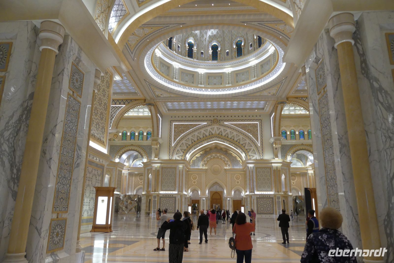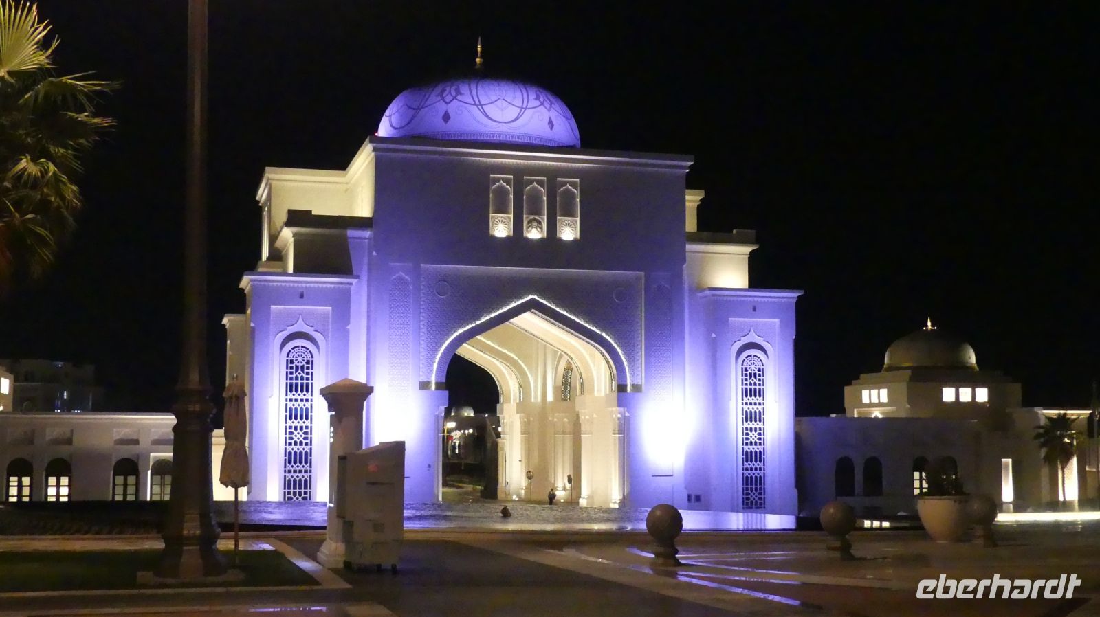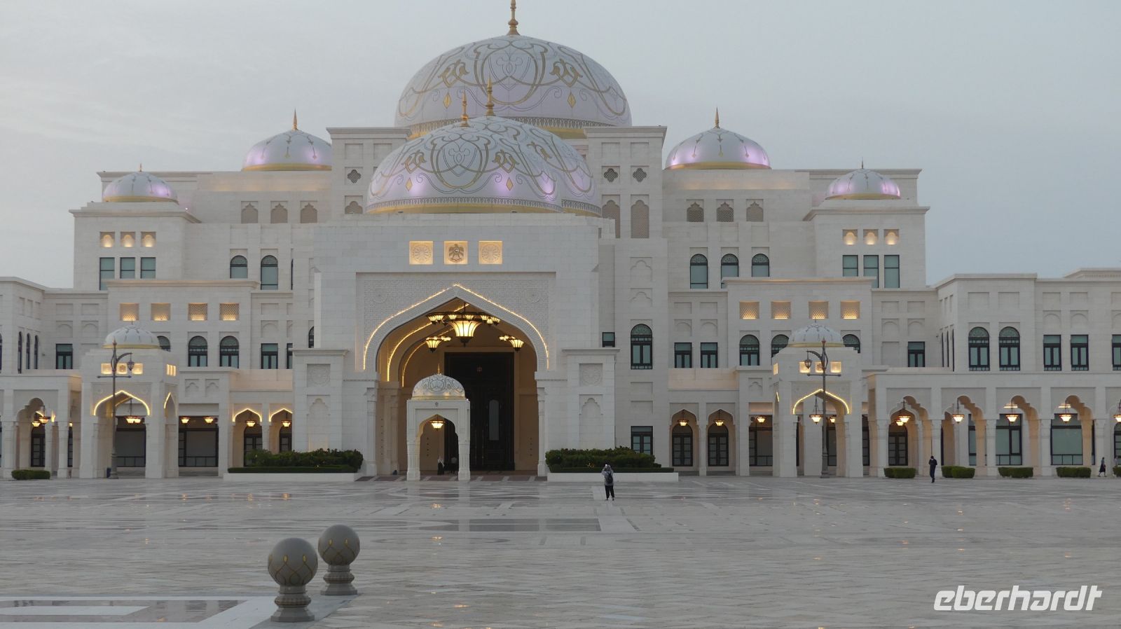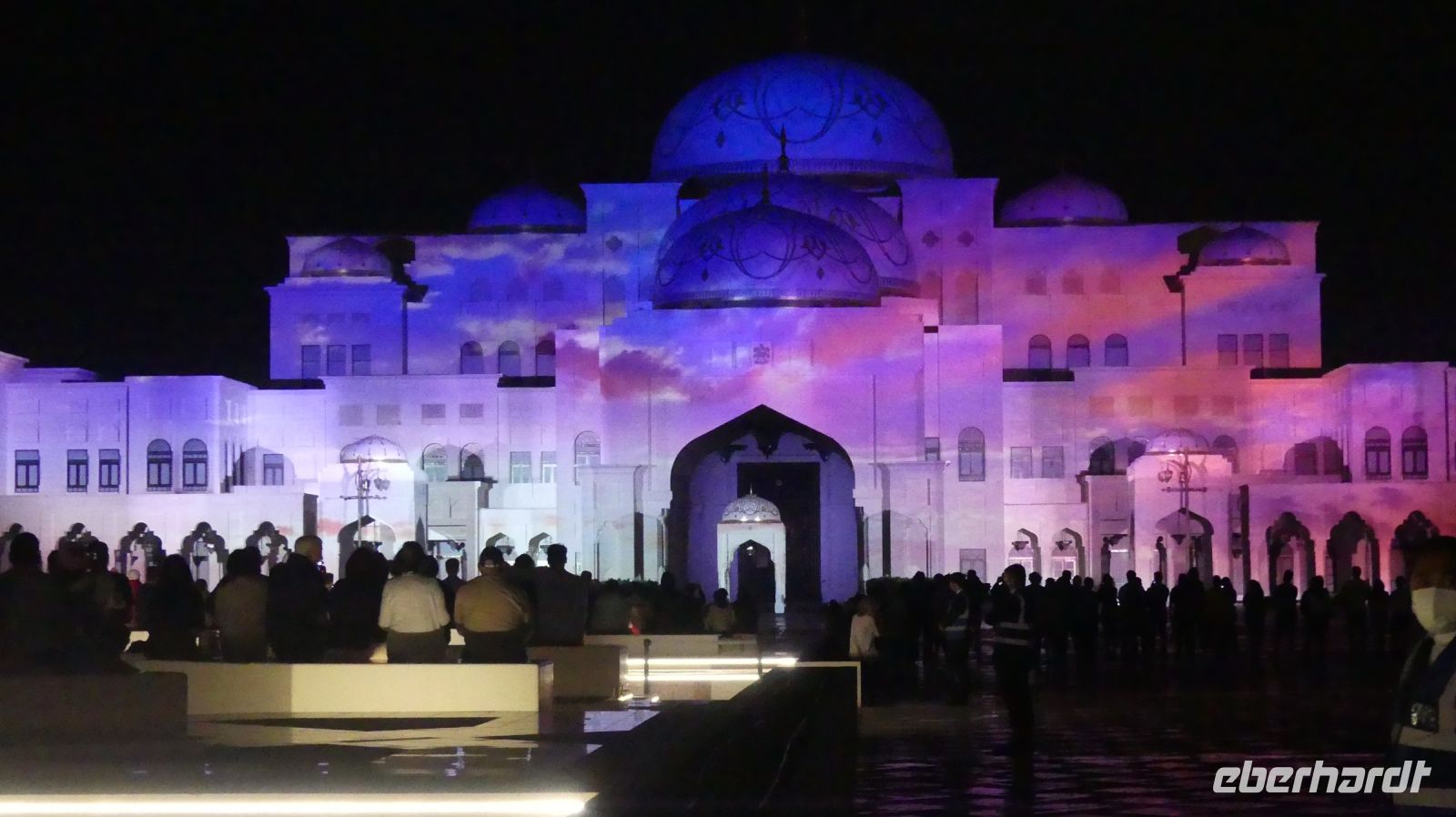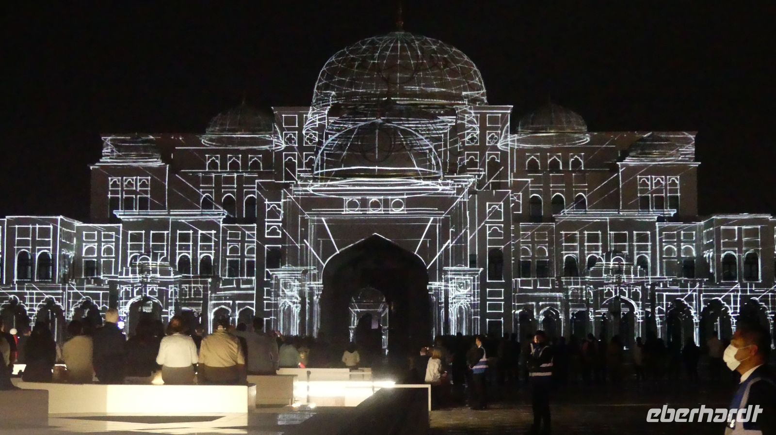 Am späten Nachmittag wartet noch ein weiterer Höhepunkt auf uns: der Besuch des Präsidentenpalastes der Vereinigten Arabischen Emirate. Das ist schon etwas Außergewöhnliches, denn wir wandeln durch Räumlichkeiten, die sonst nur Staatsgästen zugänglich sind. Zum Beispiel sehen wir den riesigen Empfangssaal, die Sitzungsräume der hiesigen Herrscher (Majlis Bani Yas), den Bankettsaal, die Bibliothek und eine begehbare Kalligraphie. Zum Abschluss unseres Palastbesuches erleben wir nach Sonnenuntergang eine Licht- und Tonschau. Die „Palace in Motion“ Show zeigt Motive aus der Geschichte, Gegenwart und Zukunft des Landes.
