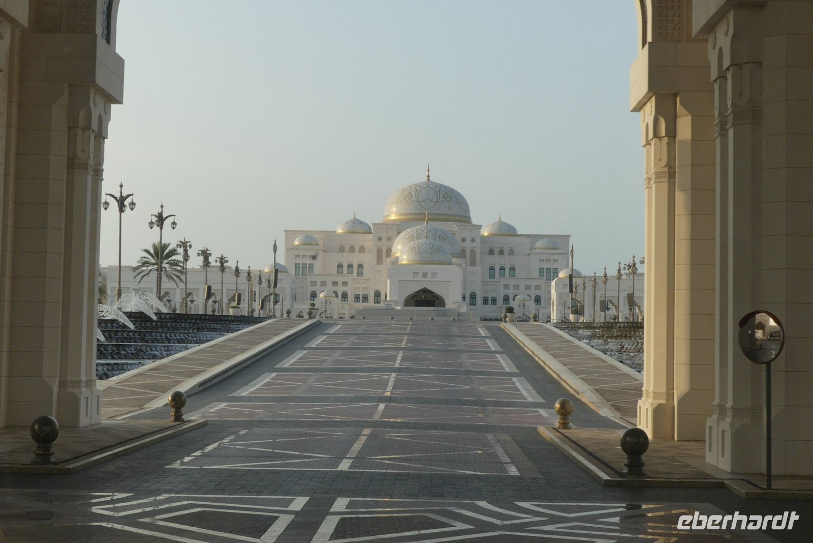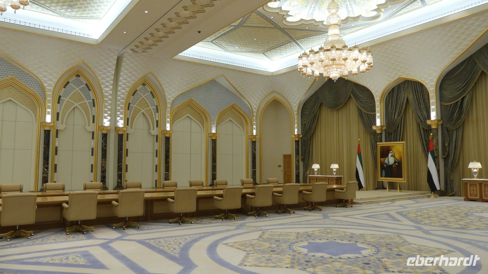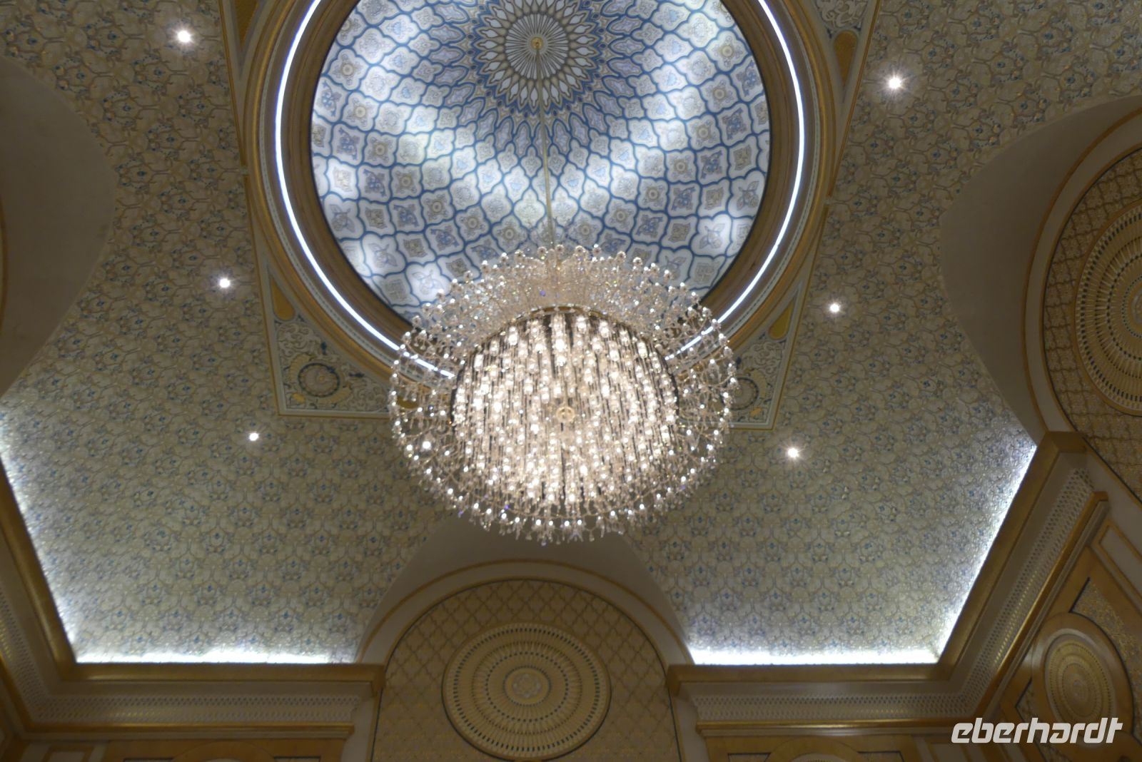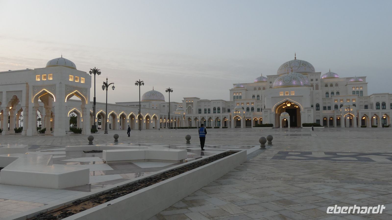 Am späten Nachmittag wartet noch ein weiterer Höhepunkt auf uns: der Besuch des Präsidentenpalastes der Vereinigten Arabischen Emirate. Das ist schon etwas Außergewöhnliches, denn wir wandeln durch Räumlichkeiten, die sonst nur Staatsgästen zugänglich sind. Zum Beispiel sehen wir den riesigen Empfangssaal, die Sitzungsräume der hiesigen Herrscher (Majlis Bani Yas), den Bankettsaal, die Bibliothek und eine begehbare Kalligraphie. Zum Abschluss unseres Palastbesuches erleben wir nach Sonnenuntergang eine Licht- und Tonschau. Die „Palace in Motion“ Show zeigt Motive aus der Geschichte, Gegenwart und Zukunft des Landes.