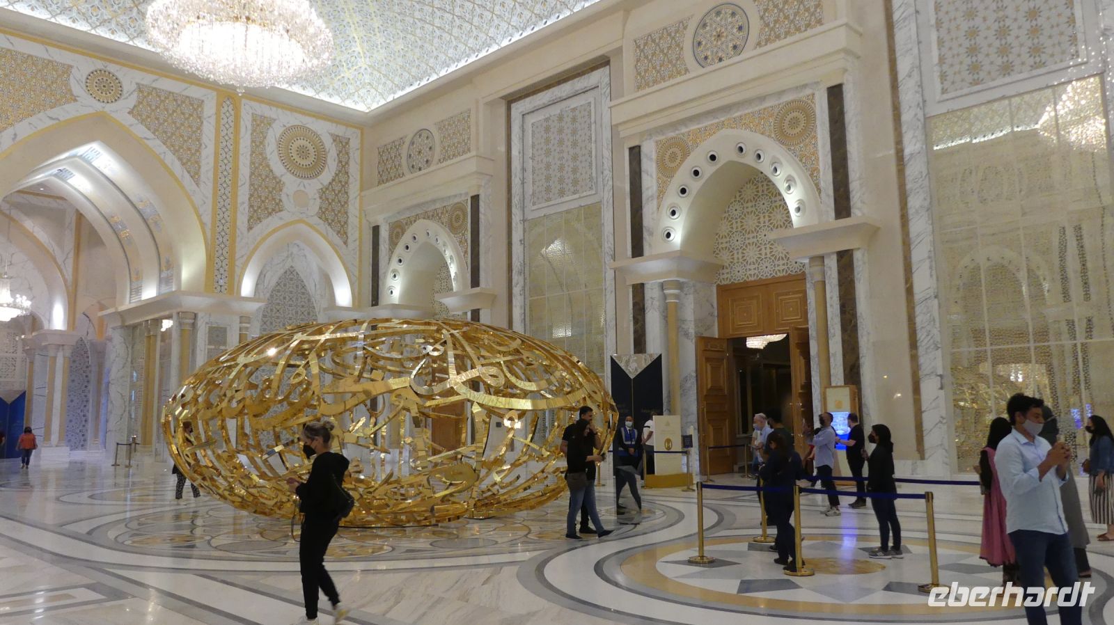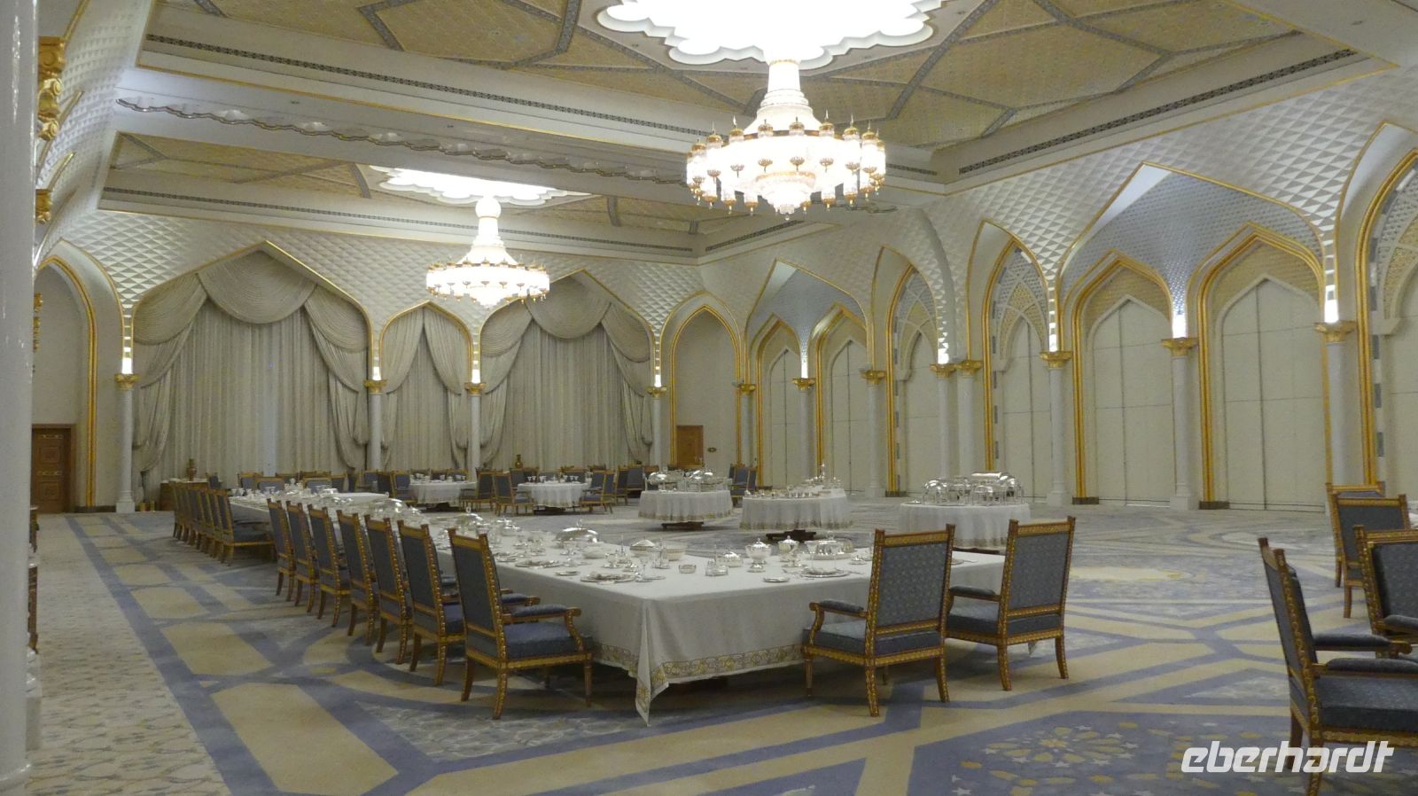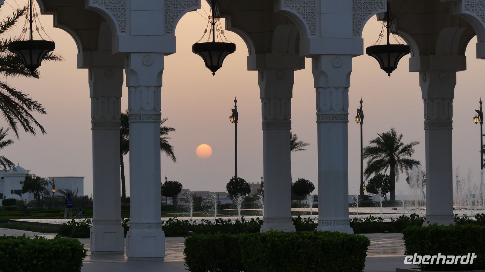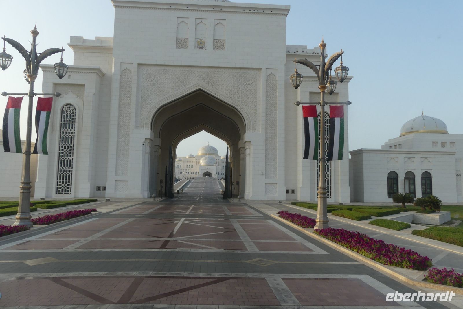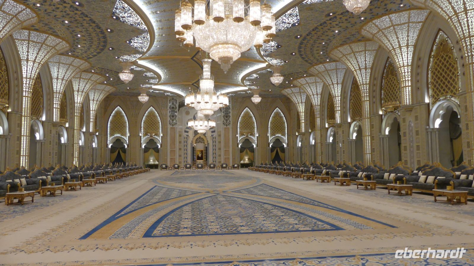 Am späten Nachmittag wartet noch ein weiterer Höhepunkt auf uns: der Besuch des Präsidentenpalastes der Vereinigten Arabischen Emirate. Das ist schon etwas Außergewöhnliches, denn wir wandeln durch Räumlichkeiten, die sonst nur Staatsgästen zugänglich sind. Zum Beispiel sehen wir den riesigen Empfangssaal, die Sitzungsräume der hiesigen Herrscher (Majlis Bani Yas), den Bankettsaal, die Bibliothek und eine begehbare Kalligraphie. Zum Abschluss unseres Palastbesuches erleben wir nach Sonnenuntergang eine Licht- und Tonschau. Die „Palace in Motion“ Show zeigt Motive aus der Geschichte, Gegenwart und Zukunft des Landes.