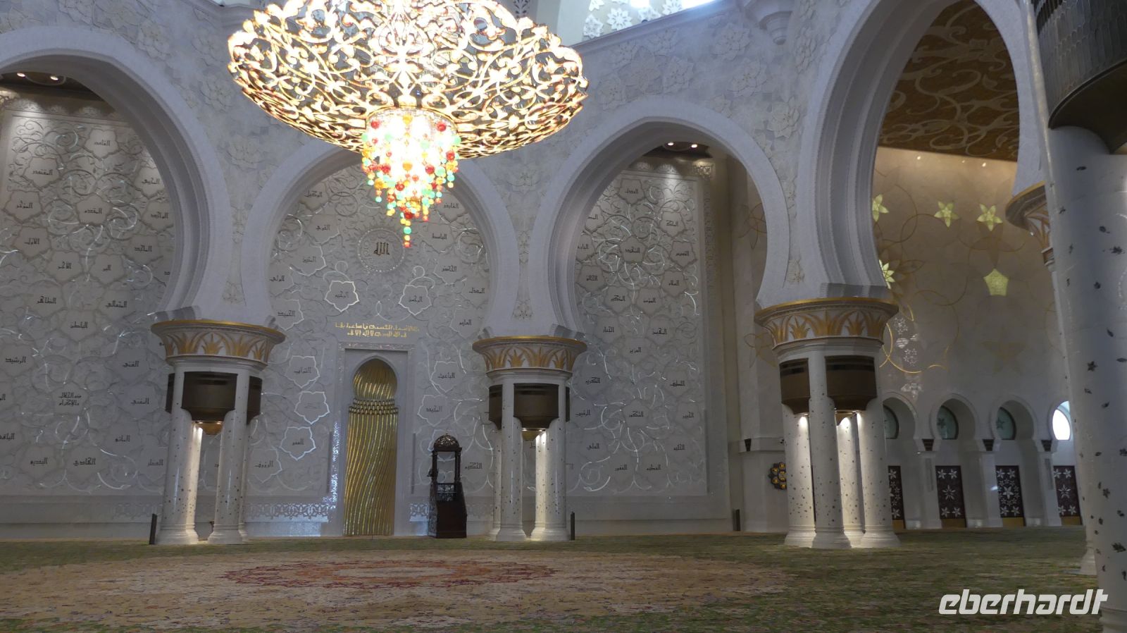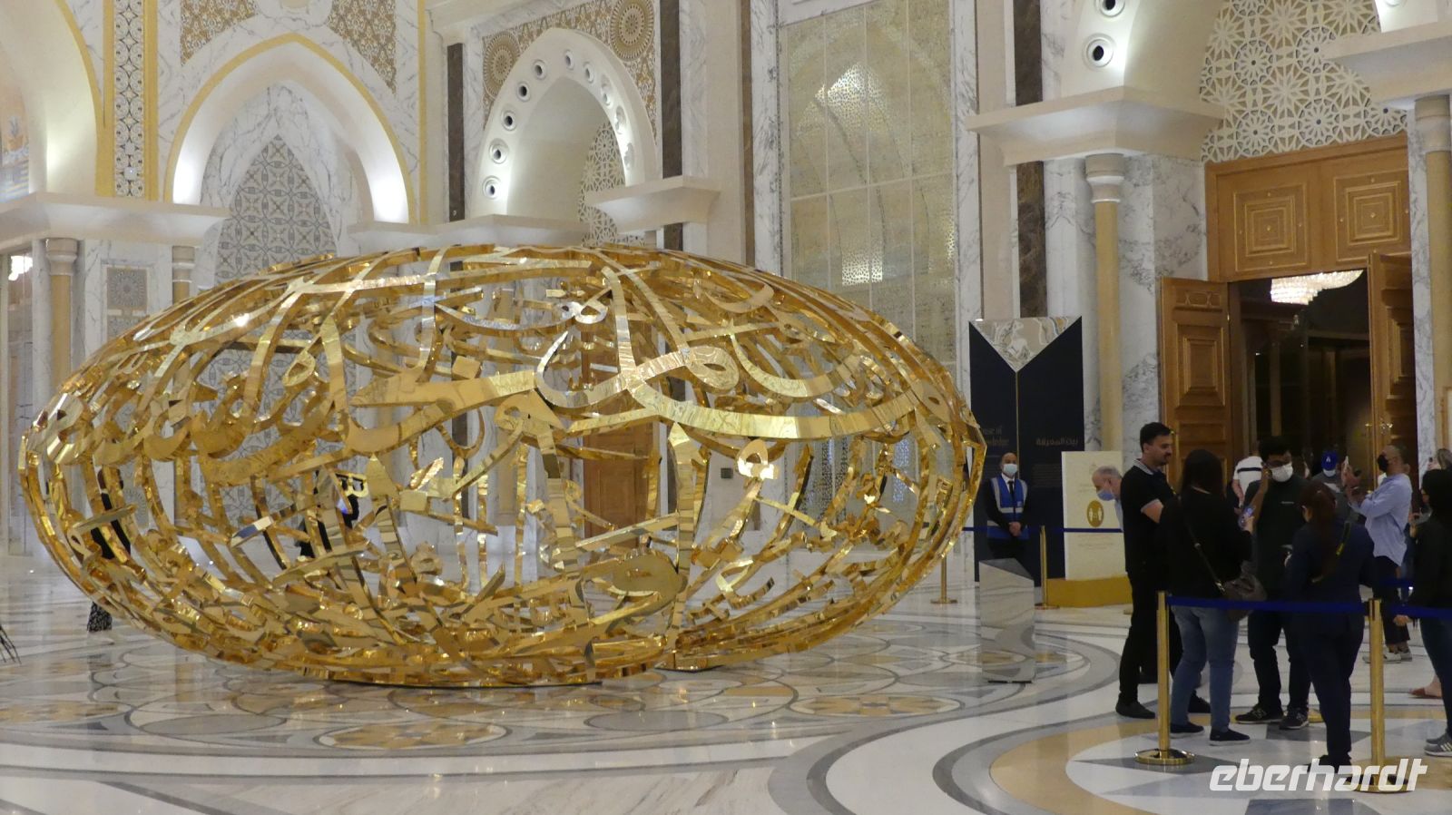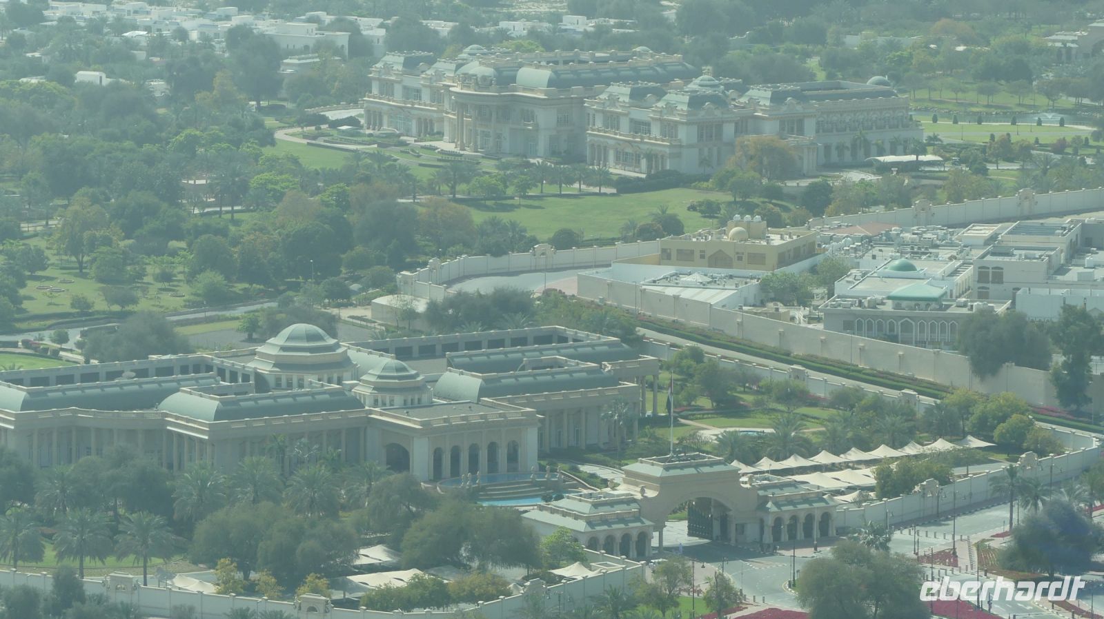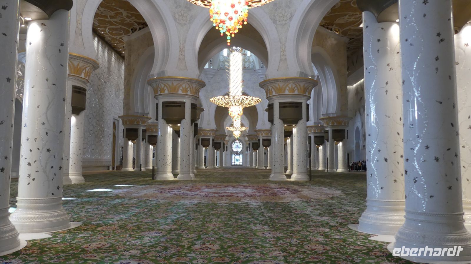 Am späten Nachmittag wartet noch ein weiterer Höhepunkt auf uns: der Besuch des Präsidentenpalastes der Vereinigten Arabischen Emirate. Das ist schon etwas Außergewöhnliches, denn wir wandeln durch Räumlichkeiten, die sonst nur Staatsgästen zugänglich sind. Zum Beispiel sehen wir den riesigen Empfangssaal, die Sitzungsräume der hiesigen Herrscher (Majlis Bani Yas), den Bankettsaal, die Bibliothek und eine begehbare Kalligraphie. Zum Abschluss unseres Palastbesuches erleben wir nach Sonnenuntergang eine Licht- und Tonschau. Die „Palace in Motion“ Show zeigt Motive aus der Geschichte, Gegenwart und Zukunft des Landes.