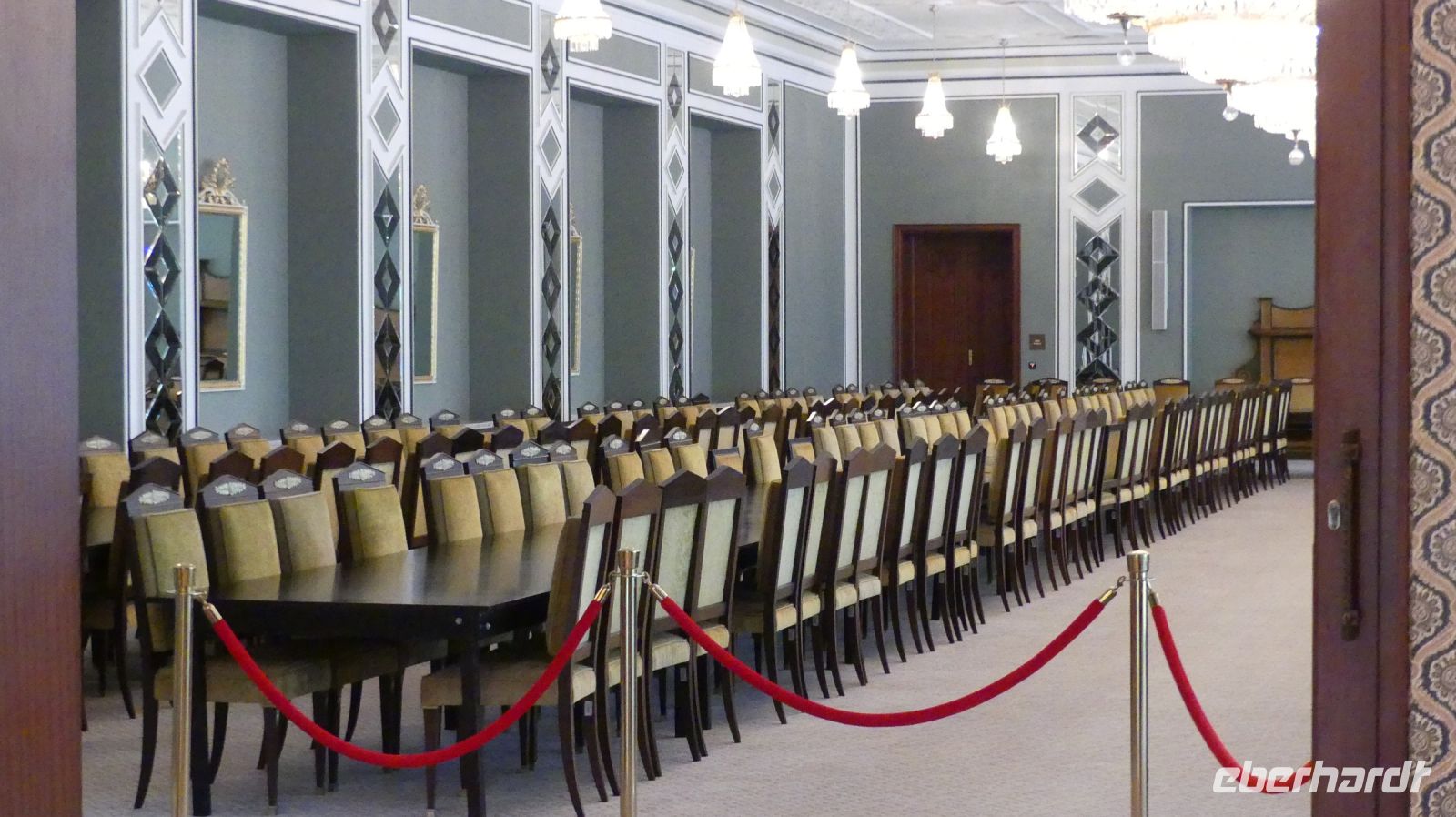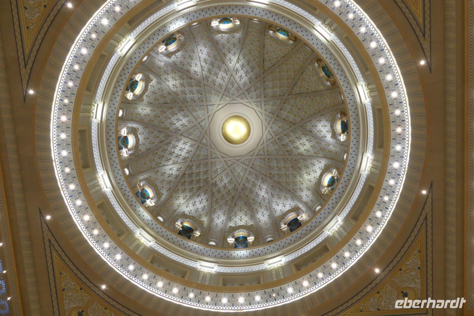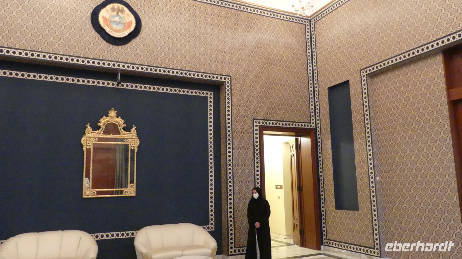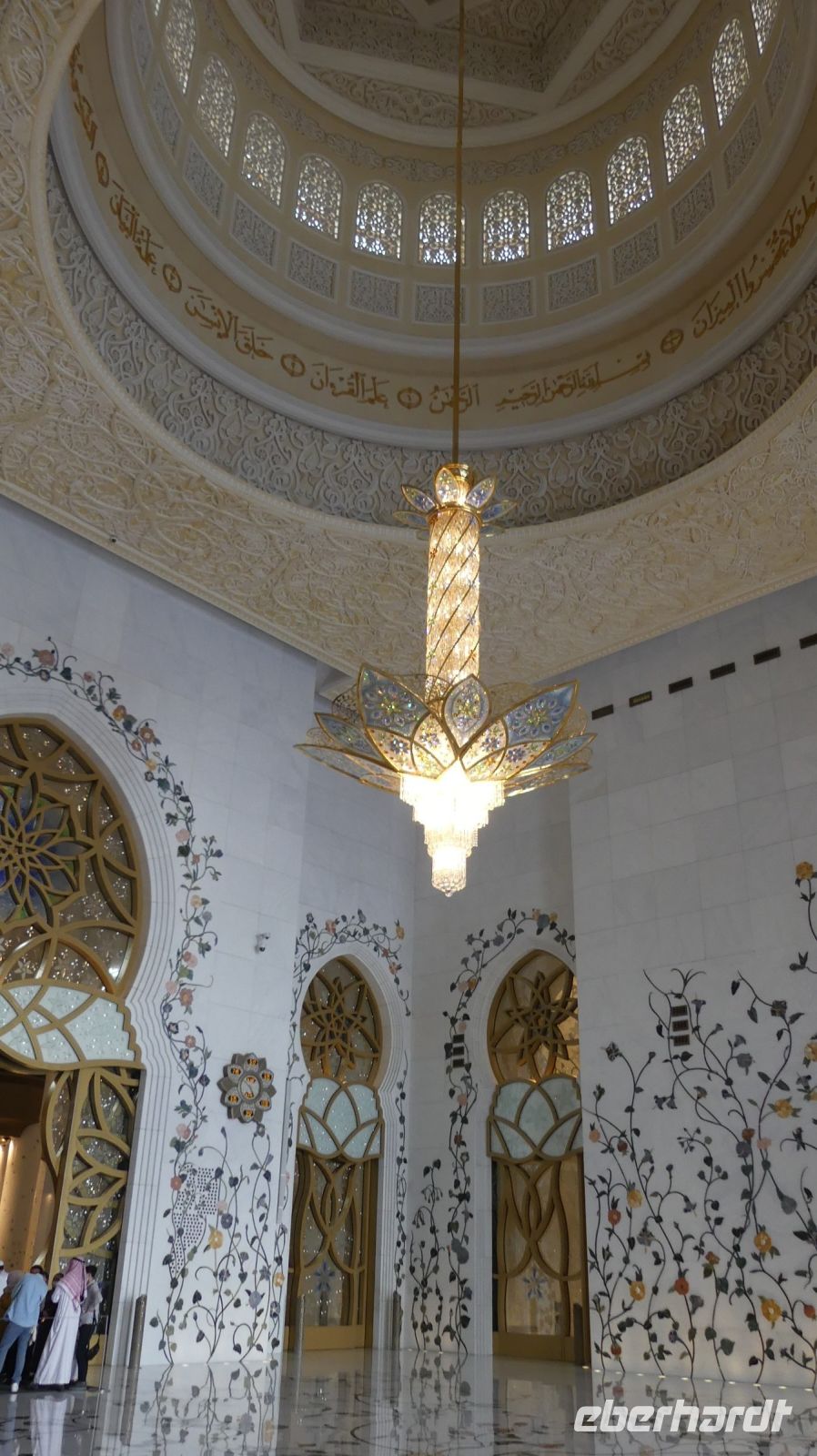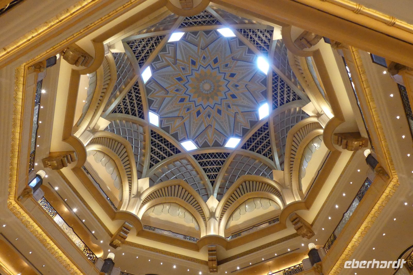 Am späten Nachmittag wartet noch ein weiterer Höhepunkt auf uns: der Besuch des Präsidentenpalastes der Vereinigten Arabischen Emirate. Das ist schon etwas Außergewöhnliches, denn wir wandeln durch Räumlichkeiten, die sonst nur Staatsgästen zugänglich sind. Zum Beispiel sehen wir den riesigen Empfangssaal, die Sitzungsräume der hiesigen Herrscher (Majlis Bani Yas), den Bankettsaal, die Bibliothek und eine begehbare Kalligraphie. Zum Abschluss unseres Palastbesuches erleben wir nach Sonnenuntergang eine Licht- und Tonschau. Die „Palace in Motion“ Show zeigt Motive aus der Geschichte, Gegenwart und Zukunft des Landes.