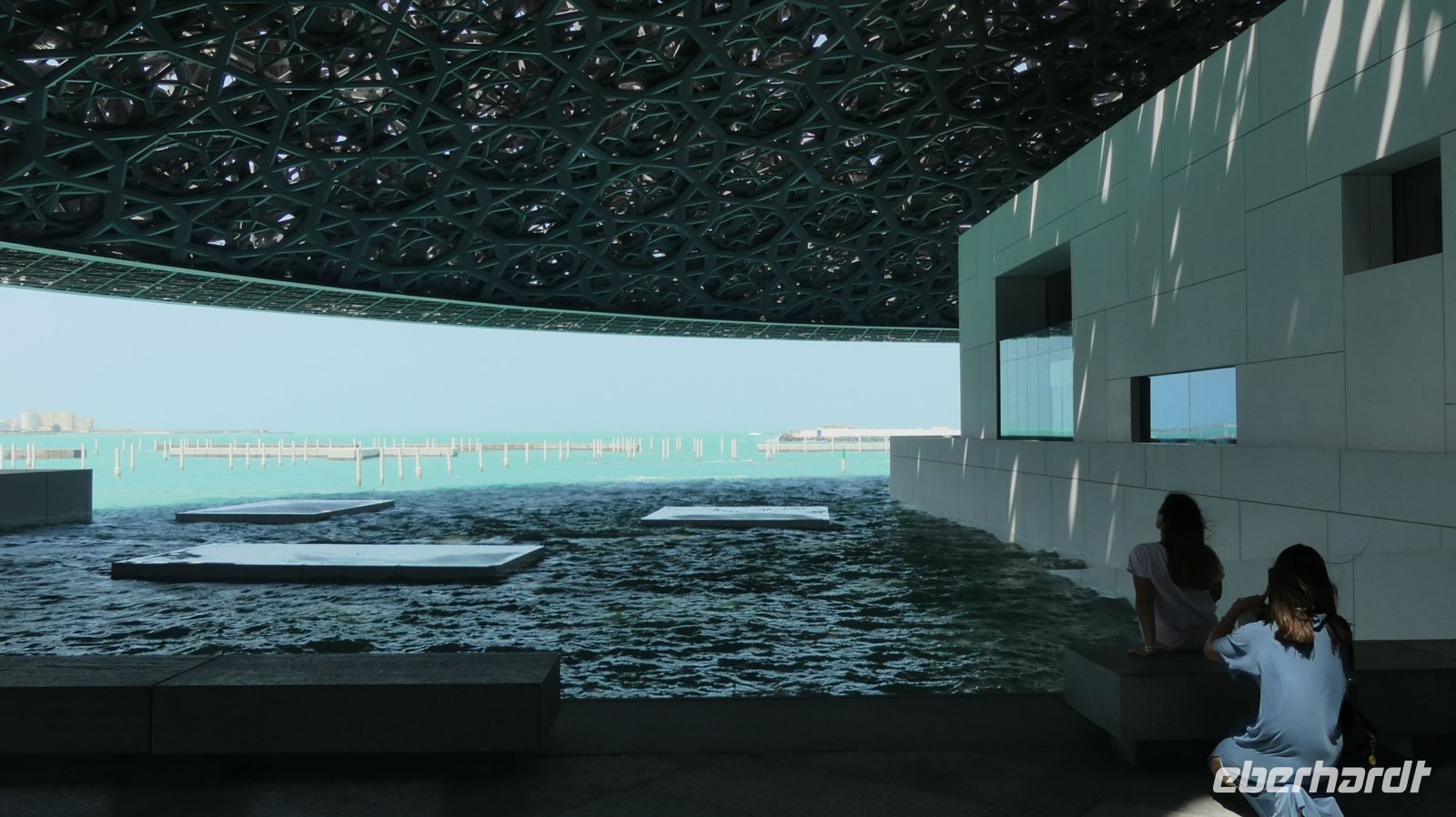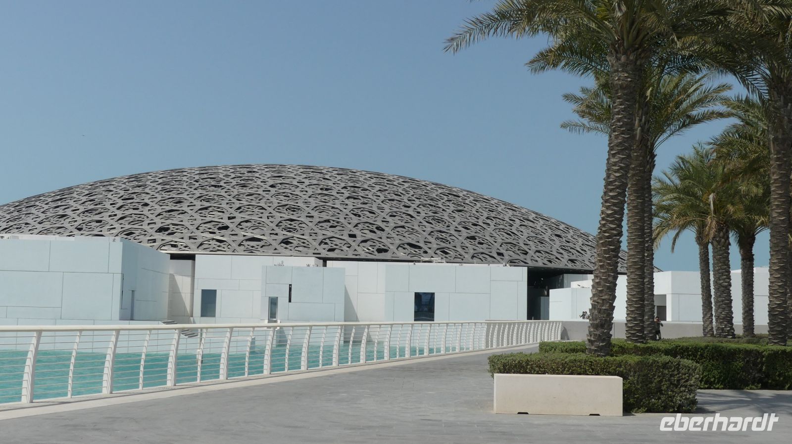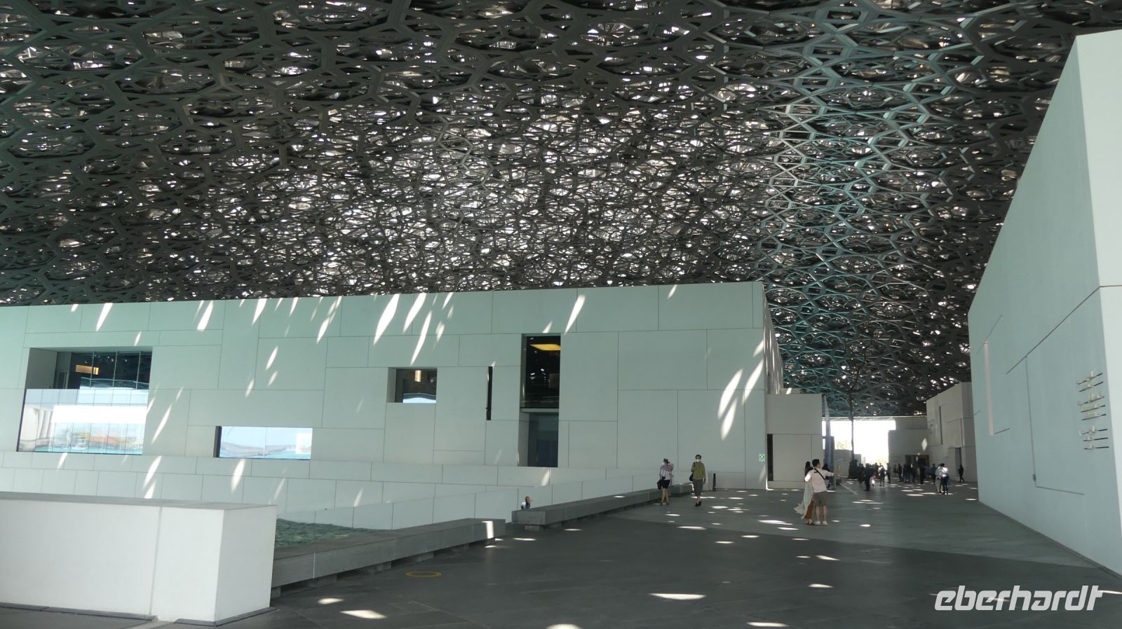 Wir setzen unsere Fahrt fort durch die Inselwelt. Nach der Insel Yas folgt Jabeel Island, wo sich große Mangrovenwälder befinden und schließlich kommen nach Saadiyat Island, der Insel der „Glückseligkeit“. Auf Saadiyat Island entsteht ein sehr ambitioniertes Kulturzentrum mit architektonisch herausragenden Projekten wie dem Nationalmuseum (Sir Norman Forster), dem Guggenheim Museum (Frank Gerry), dem Maritim Museum (Tadao Ando), einer Konzerthalle (Zaha Hadid) sowie einem sehr bemerkenswerten interreligiösen Zentrum unter dem Namen Abrahamic Family House. Bereits fertig gestellt ist der Louvre Abu Dhabi. Unter seiner 180 Meter messenden Kuppel zu stehen, ist ein ganz besonderes Erlebnis, auch wenn es heute ziemlich windig ist. Der Architekt Jean Nouvel hat die Kuppel so gestaltet, dass einzelne Sonnenstrahlen durchdringen - „Rain of Light Building“ genannt. Nouvel nennt den Louvre einen „Archipel der Kunst“, denn das Kunstmuseum wurde ins Meer gebaut, ist von drei Seiten vom Arabischen Golf umspült. Und es ist ein Hinweis auf das Ausstellungskonzept: ein Ort an dem Kunstwerke aus verschiedenen Kulturen der Welt zusammen kommen.