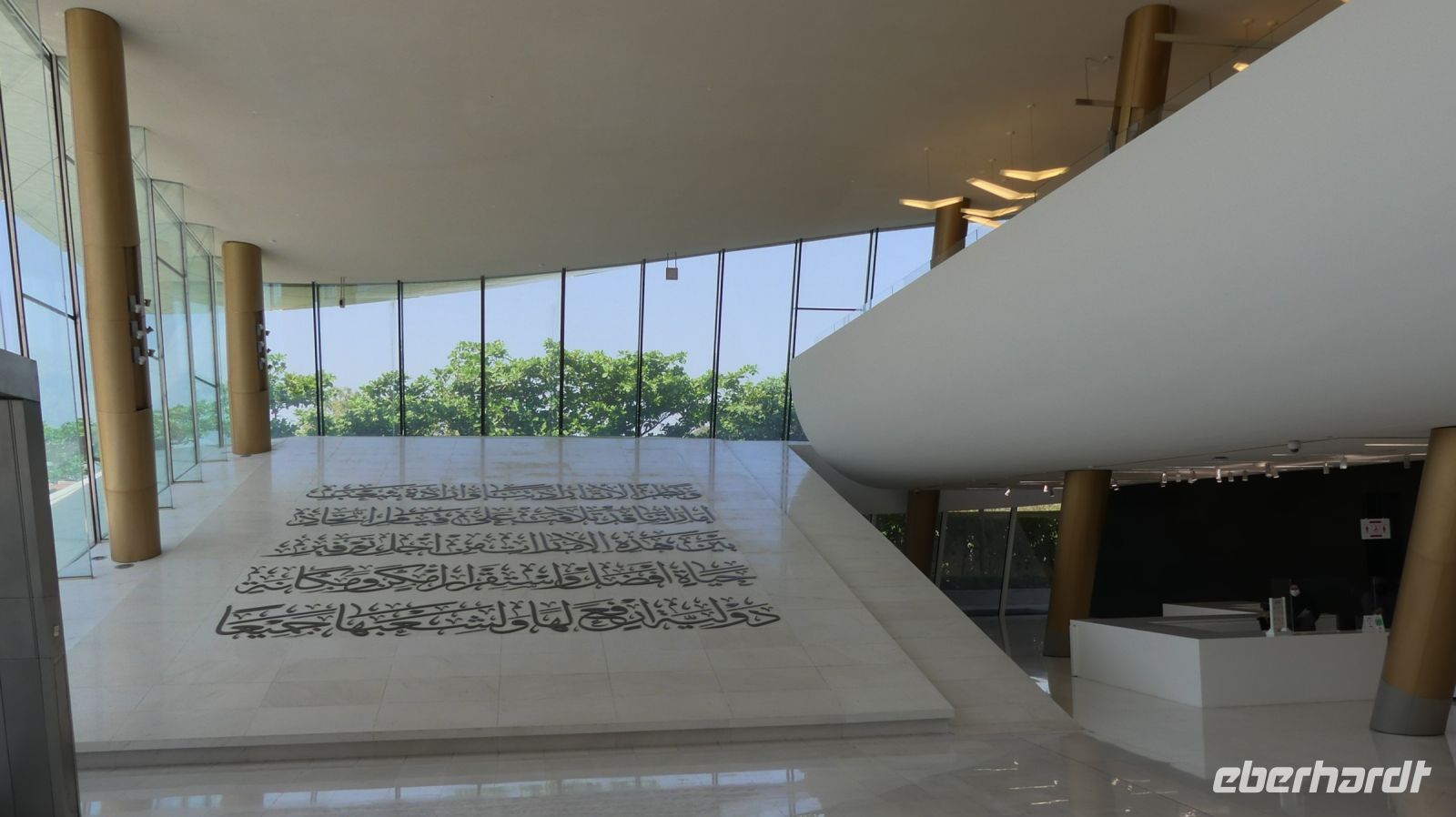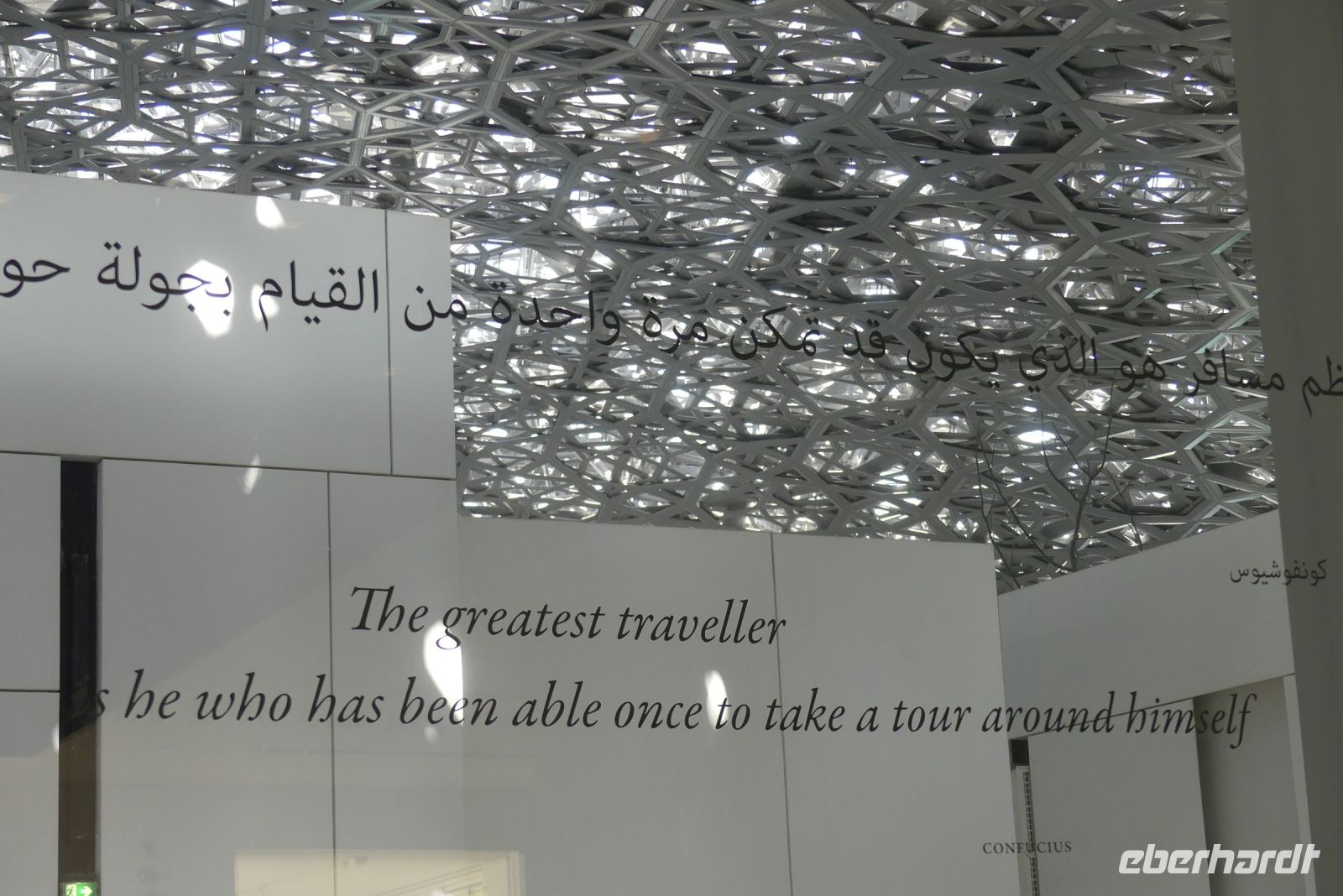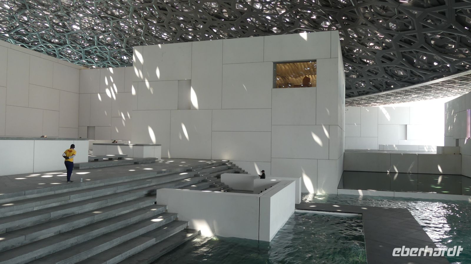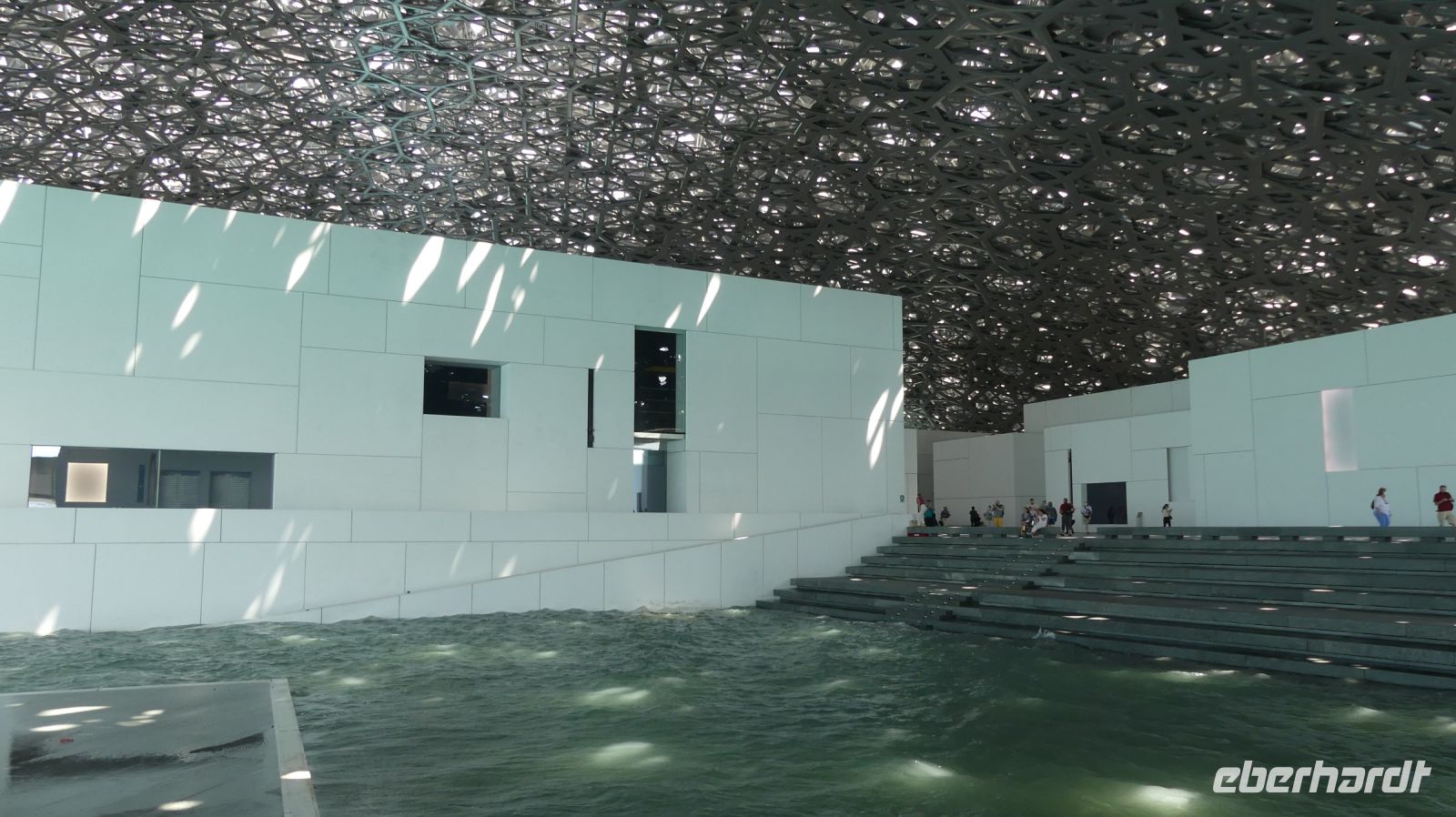 Wir setzen unsere Fahrt fort durch die Inselwelt. Nach der Insel Yas folgt Jabeel Island, wo sich große Mangrovenwälder befinden und schließlich kommen nach Saadiyat Island, der Insel der „Glückseligkeit“. Auf Saadiyat Island entsteht ein sehr ambitioniertes Kulturzentrum mit architektonisch herausragenden Projekten wie dem Nationalmuseum (Sir Norman Forster), dem Guggenheim Museum (Frank Gerry), dem Maritim Museum (Tadao Ando), einer Konzerthalle (Zaha Hadid) sowie einem sehr bemerkenswerten interreligiösen Zentrum unter dem Namen Abrahamic Family House. Bereits fertig gestellt ist der Louvre Abu Dhabi. Unter seiner 180 Meter messenden Kuppel zu stehen, ist ein ganz besonderes Erlebnis, auch wenn es heute ziemlich windig ist. Der Architekt Jean Nouvel hat die Kuppel so gestaltet, dass einzelne Sonnenstrahlen durchdringen - „Rain of Light Building“ genannt. Nouvel nennt den Louvre einen „Archipel der Kunst“, denn das Kunstmuseum wurde ins Meer gebaut, ist von drei Seiten vom Arabischen Golf umspült. Und es ist ein Hinweis auf das Ausstellungskonzept: ein Ort an dem Kunstwerke aus verschiedenen Kulturen der Welt zusammen kommen.