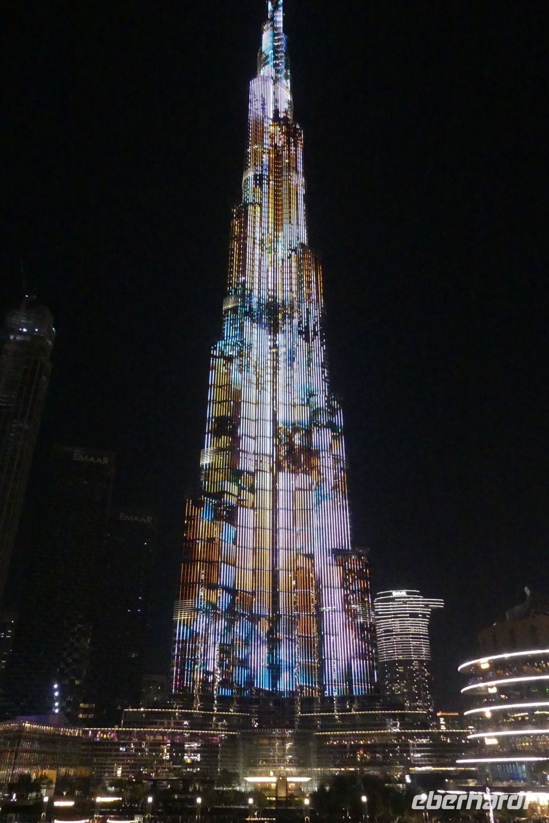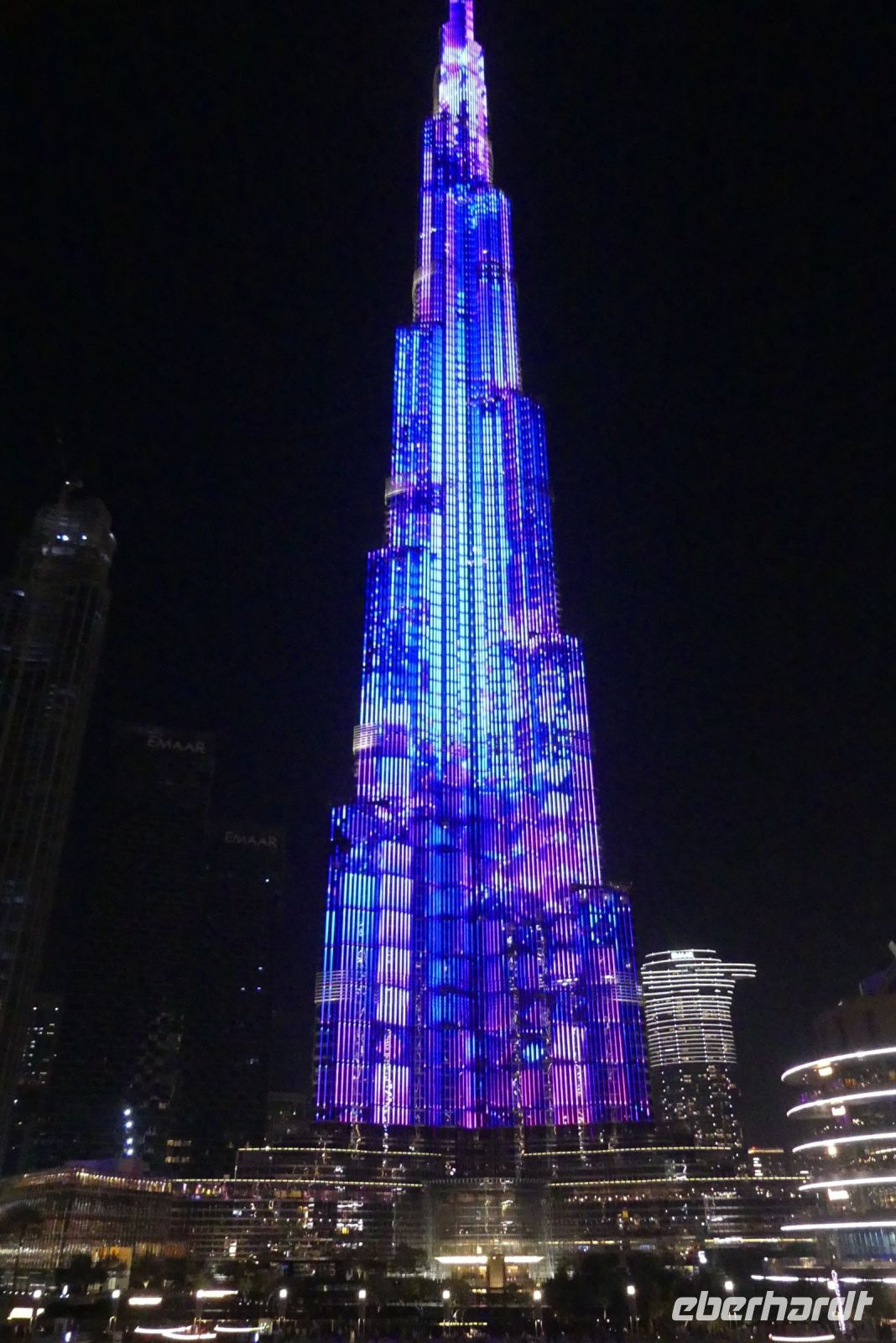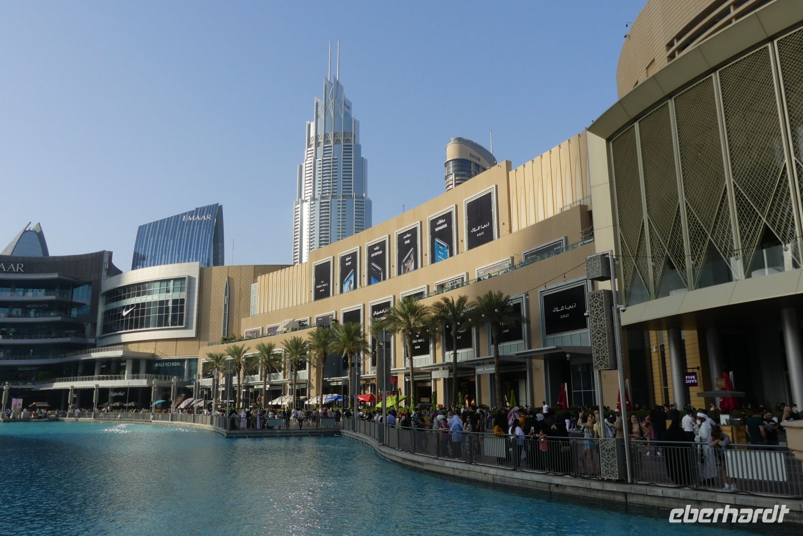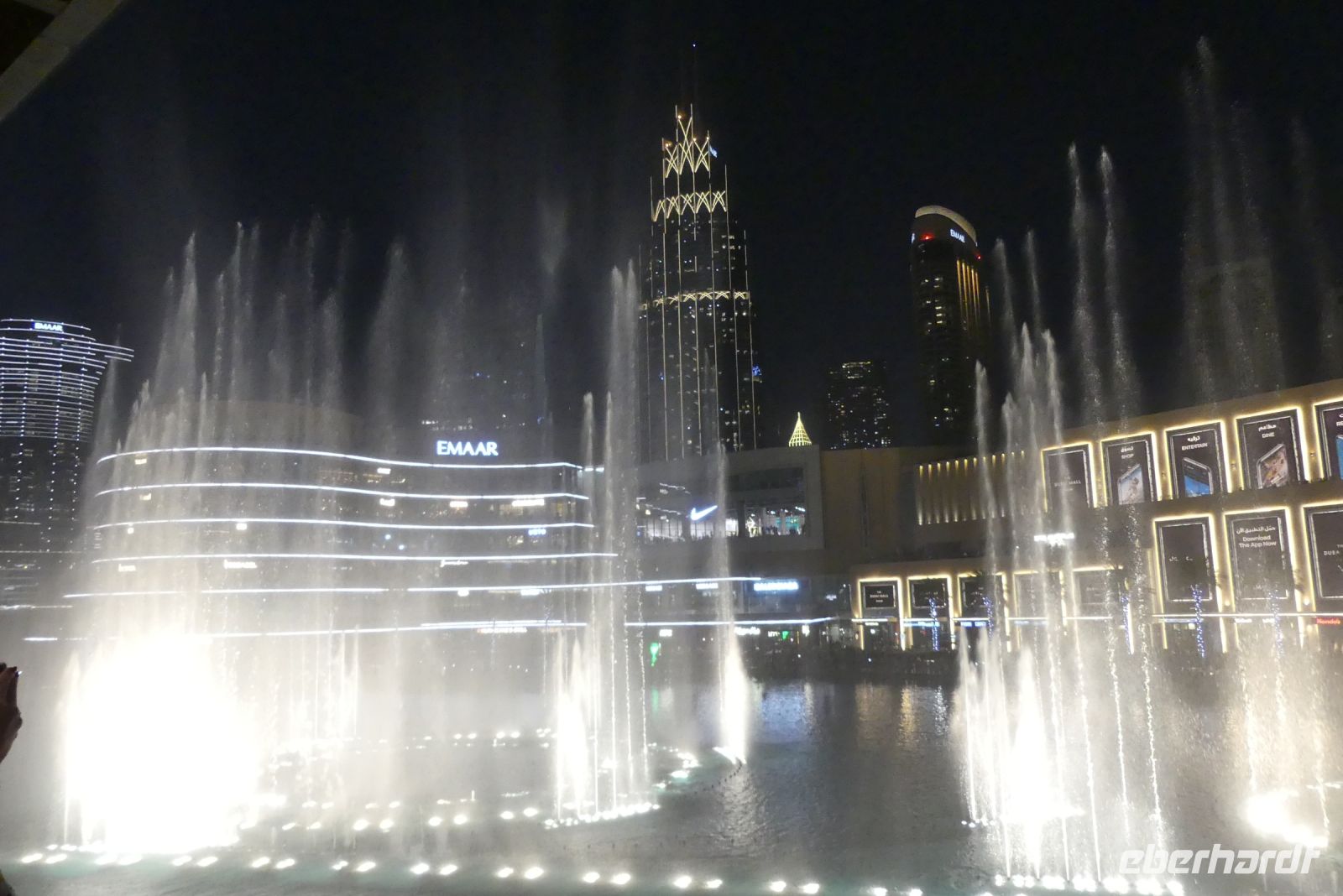 Bis zum Abendessen bleibt noch etwas Zeit, sich in der Mall oder im Umfeld des Burj Khalifa umzusehen. Zum Abendessen sind wir zu Gast in unserem Eberhardt „Stammlokal“, einem libanesischen Restaurant auf der Terrasse des Souk al Bahar gegenüber des Burj Khalifa. Wir genießen ein reichhaltiges libanesisches Tischbuffet in drei Gängen, begleitet von Wasserspielen mit Musik („Dubai Fountain“) vor der Kulisse des Burj Khalifa.