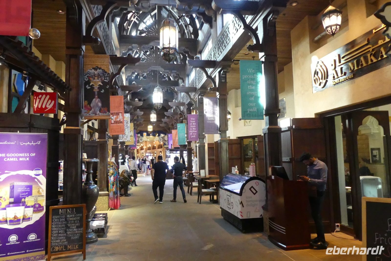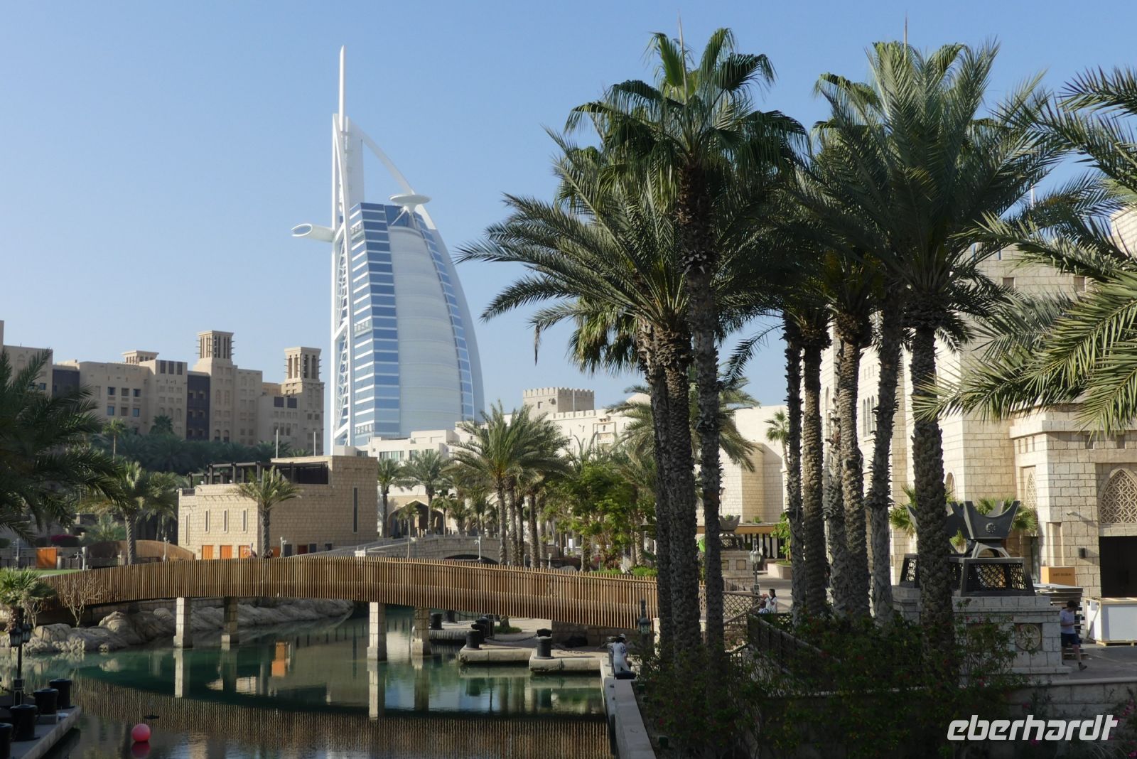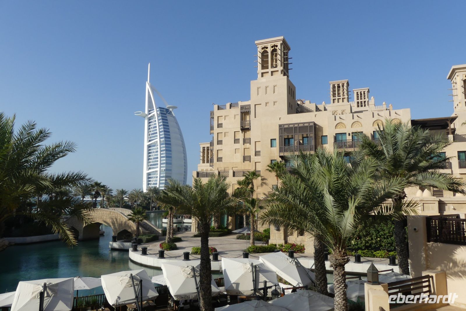 Für den Abend haben wir ein Abendessen im Atlantis Hotel auf der Palminsel Jumairah geplant. Wir verbinden das mit einem Abstecher vor dem Abendessen in den Stadtteil Jumairah am Ufer des Arabischen Golfs, um uns den Souk Madinat Jumeirah anzusehen. Das Viertel wird auch gern als „Kleinvenedig“ bezeichnet, was ziemlich treffend den Charakter dieses in der traditionellen Windtturmarchitektur errichteten Quartiers bezeichnet. Ein beliebtes Fotomotiv ist der Blick auf das Luxushotel Burj Al Arab.