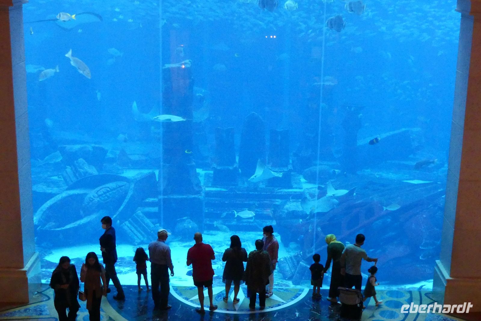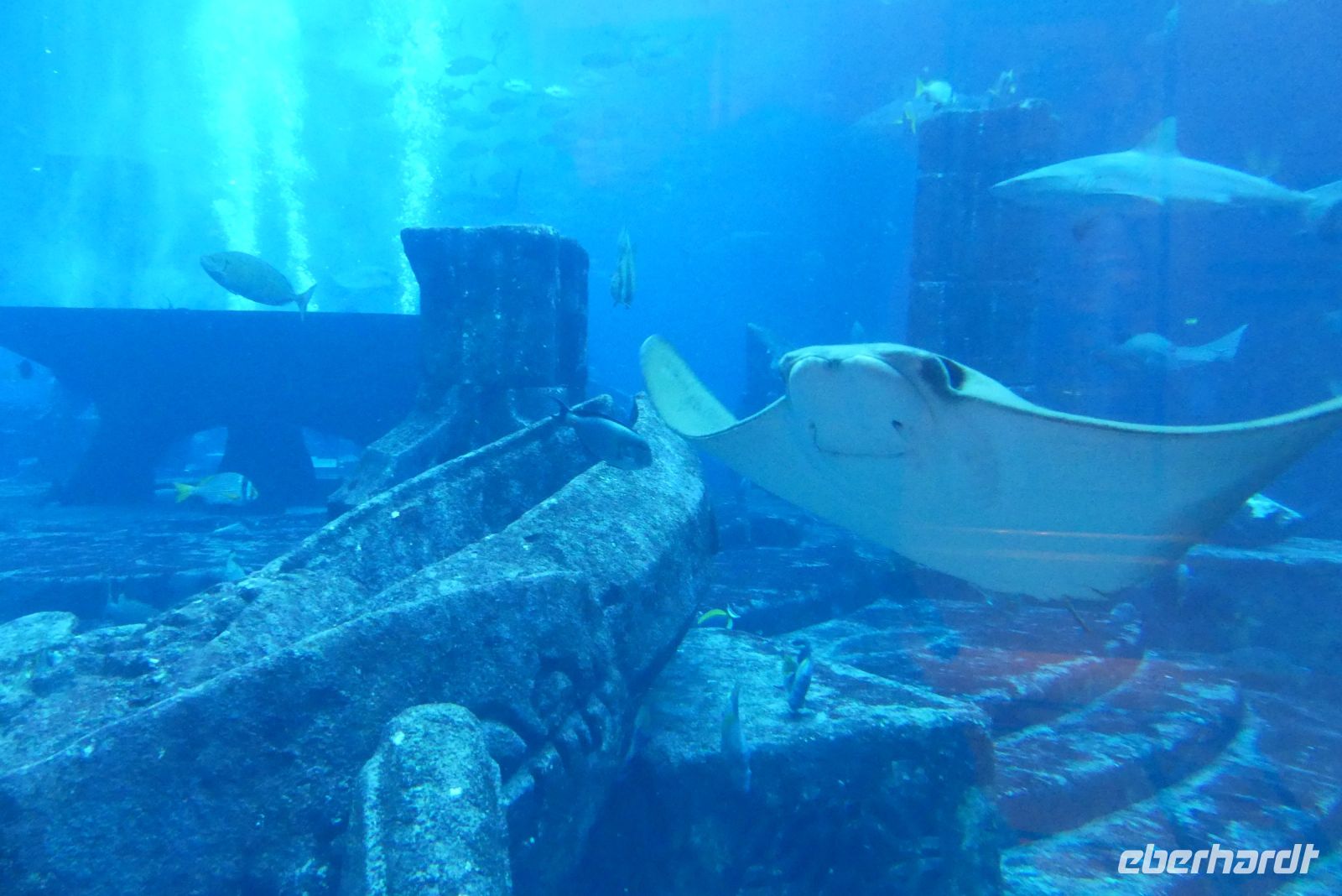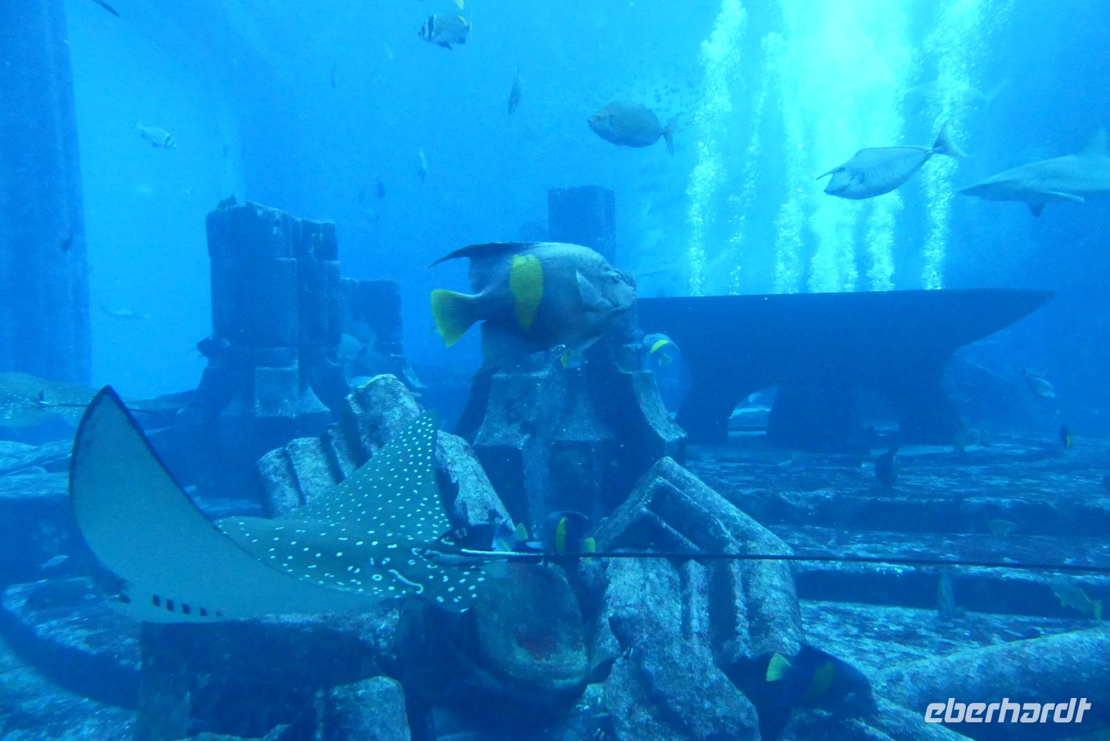 Für die letzten Kilometer zum Atlantis Hotel steigen wir am Palmenstamm vom Bus auf die Monorailbahn um. Während der Fahrt haben wir einen guten Ausblick auf Form und Bebauung der Palminsel. Nach einer kurzweiligen Fahrt erreichen wir die Endhaltestelle auf dem äußeren Ring der Palme und begeben uns in die Einkaufspassage des Atlantis Hotels. Am Aquarium bekommen wir Zutritt, weil wir eine Buchung für das Abendessen vorweisen können. Das Hotel wurde nach der sagenumwobenen versunkenen Stadt Atlantis benannt. Auch das riesige Aquarium greift dieses Thema auf, indem es einen versunkenen Thron, antike Säulen und andere Symbole einer antiken Stadt integriert.