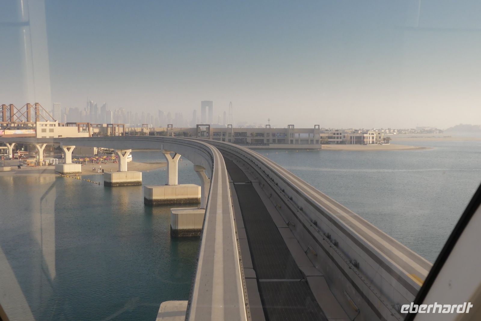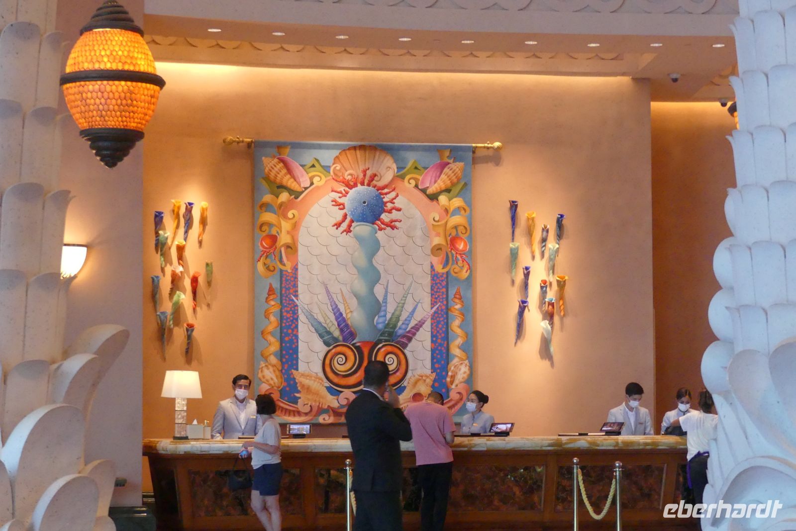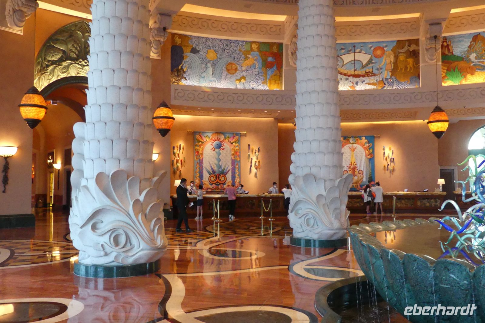 Für die letzten Kilometer zum Atlantis Hotel steigen wir am Palmenstamm vom Bus auf die Monorailbahn um. Während der Fahrt haben wir einen guten Ausblick auf Form und Bebauung der Palminsel. Nach einer kurzweiligen Fahrt erreichen wir die Endhaltestelle auf dem äußeren Ring der Palme und begeben uns in die Einkaufspassage des Atlantis Hotels. Am Aquarium bekommen wir Zutritt, weil wir eine Buchung für das Abendessen vorweisen können. Das Hotel wurde nach der sagenumwobenen versunkenen Stadt Atlantis benannt. Auch das riesige Aquarium greift dieses Thema auf, indem es einen versunkenen Thron, antike Säulen und andere Symbole einer antiken Stadt integriert.