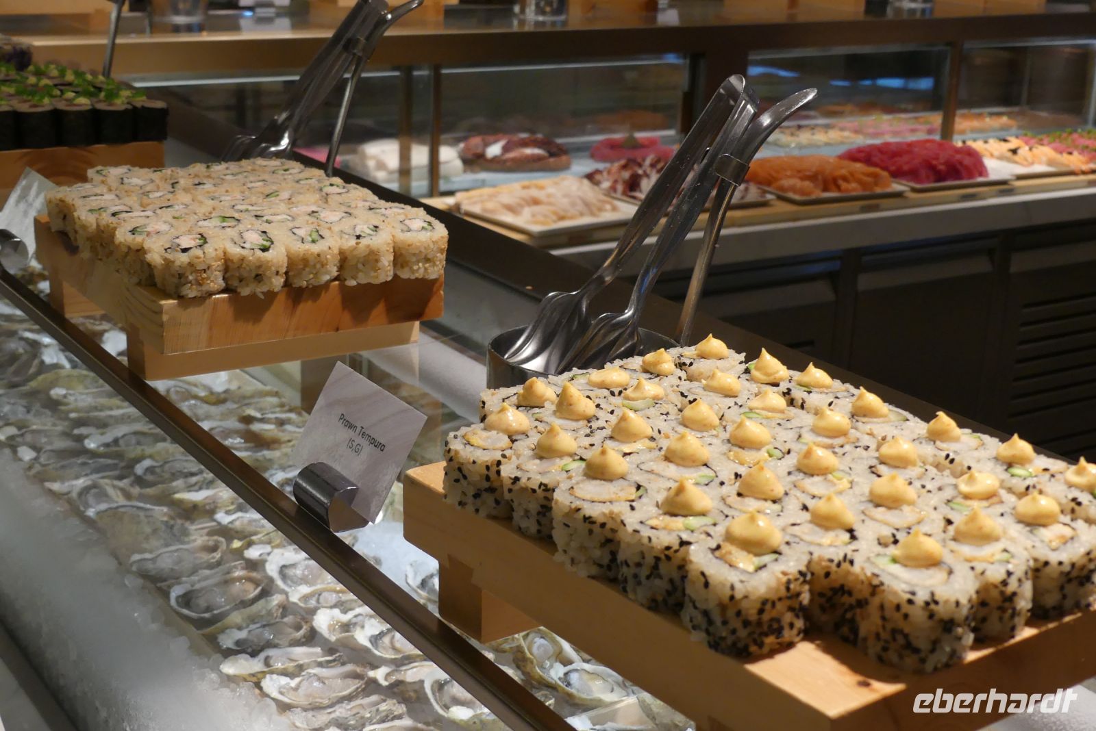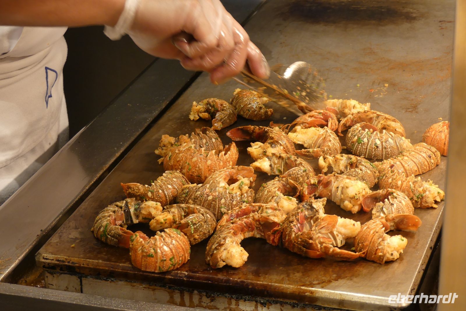 Ebenso ist der Lobbybereich des Hotels sehr sehenswert gestaltet. Beim Blick auf Skulpturen und handgemalte Wand- und Deckengemälde taucht man gewissermaßen in die Unterwasserwelt ein. Eine besondere Augenweite ist ein zehn Meter hohes Kunstwerk von Dale Chihuly in der Mitte der Lobby. Es besteht aus 3.000 einzelnen farbigen und verschnörkelten Glaskörpern, welche Wasser und Feuer symbolisieren. Ibrahim meint, es soll 15 Mio Dollar gekostet haben. Das Motiv der sagenumwobenen, versunken geglaubten Stadt Atlantis setzt sich im gesamten Design des Hotels fort. Schließlich kommen wir zu unserem Abendessen im Restaurant „Saffron“. Es ist Meeresfrüchteabend angesagt. Darüber hinaus gibt es ein vielfältiges Angebot, so dass für jeden etwas dabei ist. Wir sitzen bei milden Temperaturen draußen auf der Terrasse und genießen das außerordentlich schmackhafte Essen. Inzwischen erreichen Ibrahim die Testergebnisse – zum Glück sind alle PCR Test negativ :-)