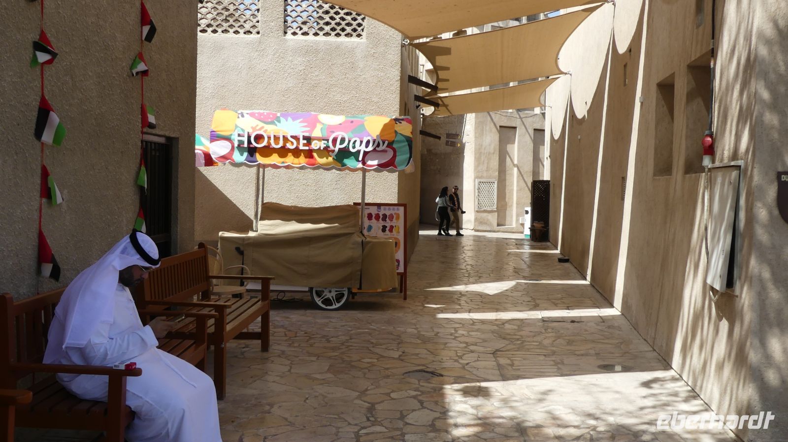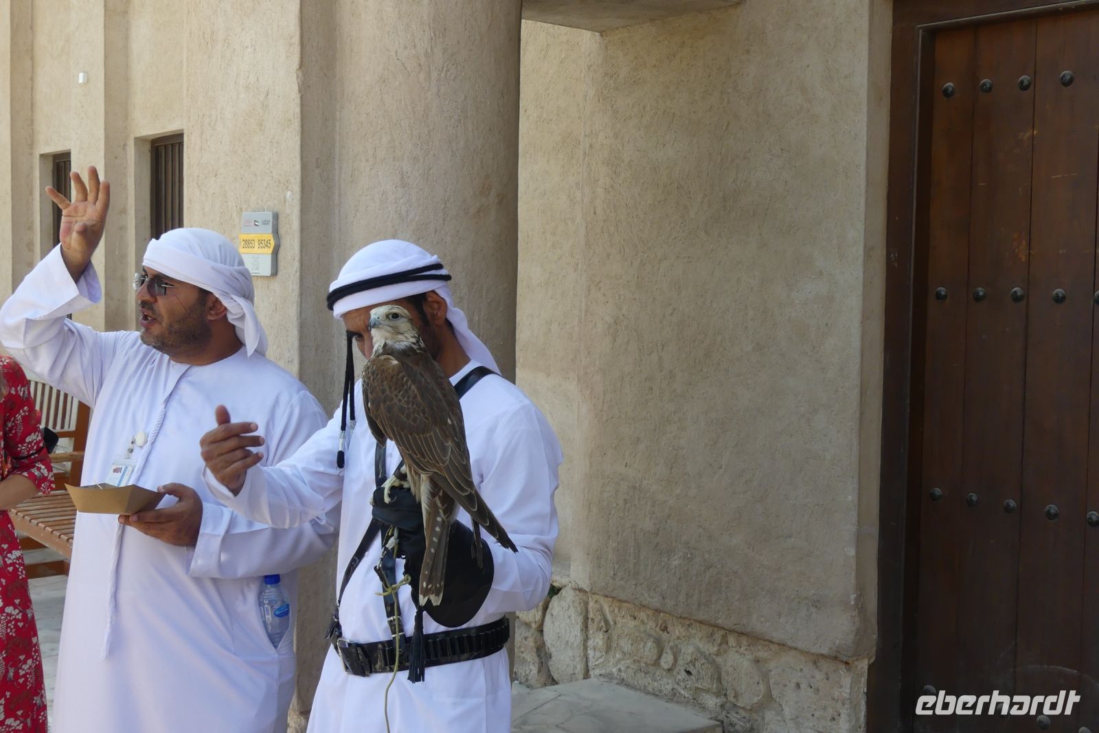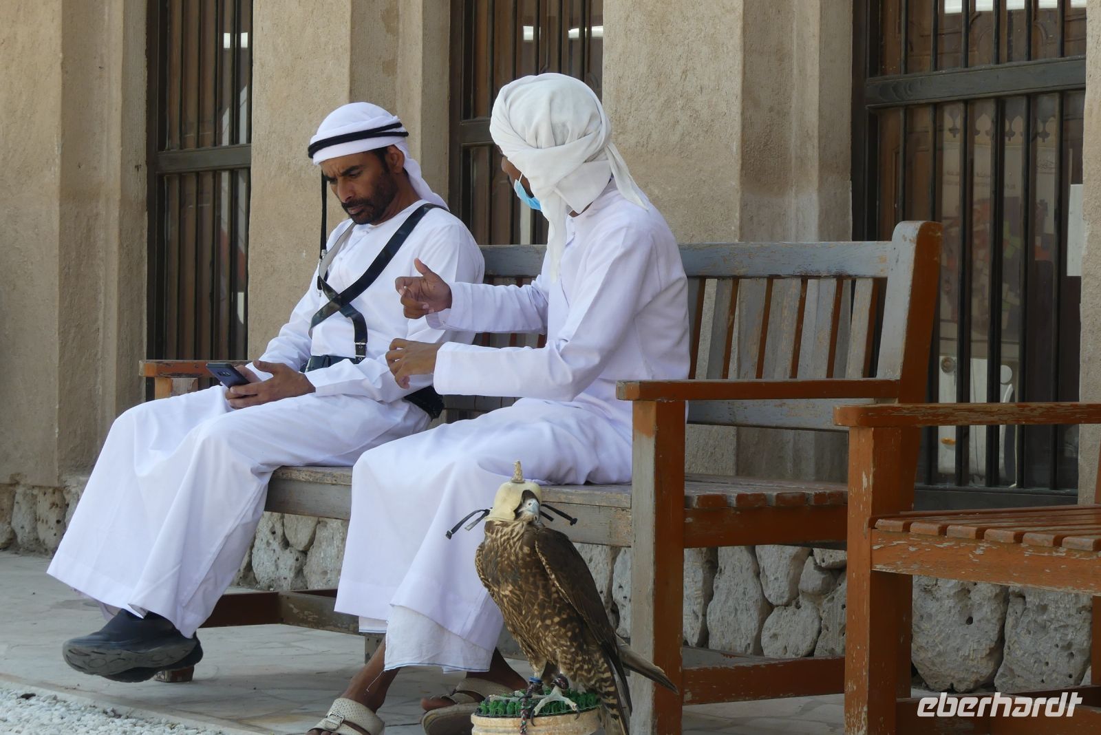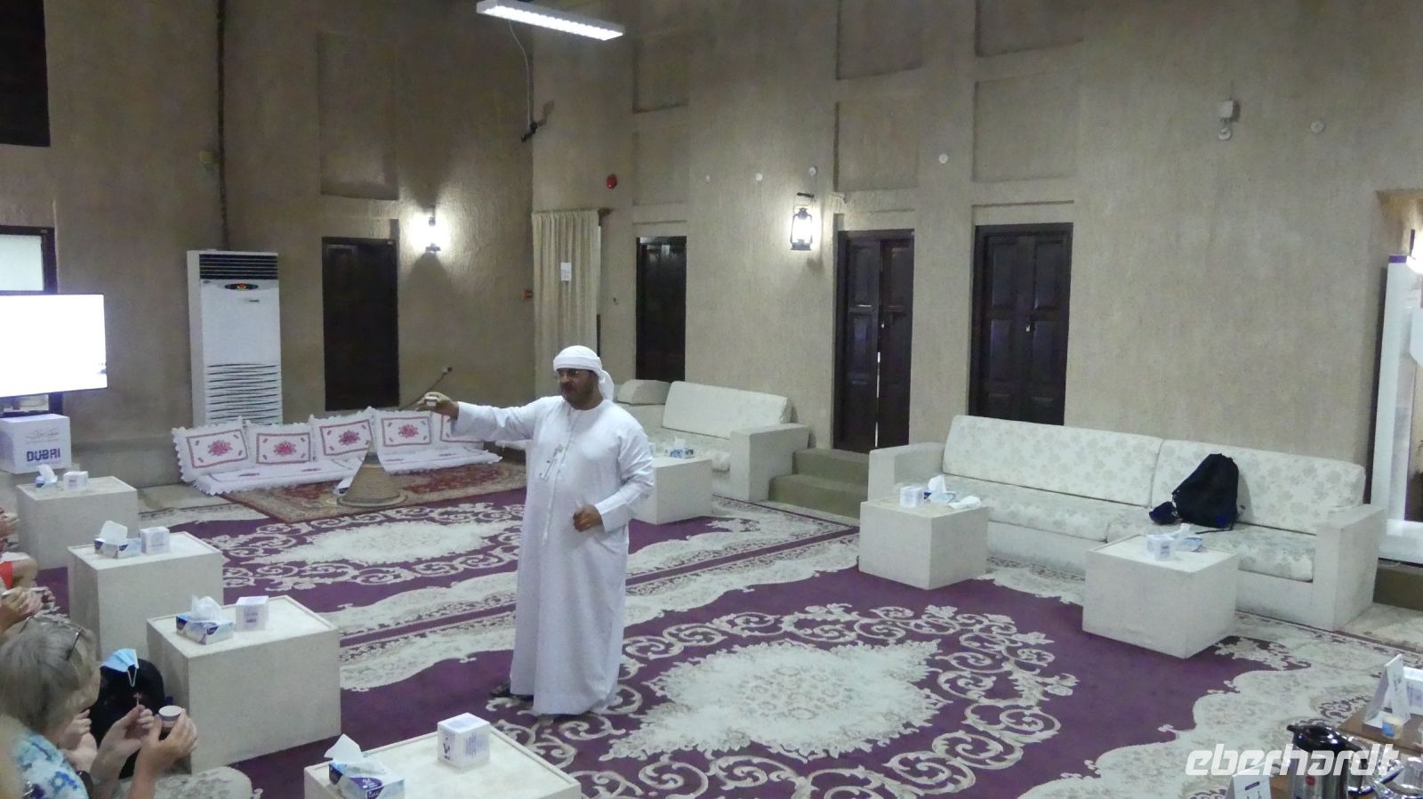 Am Morgen fahren wir noch einmal die Stadtautobahn Richtung Creek. Unterwegs gibt es die wichtigsten Informationen zur Stadtgeschichte, damit wir die geplanten Besichtigungen historisch besser einordnen können. Am Creek ist in den letzten Jahren mit „Al Seef“ eine neue Uferpromenade entstanden. Wo einst Fischer und Perlentauscher ihre Hütten hatten, ist diese neue Promenade errichtet wurden, die den historischen Charakter aufgreift und mit der Moderne verbindet. Es gibt viele Gebäude im Stile der alten Windturmarchitektur. In ihnen befinden sich Geschäfte, Cafés, Restaurants…und eine Smart Polizeistation (SPS), die wir uns von Innen ansehen dürfen und Fotos mit den Polizisten machen können. Al Seef ist Startpunkt unseres Stadtrundganges. Nebenan im historischen Bastakiya-Viertel nehmen wir Platz in einem traditionellen Haus, wo uns Ibrahim bei arabischem Kaffee mit Datteln über die orientalische Kaffeetradition informiert. In einem anderen Gebäude des Bastakiya-Viertels erhalten wir eine Vorstellung von Raumaufteilung und Wohnungseinrichtung in früheren Zeiten. An anderer Stelle ziehen zwei Emiratis mit ihren Falken ihre Aufmerksamkeit auf sich. Gleich daneben gibt es frittierte Teigbällchen mit Sesam zum Verkosten. Wir spazieren weiter am Gericht vorbei entlang des Creeks zum Textilsouk wo wir eine Anlagestelle für Wassertaxis erreichen. Wir fahren mit einer Abra, so werden die Wassertaxis genannt, eine Schleife auf dem Dubai Creek hoch bis zur Bank of Dubai (das Gebäude mit der gewölbten Fassade)
