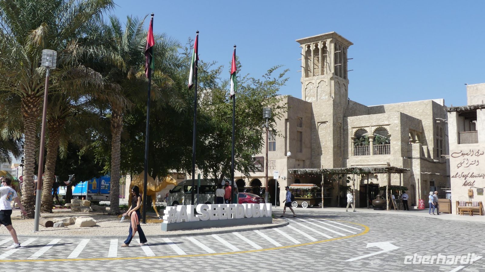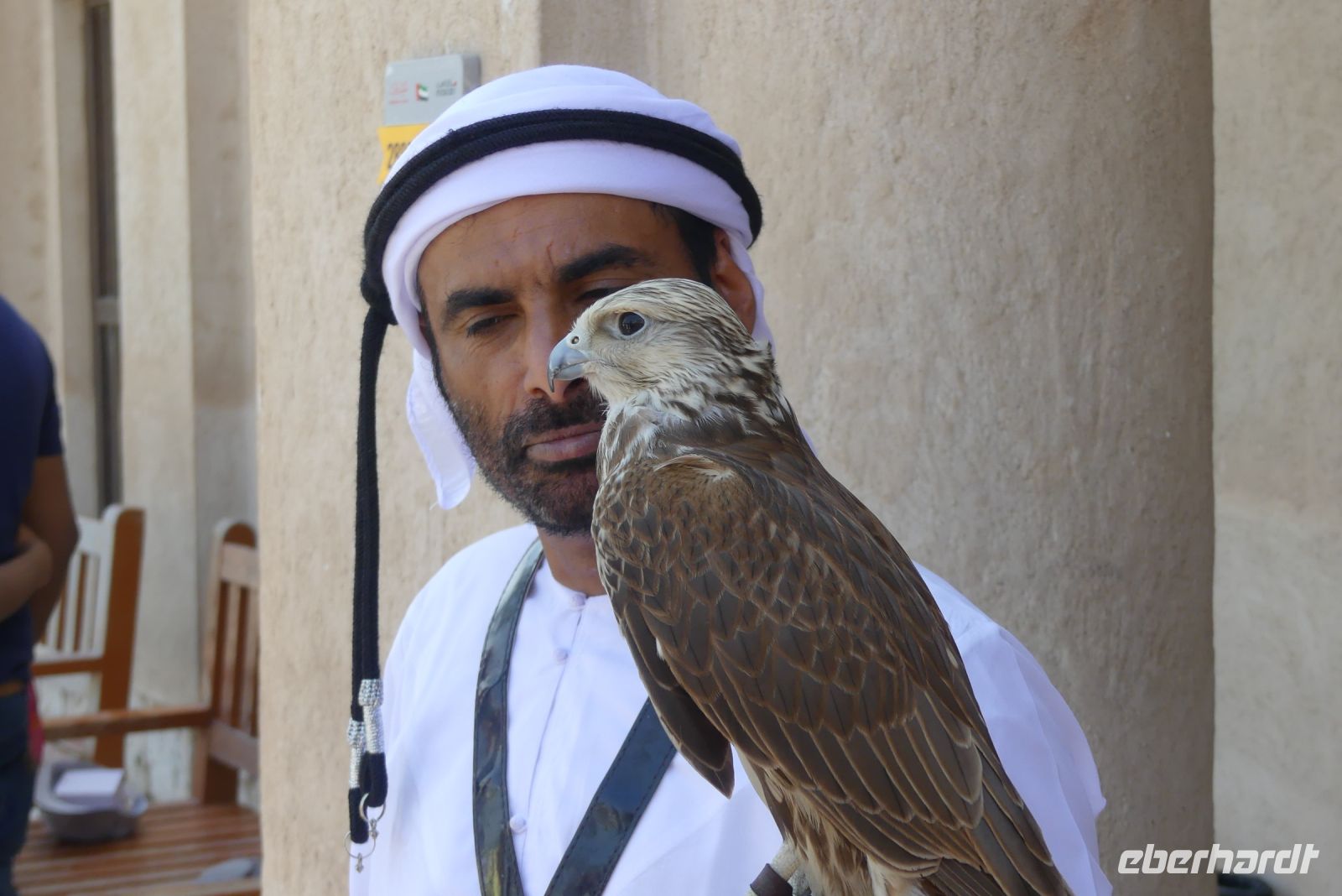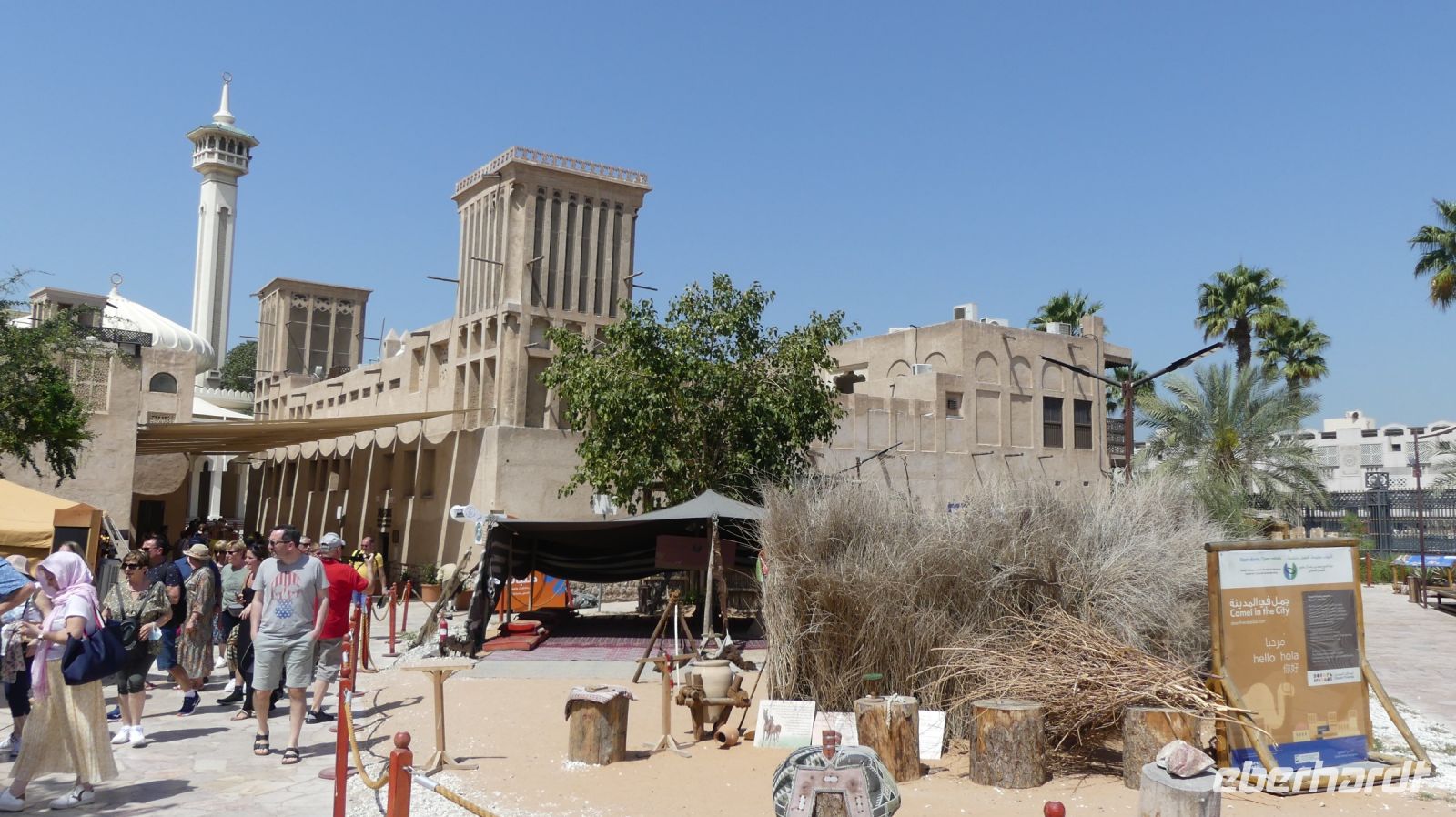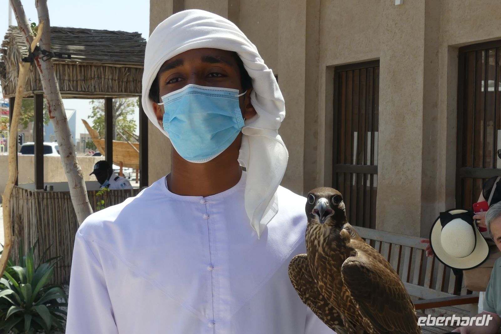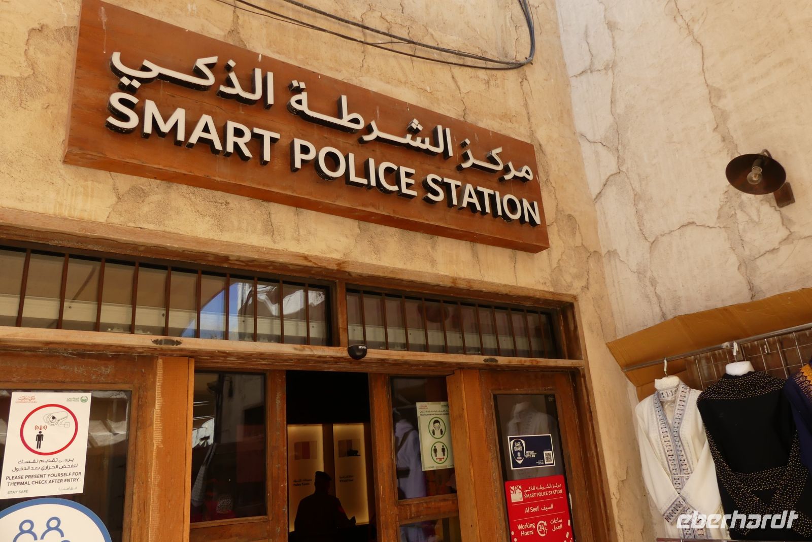 Am Morgen fahren wir noch einmal die Stadtautobahn Richtung Creek. Unterwegs gibt es die wichtigsten Informationen zur Stadtgeschichte, damit wir die geplanten Besichtigungen historisch besser einordnen können. Am Creek ist in den letzten Jahren mit „Al Seef“ eine neue Uferpromenade entstanden. Wo einst Fischer und Perlentauscher ihre Hütten hatten, ist diese neue Promenade errichtet wurden, die den historischen Charakter aufgreift und mit der Moderne verbindet. Es gibt viele Gebäude im Stile der alten Windturmarchitektur. In ihnen befinden sich Geschäfte, Cafés, Restaurants…und eine Smart Polizeistation (SPS), die wir uns von Innen ansehen dürfen und Fotos mit den Polizisten machen können. Al Seef ist Startpunkt unseres Stadtrundganges. Nebenan im historischen Bastakiya-Viertel nehmen wir Platz in einem traditionellen Haus, wo uns Ibrahim bei arabischem Kaffee mit Datteln über die orientalische Kaffeetradition informiert. In einem anderen Gebäude des Bastakiya-Viertels erhalten wir eine Vorstellung von Raumaufteilung und Wohnungseinrichtung in früheren Zeiten. An anderer Stelle ziehen zwei Emiratis mit ihren Falken ihre Aufmerksamkeit auf sich. Gleich daneben gibt es frittierte Teigbällchen mit Sesam zum Verkosten. Wir spazieren weiter am Gericht vorbei entlang des Creeks zum Textilsouk wo wir eine Anlagestelle für Wassertaxis erreichen. Wir fahren mit einer Abra, so werden die Wassertaxis genannt, eine Schleife auf dem Dubai Creek hoch bis zur Bank of Dubai (das Gebäude mit der gewölbten Fassade)