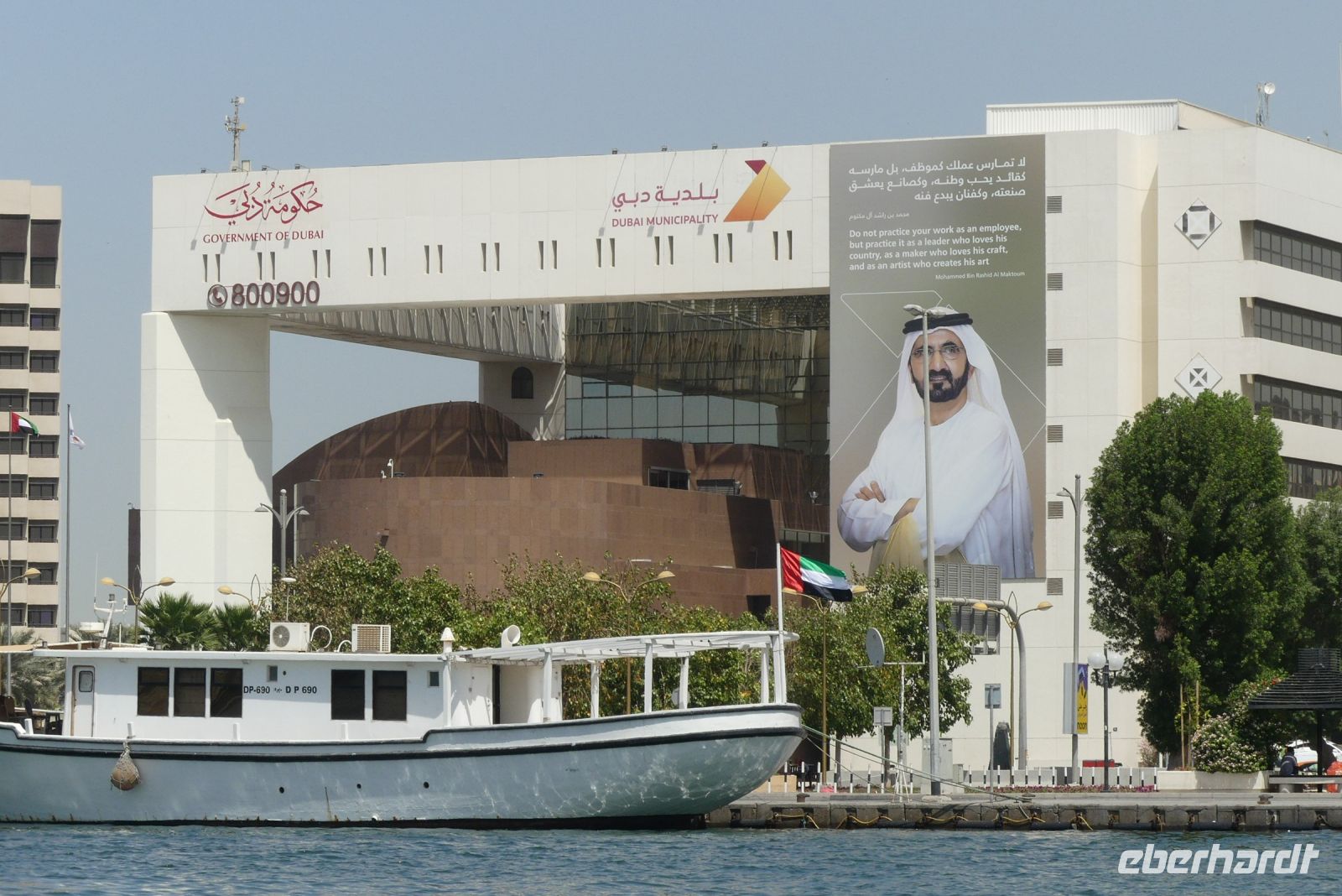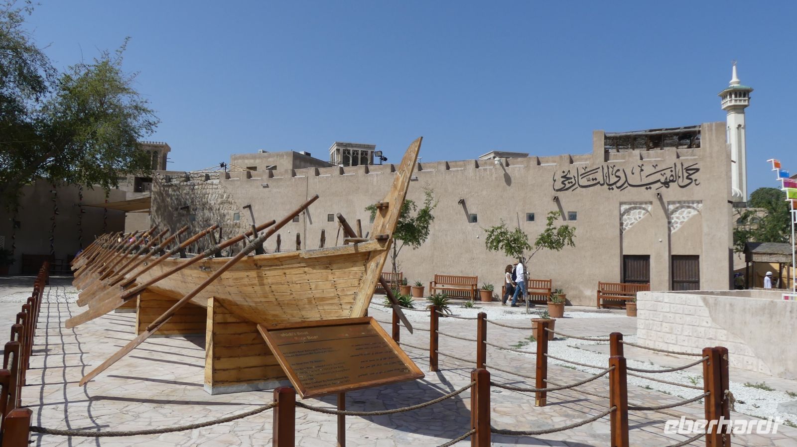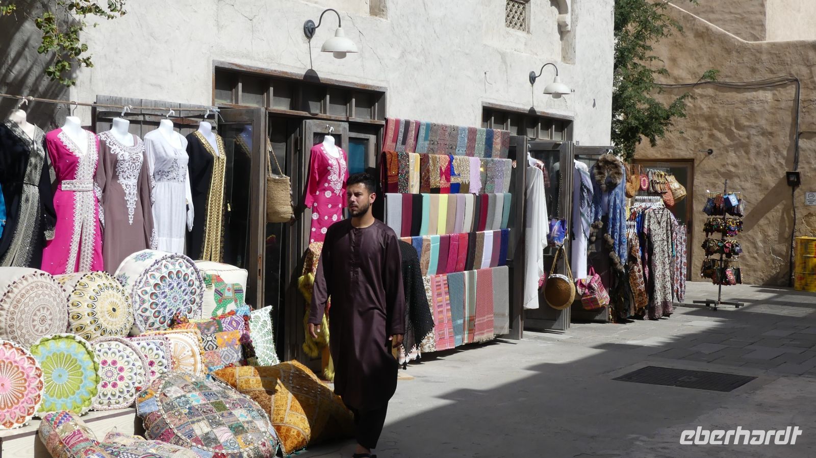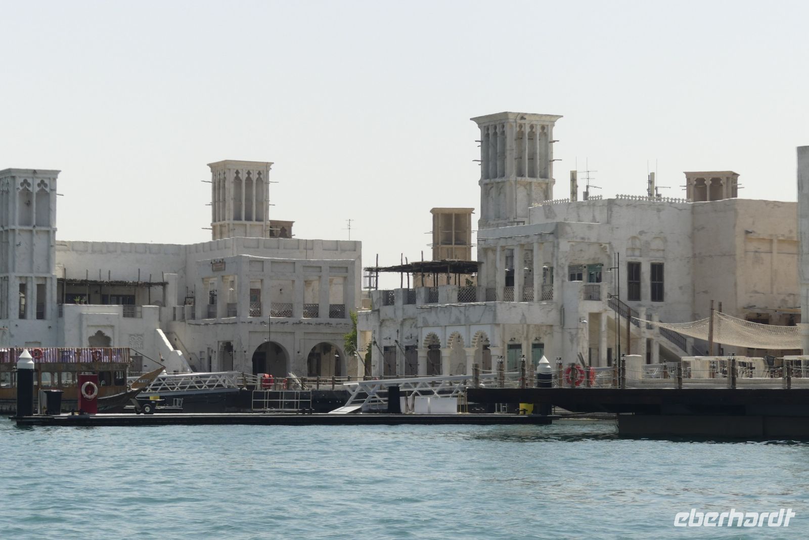 Am Morgen fahren wir noch einmal die Stadtautobahn Richtung Creek. Unterwegs gibt es die wichtigsten Informationen zur Stadtgeschichte, damit wir die geplanten Besichtigungen historisch besser einordnen können. Am Creek ist in den letzten Jahren mit „Al Seef“ eine neue Uferpromenade entstanden. Wo einst Fischer und Perlentauscher ihre Hütten hatten, ist diese neue Promenade errichtet wurden, die den historischen Charakter aufgreift und mit der Moderne verbindet. Es gibt viele Gebäude im Stile der alten Windturmarchitektur. In ihnen befinden sich Geschäfte, Cafés, Restaurants…und eine Smart Polizeistation (SPS), die wir uns von Innen ansehen dürfen und Fotos mit den Polizisten machen können. Al Seef ist Startpunkt unseres Stadtrundganges. Nebenan im historischen Bastakiya-Viertel nehmen wir Platz in einem traditionellen Haus, wo uns Ibrahim bei arabischem Kaffee mit Datteln über die orientalische Kaffeetradition informiert. In einem anderen Gebäude des Bastakiya-Viertels erhalten wir eine Vorstellung von Raumaufteilung und Wohnungseinrichtung in früheren Zeiten. An anderer Stelle ziehen zwei Emiratis mit ihren Falken ihre Aufmerksamkeit auf sich. Gleich daneben gibt es frittierte Teigbällchen mit Sesam zum Verkosten. Wir spazieren weiter am Gericht vorbei entlang des Creeks zum Textilsouk wo wir eine Anlagestelle für Wassertaxis erreichen. Wir fahren mit einer Abra, so werden die Wassertaxis genannt, eine Schleife auf dem Dubai Creek hoch bis zur Bank of Dubai (das Gebäude mit der gewölbten Fassade)
