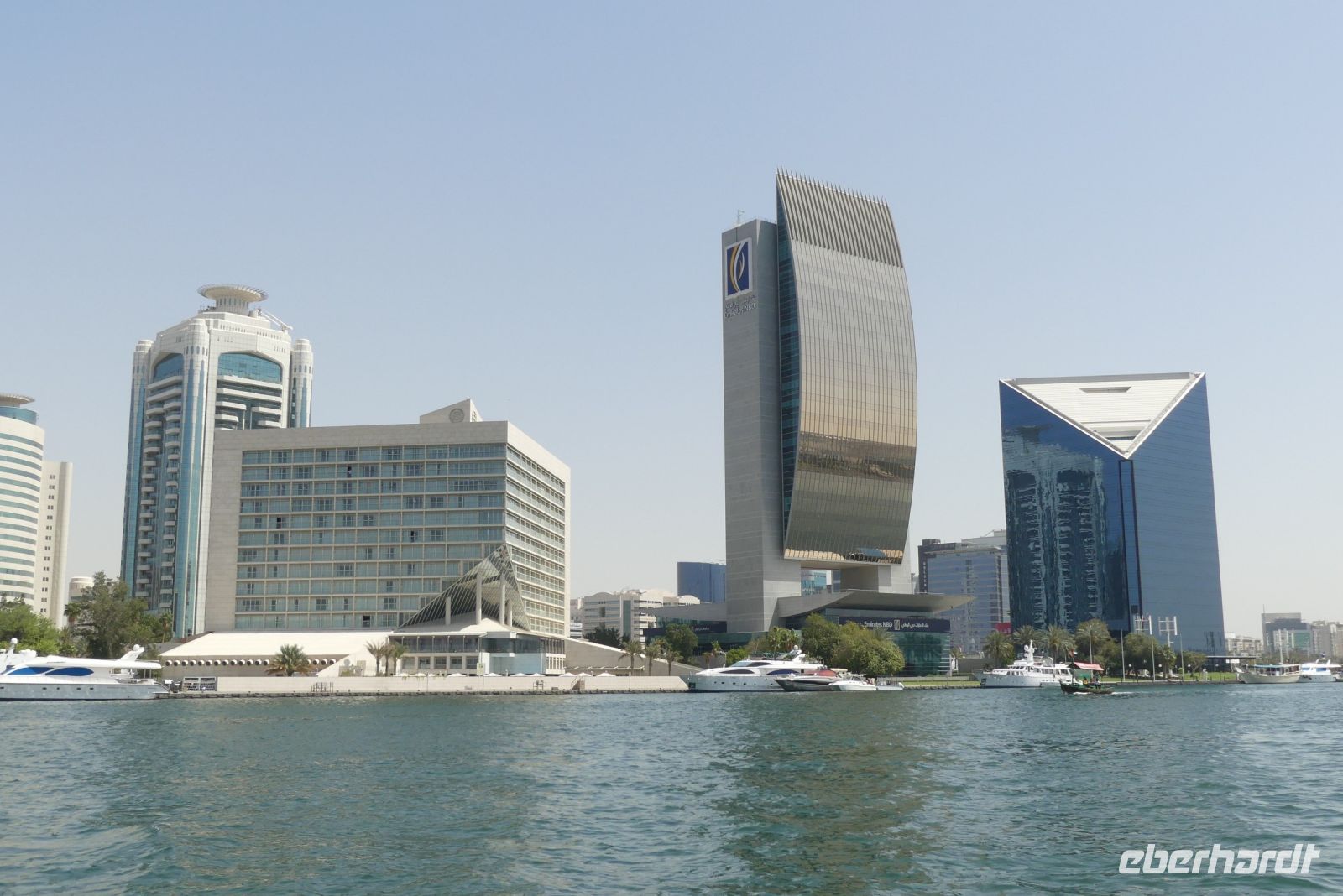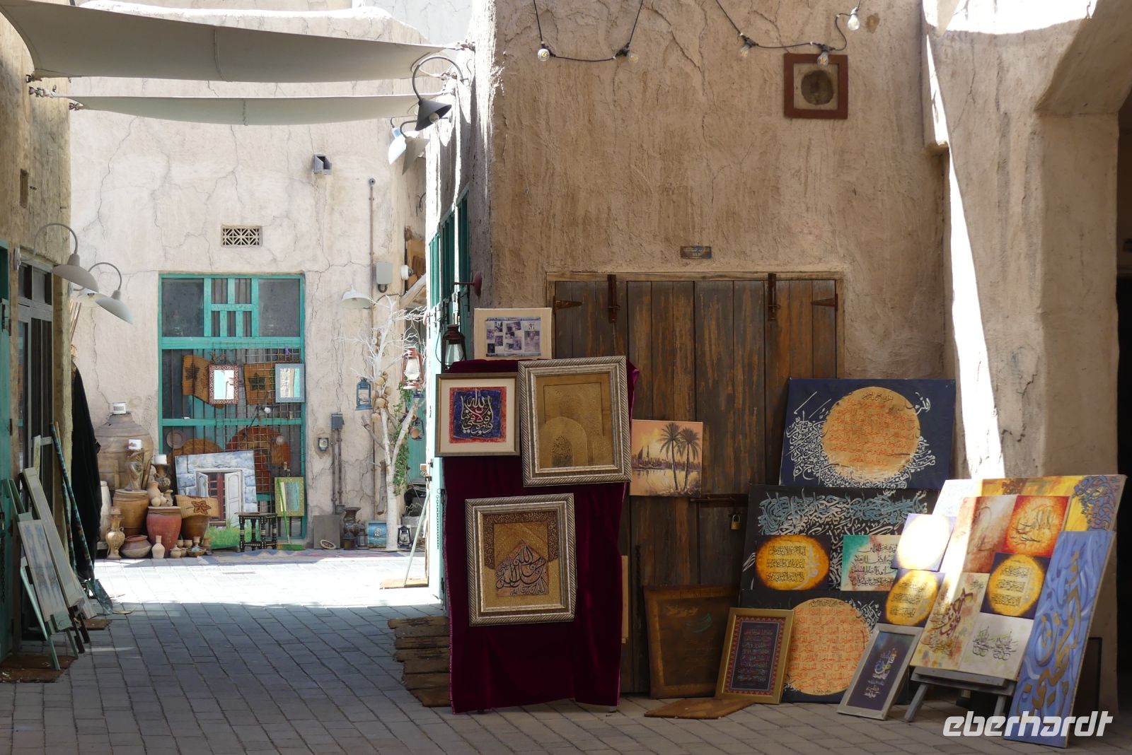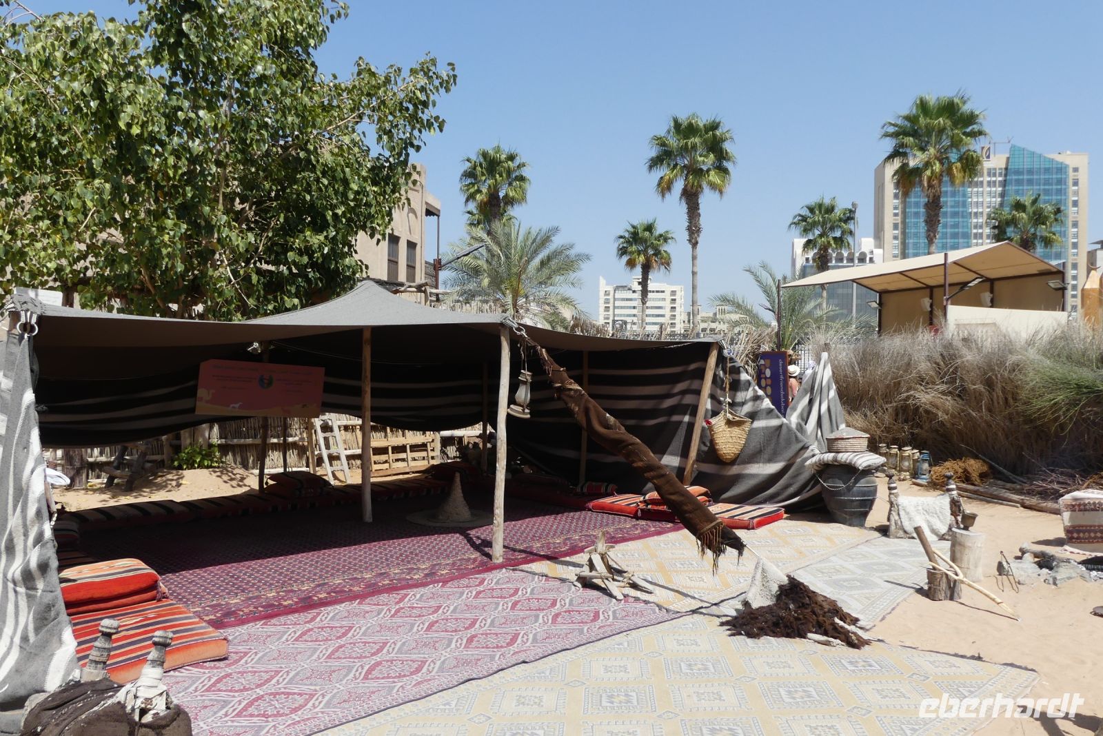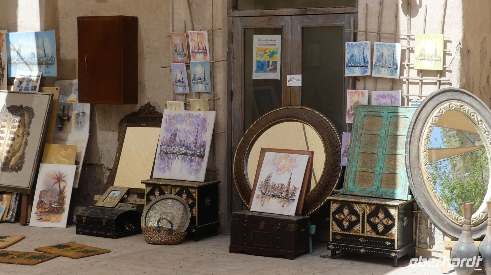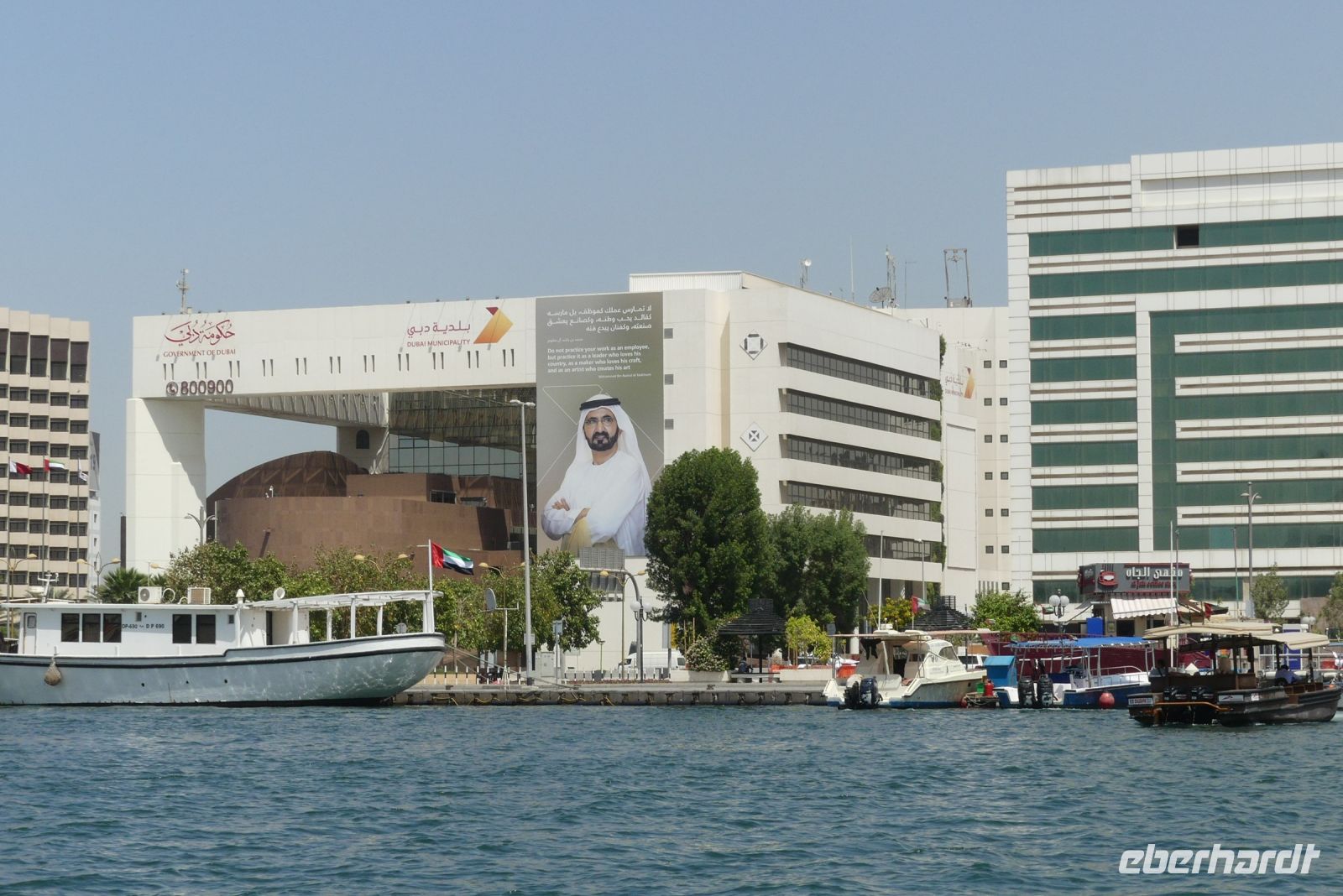 Am Morgen fahren wir noch einmal die Stadtautobahn Richtung Creek. Unterwegs gibt es die wichtigsten Informationen zur Stadtgeschichte, damit wir die geplanten Besichtigungen historisch besser einordnen können. Am Creek ist in den letzten Jahren mit „Al Seef“ eine neue Uferpromenade entstanden. Wo einst Fischer und Perlentauscher ihre Hütten hatten, ist diese neue Promenade errichtet wurden, die den historischen Charakter aufgreift und mit der Moderne verbindet. Es gibt viele Gebäude im Stile der alten Windturmarchitektur. In ihnen befinden sich Geschäfte, Cafés, Restaurants…und eine Smart Polizeistation (SPS), die wir uns von Innen ansehen dürfen und Fotos mit den Polizisten machen können. Al Seef ist Startpunkt unseres Stadtrundganges. Nebenan im historischen Bastakiya-Viertel nehmen wir Platz in einem traditionellen Haus, wo uns Ibrahim bei arabischem Kaffee mit Datteln über die orientalische Kaffeetradition informiert. In einem anderen Gebäude des Bastakiya-Viertels erhalten wir eine Vorstellung von Raumaufteilung und Wohnungseinrichtung in früheren Zeiten. An anderer Stelle ziehen zwei Emiratis mit ihren Falken ihre Aufmerksamkeit auf sich. Gleich daneben gibt es frittierte Teigbällchen mit Sesam zum Verkosten. Wir spazieren weiter am Gericht vorbei entlang des Creeks zum Textilsouk wo wir eine Anlagestelle für Wassertaxis erreichen. Wir fahren mit einer Abra, so werden die Wassertaxis genannt, eine Schleife auf dem Dubai Creek hoch bis zur Bank of Dubai (das Gebäude mit der gewölbten Fassade)