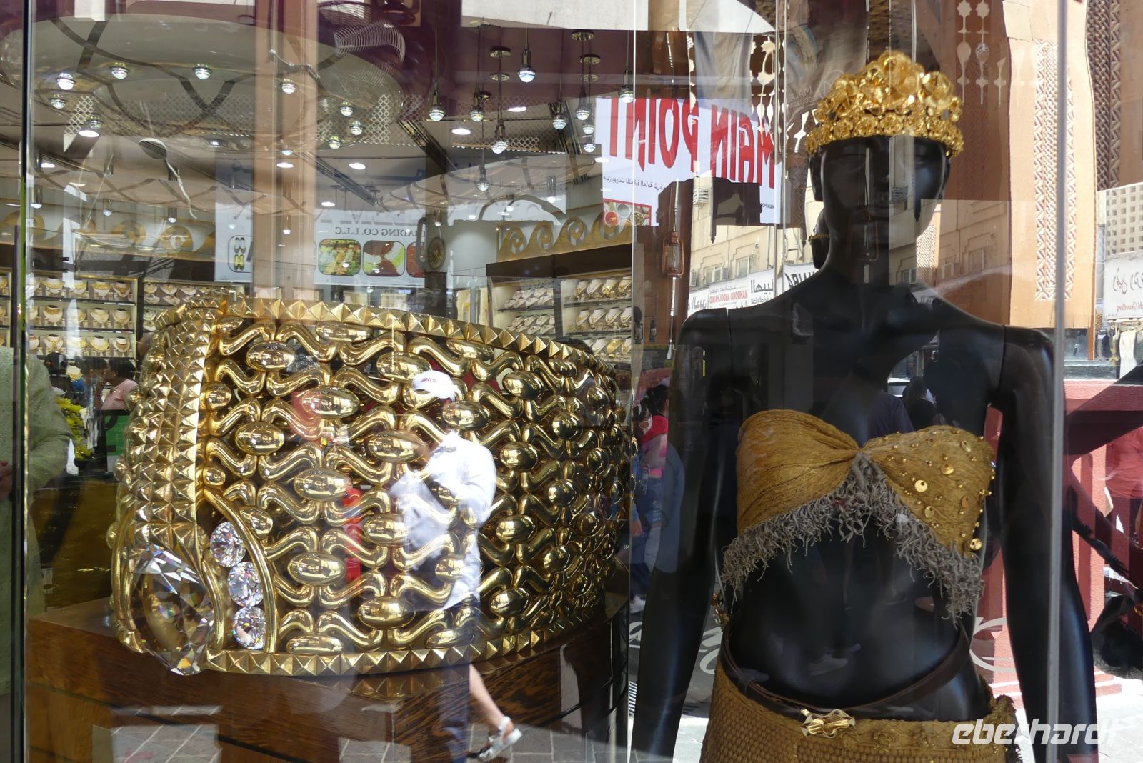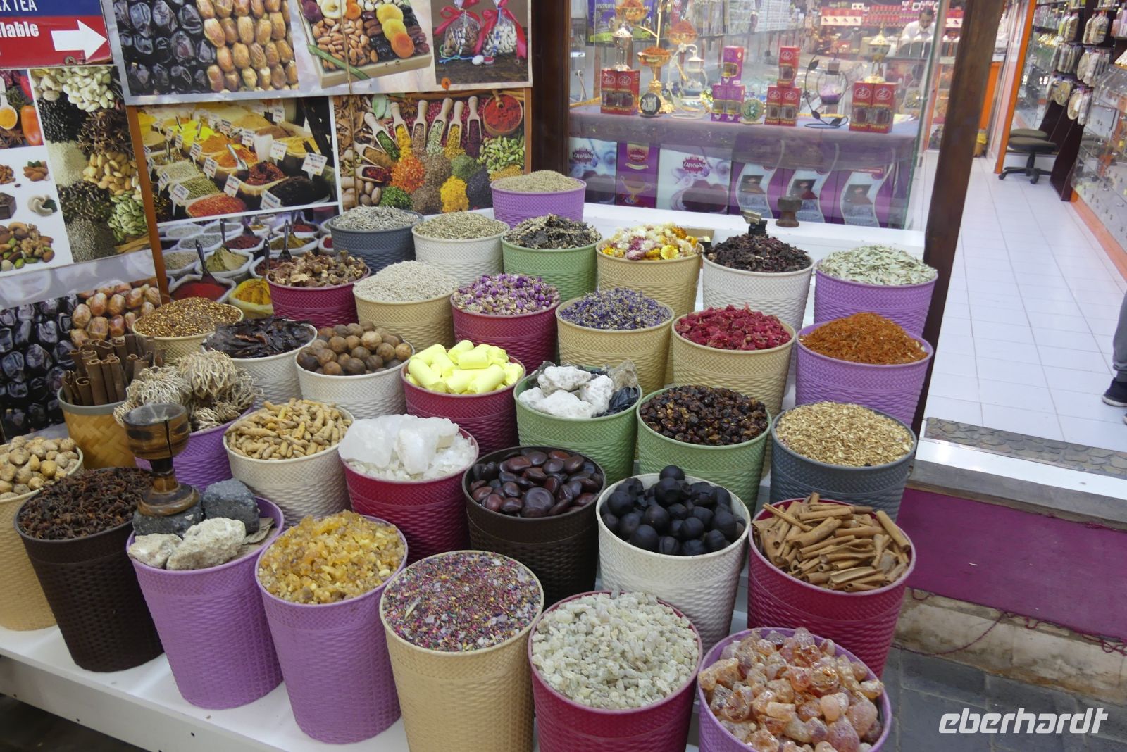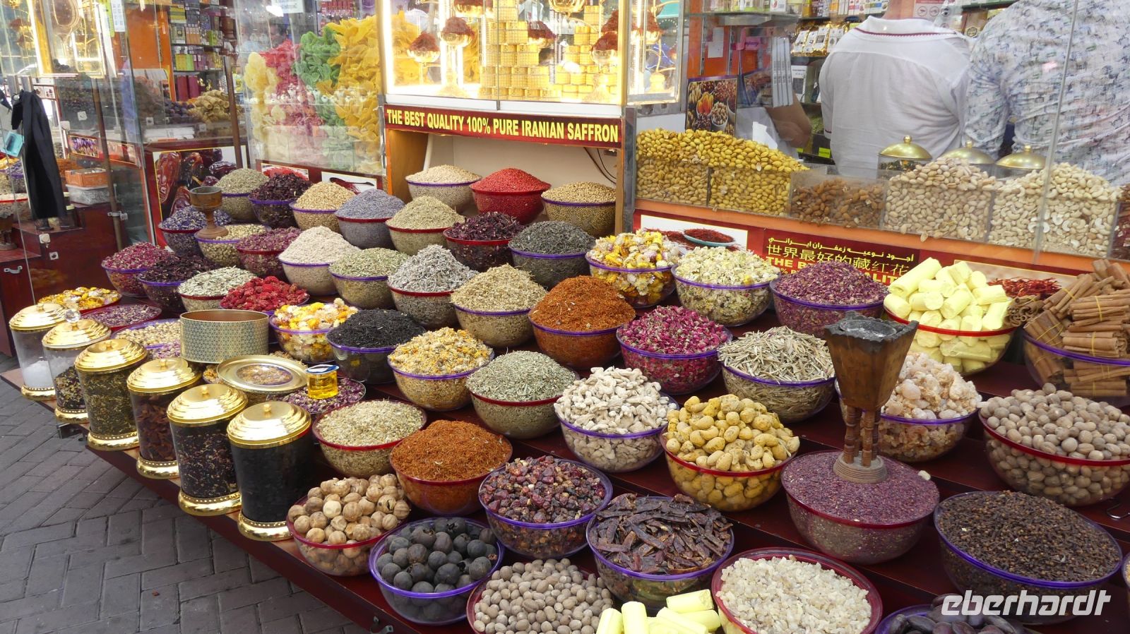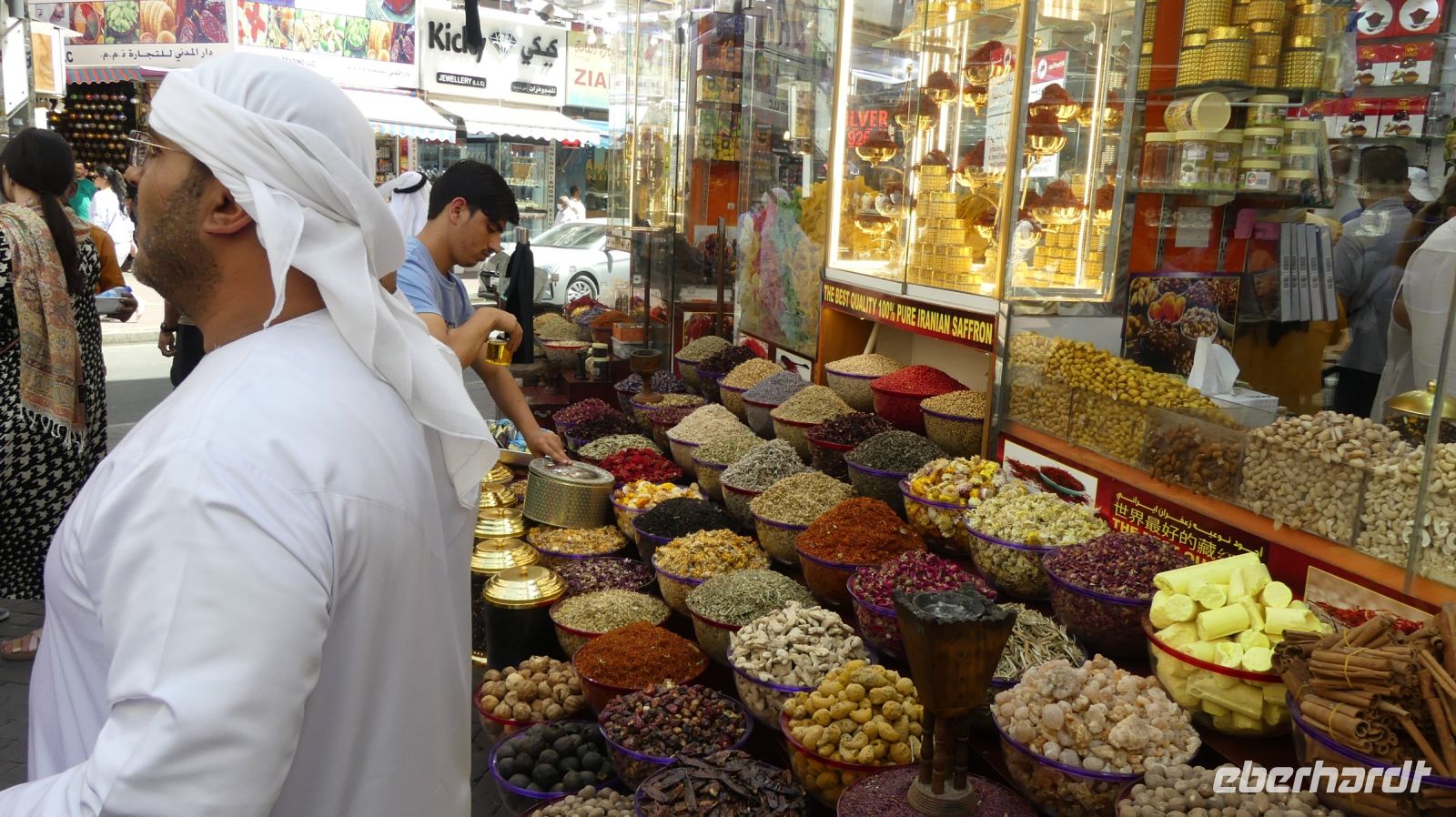 um letztendlich zum anderen Ufer mit dem Gewürz- und Goldsouk zu gelangen. Während einer reichlichen Stunde Freizeit kann eingekauft werden – Goldschmuck, Kleider, Safran, Vanille, Muskatnüsse etc… Inzwischen ist es Mittagszeit und das Thermometer erreicht 37 Grad. Aber morgen soll es einen kräftigen Temperaturrückgang mit Tageshöchstwerten von nur noch 23 Grad geben.