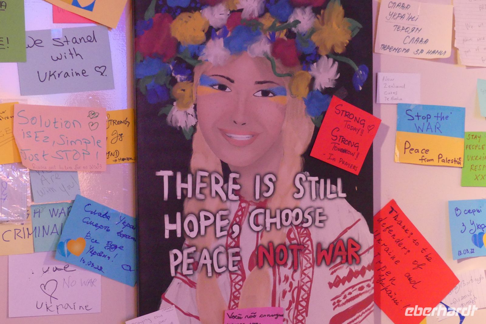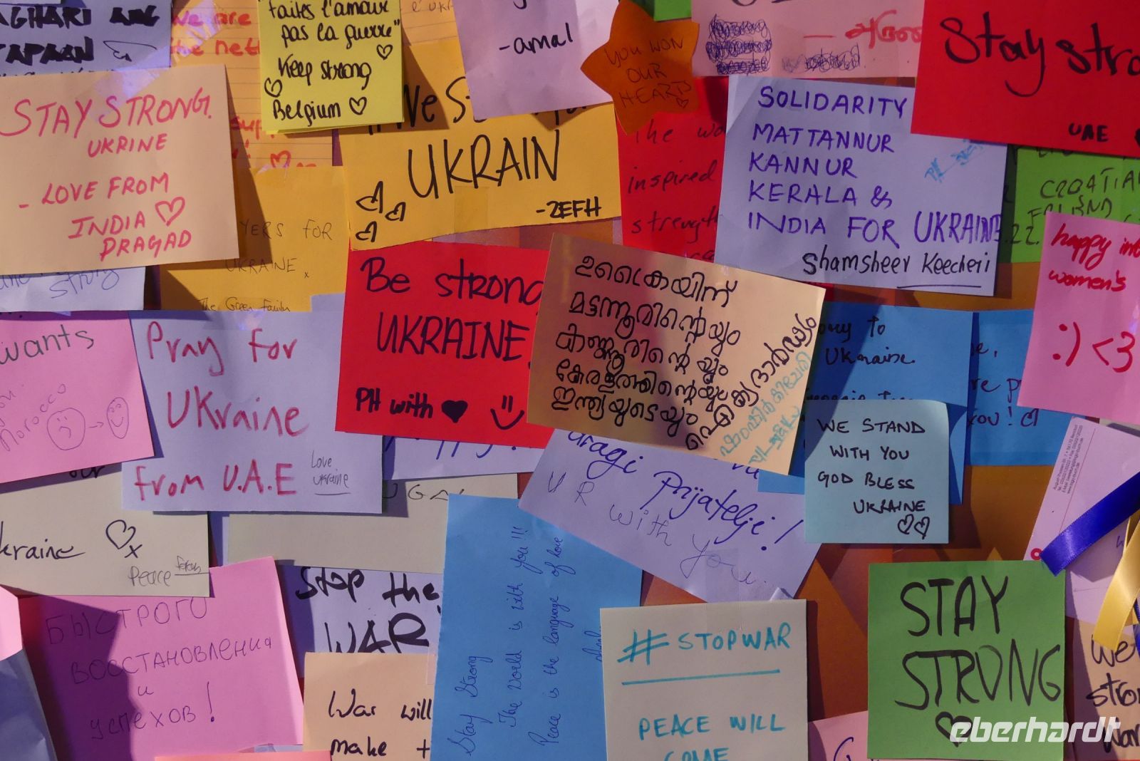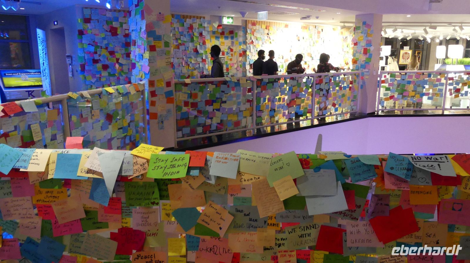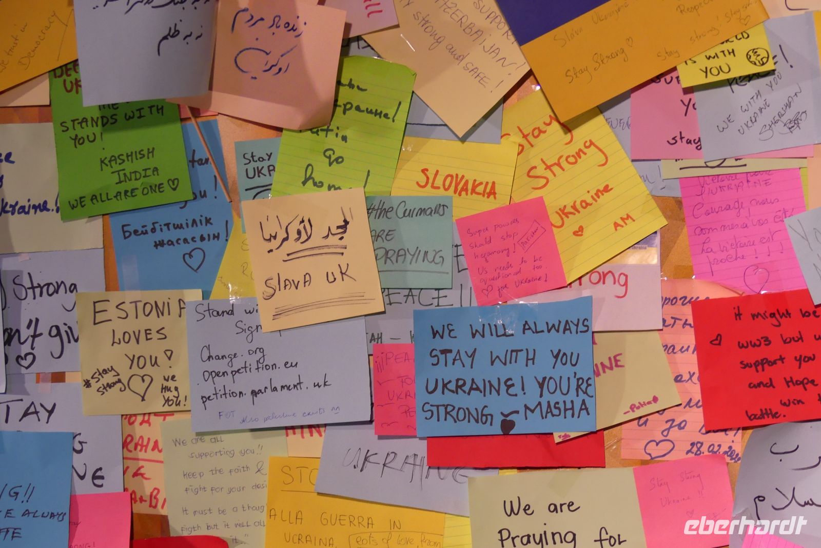 Zum Abschluss besuche ich den Pavillon der Ukraine. Es ist überwältigend zu sehen, wie zehntausende von Solidaritätsbekundungen, welche auf verschiedenen farbigen Zetteln niedergeschrieben sind, Wände, Treppengeländer und andere freie Flächen bedecken.