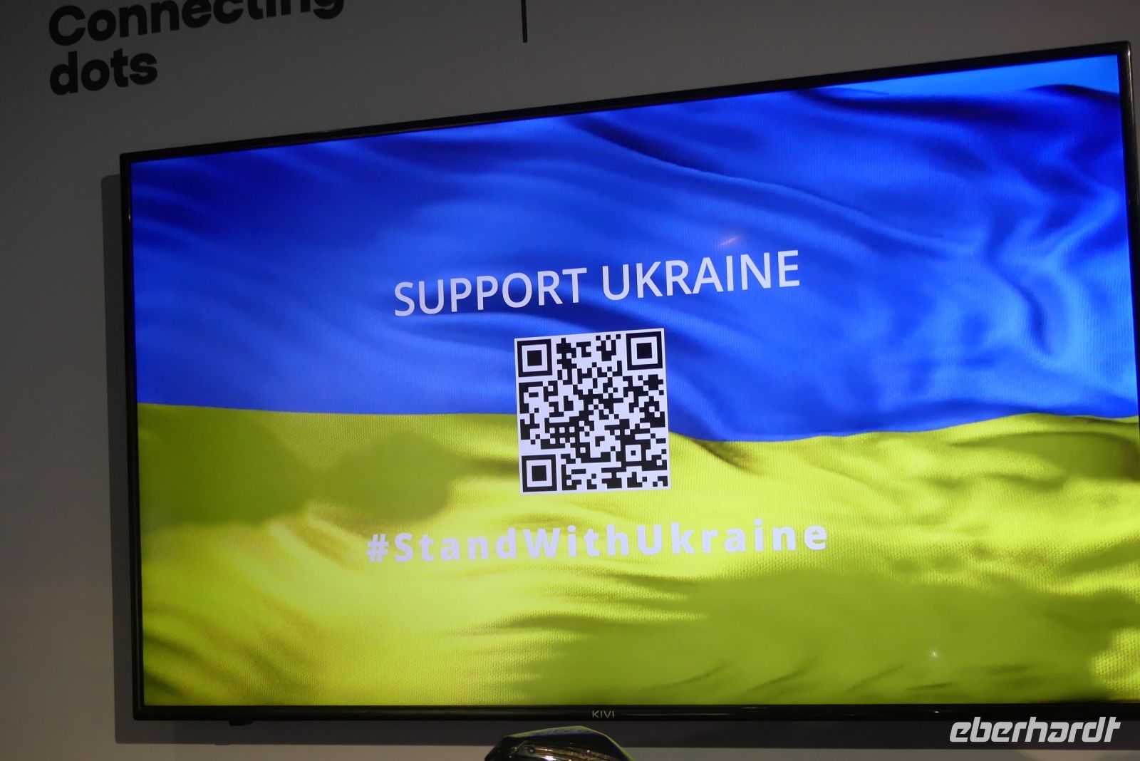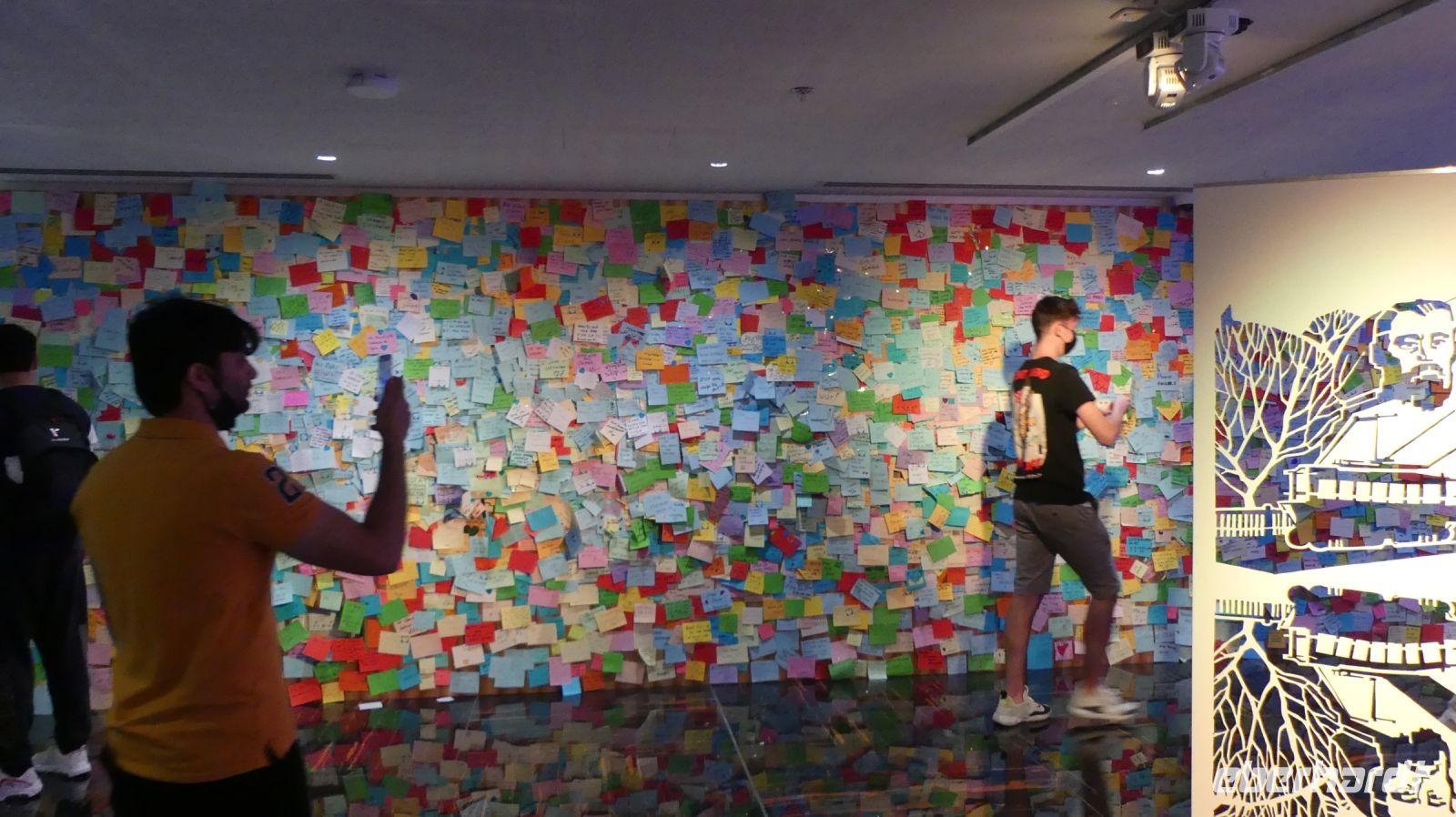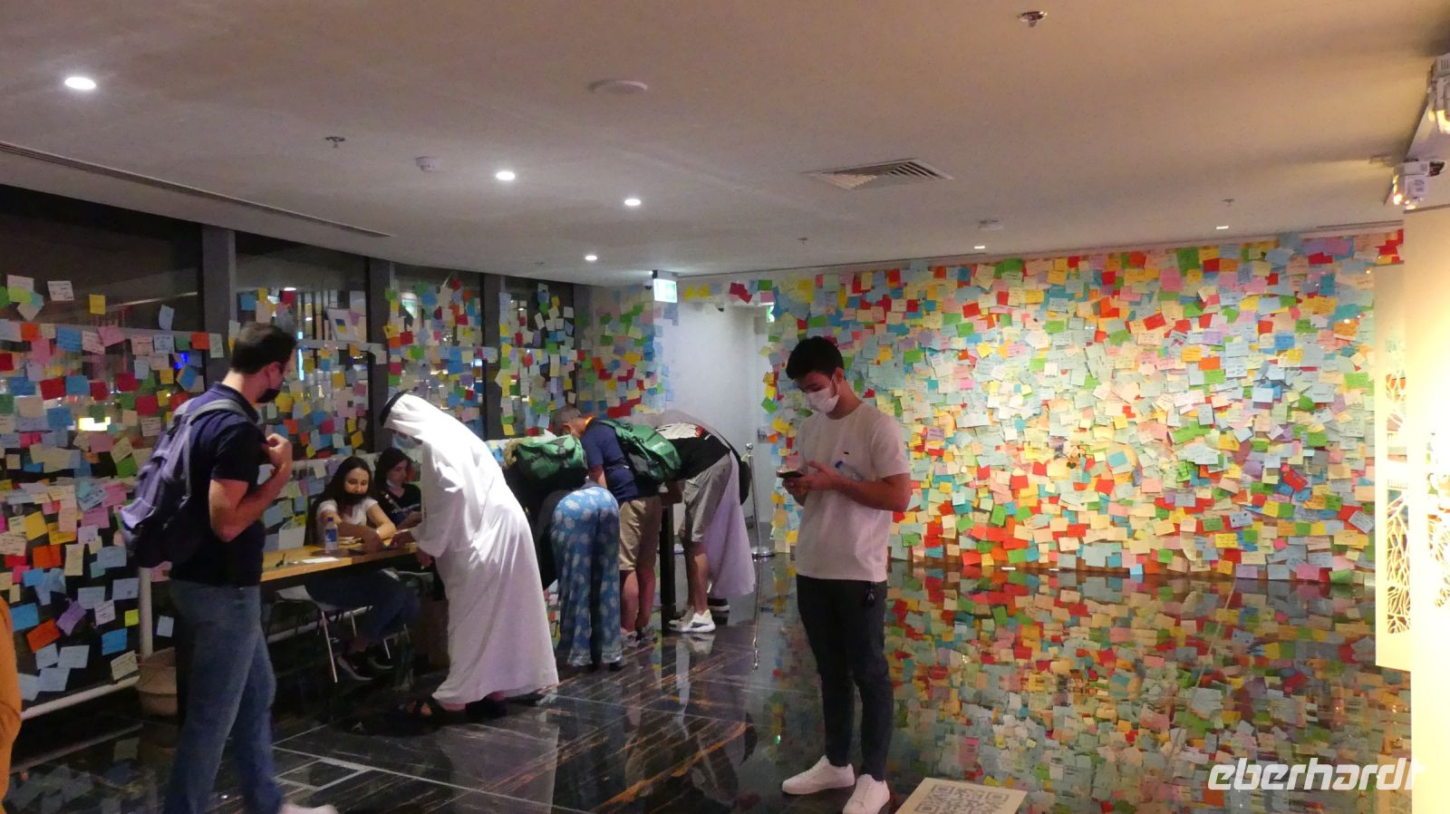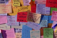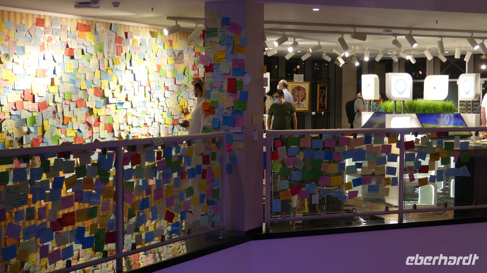 Zum Abschluss besuche ich den Pavillon der Ukraine. Es ist überwältigend zu sehen, wie zehntausende von Solidaritätsbekundungen, welche auf verschiedenen farbigen Zetteln niedergeschrieben sind, Wände, Treppengeländer und andere freie Flächen bedecken.
