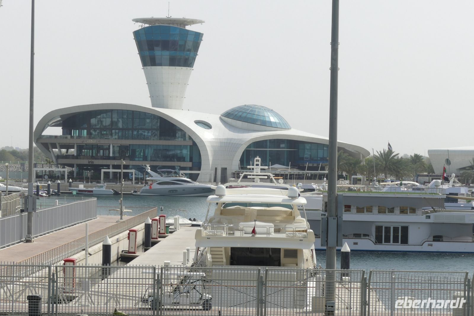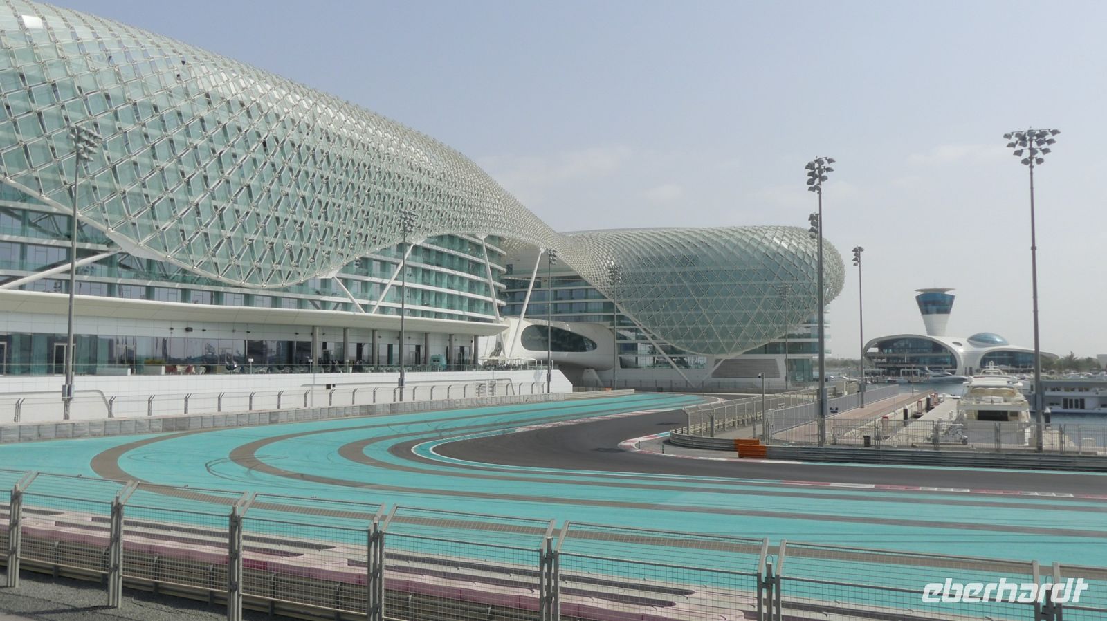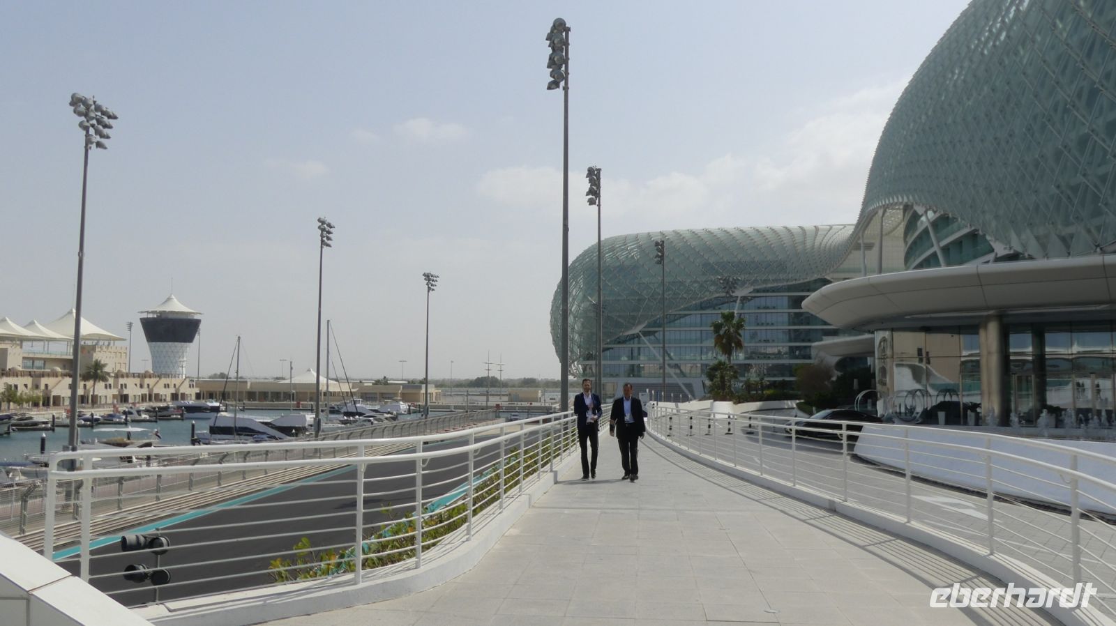 Wir sind noch gar nicht richtig durch mit unseren Fragen, da kommen wir schon nach Yas Island. Es ist eine der vielen Inseln um Abu Dhabi und steht ganz im Zeichen von Motorsport und Unterhaltung in Form von Vergnügungsparks und Erlebniswelten. Neben der Ferrari World befindet sich die Formel 1 Strecke Yas Marina Circuit. Wir legen einen Halt am Yas Hotel (jetzt W-Hotel) ein, um einen Blick auf die Rennstrecke zu werfen.