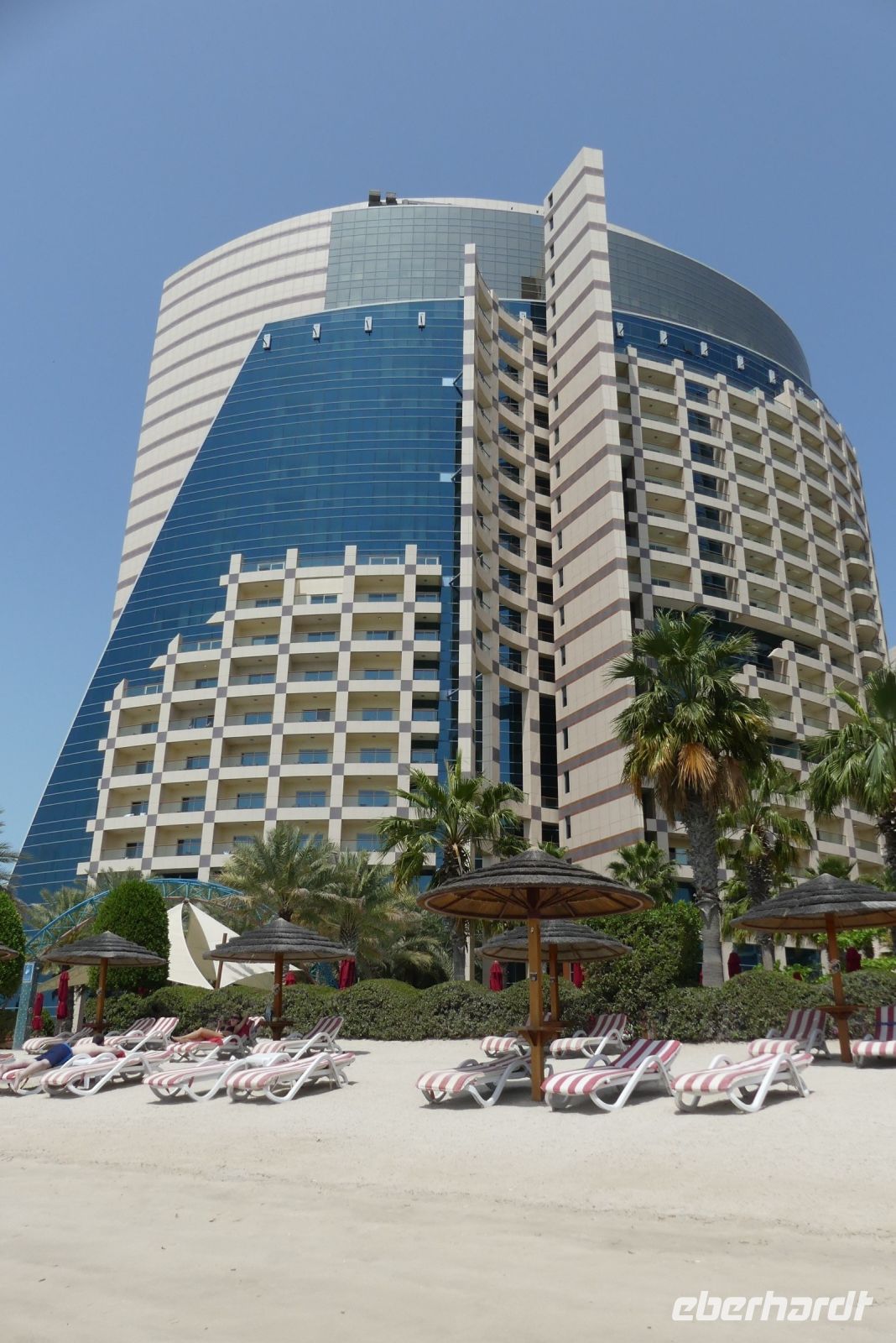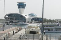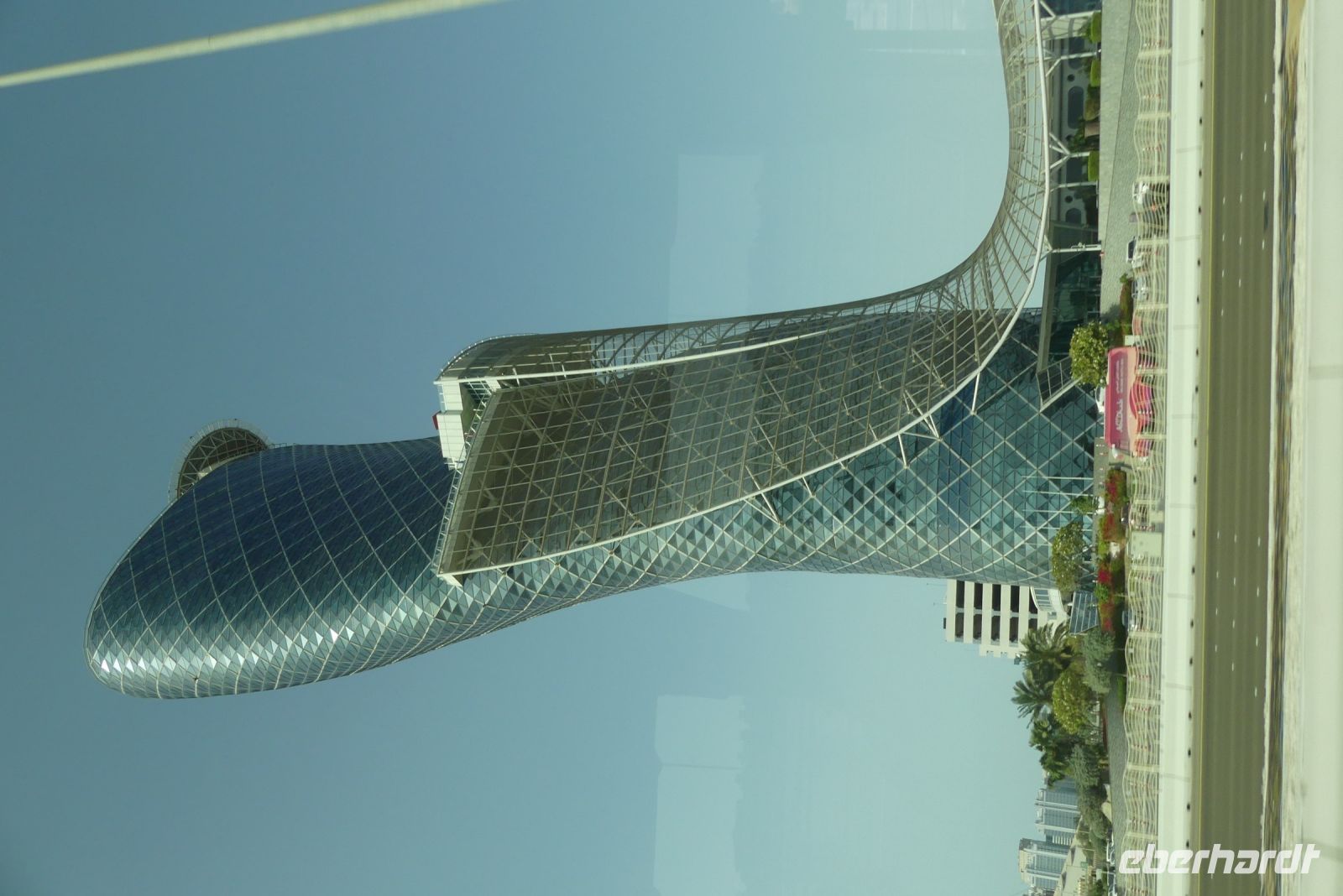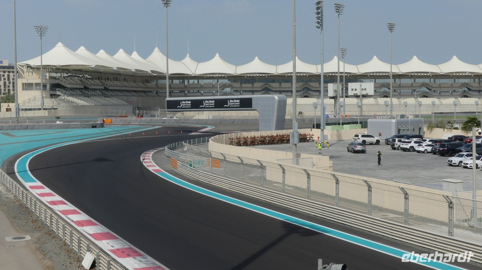 Wir sind noch gar nicht richtig durch mit unseren Fragen, da kommen wir schon nach Yas Island. Es ist eine der vielen Inseln um Abu Dhabi und steht ganz im Zeichen von Motorsport und Unterhaltung in Form von Vergnügungsparks und Erlebniswelten. Neben der Ferrari World befindet sich die Formel 1 Strecke Yas Marina Circuit. Wir legen einen Halt am Yas Hotel (jetzt W-Hotel) ein, um einen Blick auf die Rennstrecke zu werfen.