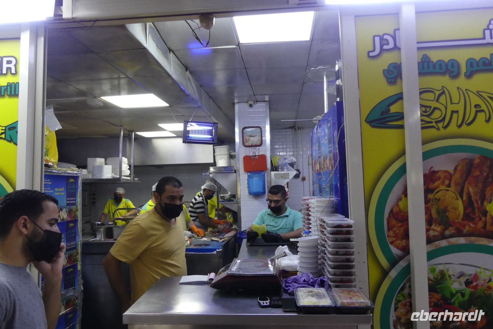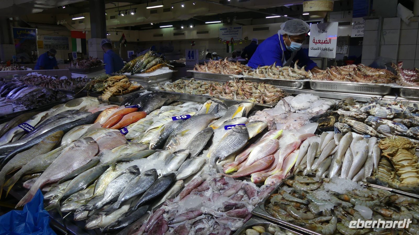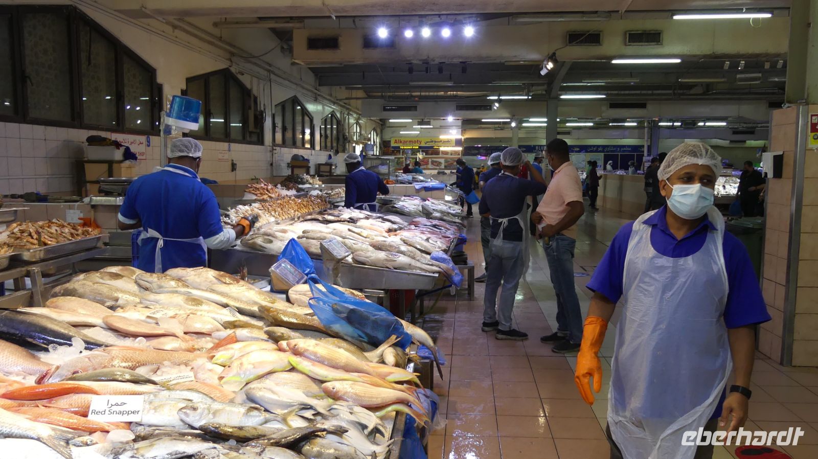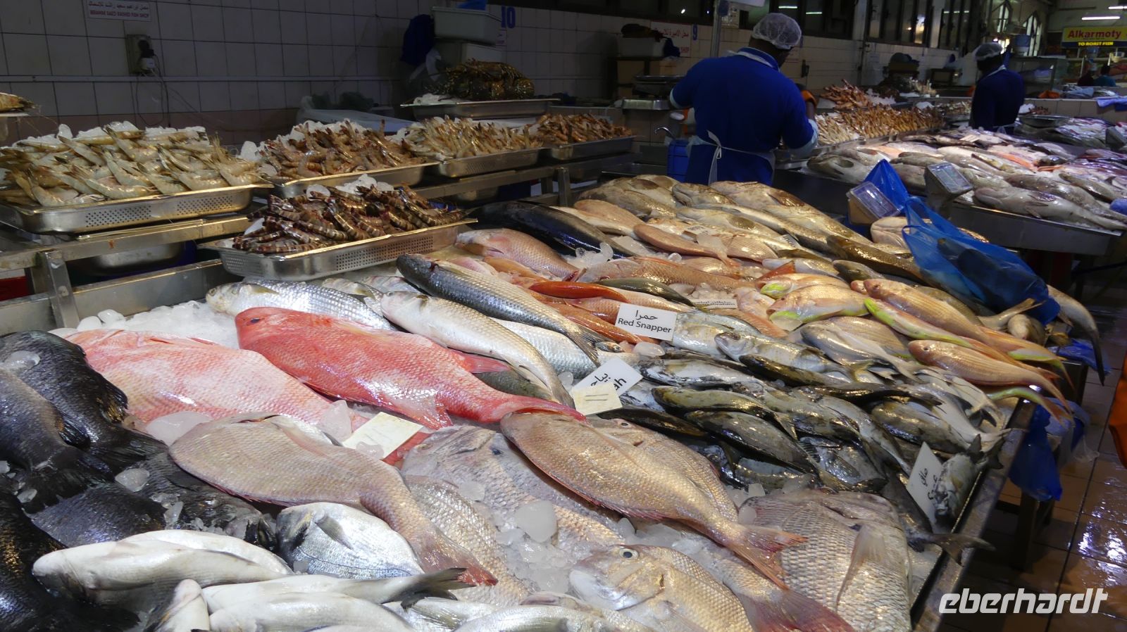 Inzwischen ist es Mittag. Die große Hitze der letzten Tage ist vorbei, wir erreichen heute angenehme 23 Grad, 14 Grad weiniger als gestern. Allerdings begleitet uns ein straffer Wind. Wir setzen unsere Fahrt Richtung Zentrum von Abu Dhabi fort und kommen zum Hafen. Am Fischmarkt nutzen wir das reichhaltige Angebot von frischem Fisch und Meeresfrüchten für ein leckeres Mittagessen. Statt Plastikbesteck und Kunststofftellern wäre Mehrweggeschirr allerdings angenehmer.