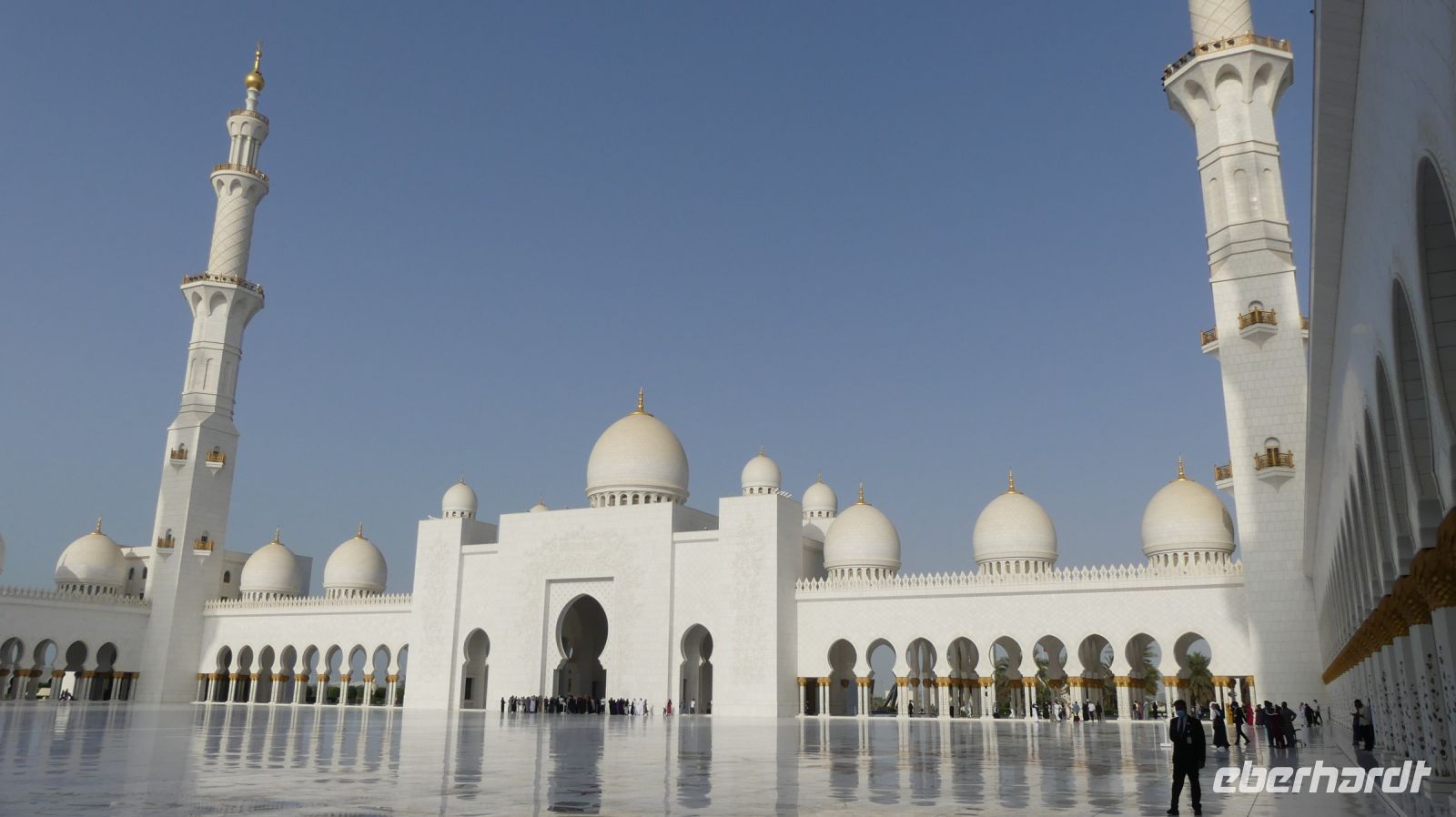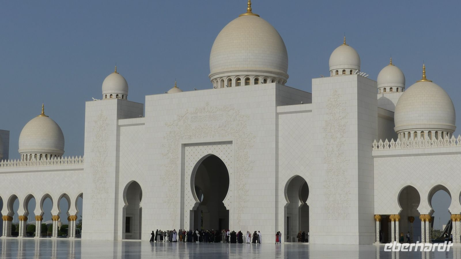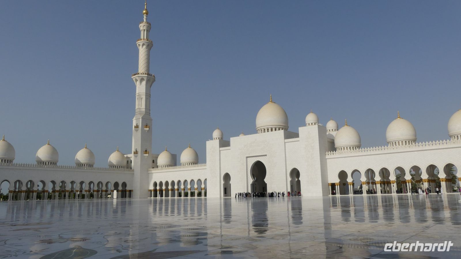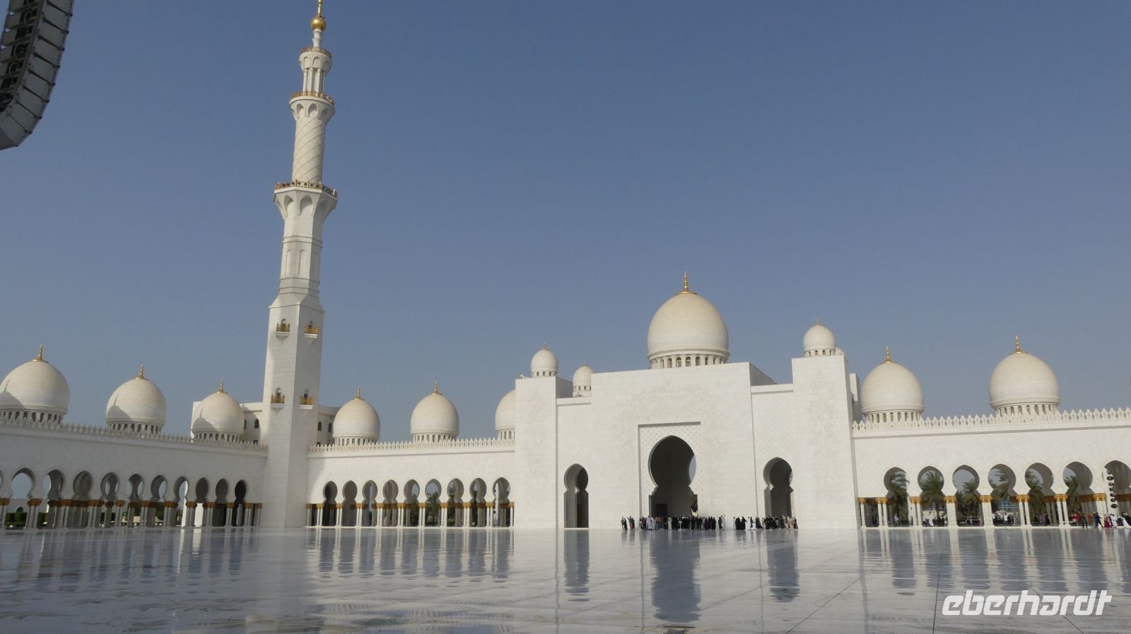 Nach unserem Aufenthalt im Emirates Palace fahren wir zur Großen Shaikh Zayed Moschee, die zu den bekanntesten Sehenswürdigkeit von Abu Dhabi zählt. Auf dem Weg dahin passieren wir den schiefen Turm von Abu Dhabi, eigentlich heißt er Capital Gate Tower. An der Moschee angekommen, müssen alle Frauen ihre Reize zu bedecken, also Kopftuch aufsetzen und lange Kleidung anlegen. Die Moschee gehört mit Platz für 40.000 bis 50.000 Muslime zu den weltgrößten Moscheen. Die Freitagsmoschee mit ihren 82 Kuppeln strahlt im weißen italienischen Marmor. Nachdem vor einigen Wochen sich ein Tourist aus Israel mit einer Regenbogenfahne vor der Moschee fotografiert und diese Bilder in sozialen Netzwerken online gestellt hatte, haben die hiesigen Behörden neue, m. E. völlig überzogene Regeln eingeführt: dazu zählt zum Beispiel, dass jegliche Handzeichen auf Fotos verboten sind. An den neuerdings eingerichteten „Fotopoints“ sollen jetzt Sicherheitskräfte kontrollieren, dass nur „anständige“ Fotos gemacht werden. Schade, aber dennoch eine sehr sehenswerte Moschee.