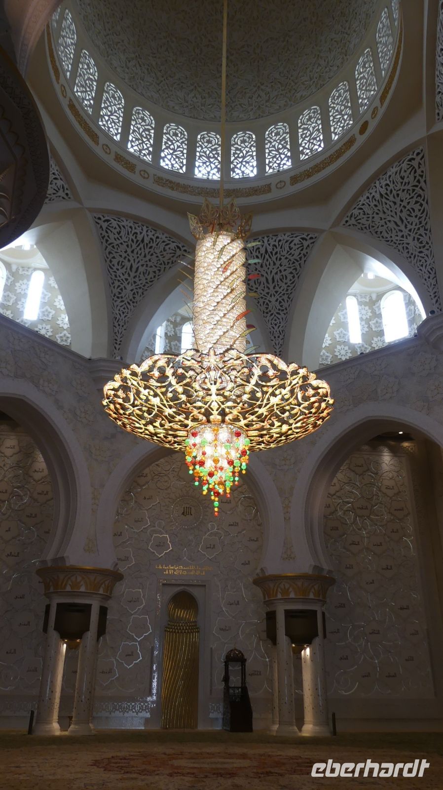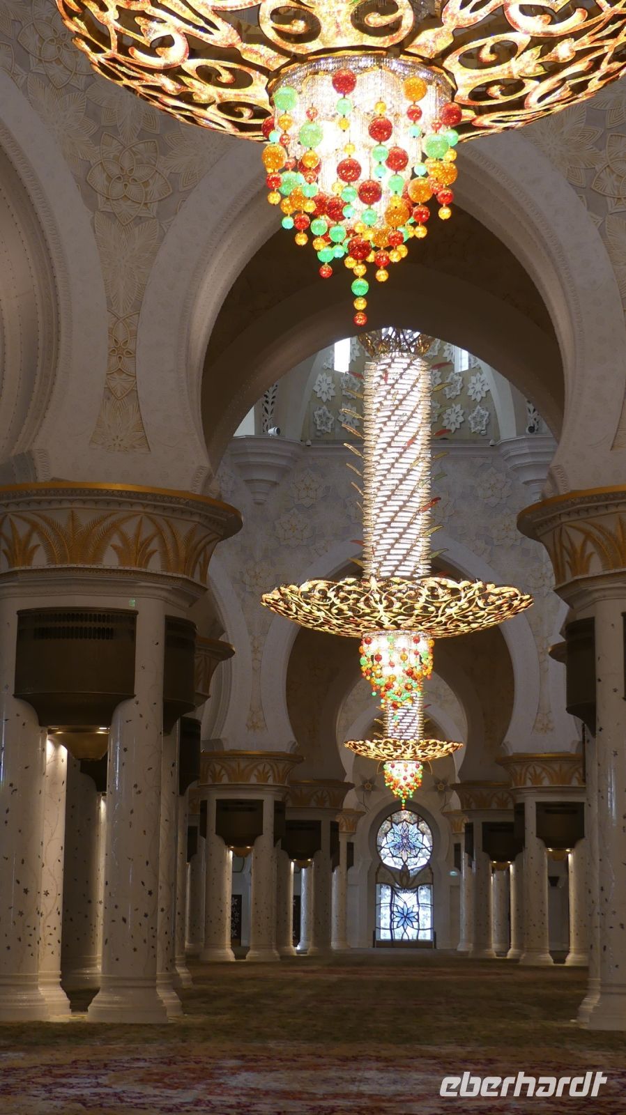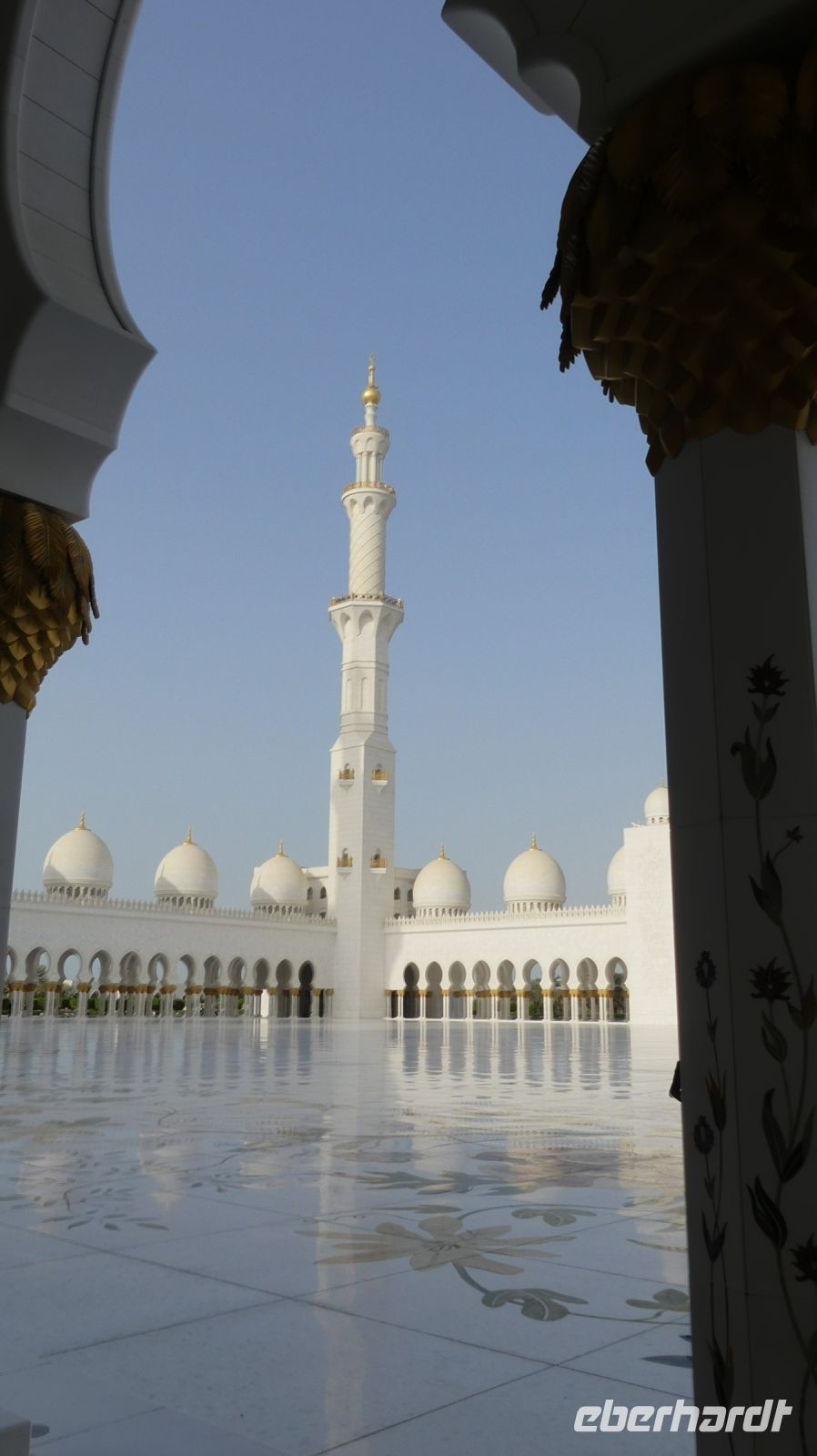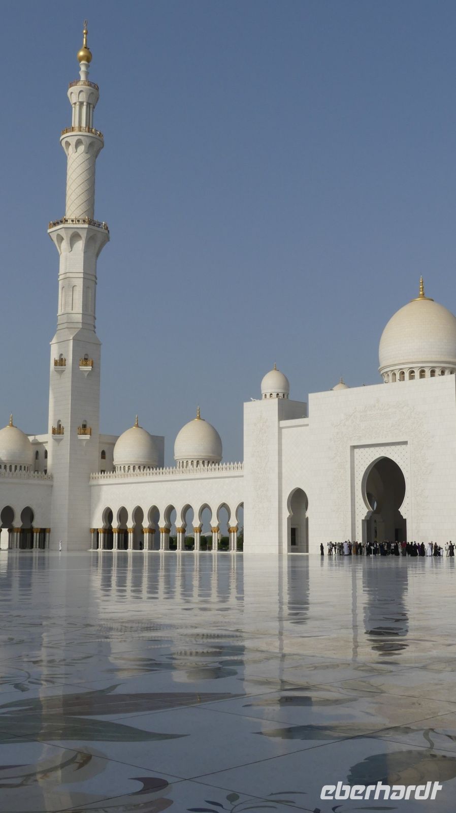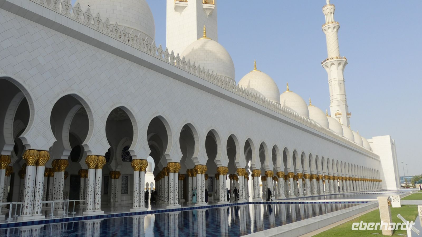Nach unserem Aufenthalt im Emirates Palace fahren wir zur Großen Shaikh Zayed Moschee, die zu den bekanntesten Sehenswürdigkeit von Abu Dhabi zählt. Auf dem Weg dahin passieren wir den schiefen Turm von Abu Dhabi, eigentlich heißt er Capital Gate Tower. An der Moschee angekommen, müssen alle Frauen ihre Reize zu bedecken, also Kopftuch aufsetzen und lange Kleidung anlegen. Die Moschee gehört mit Platz für 40.000 bis 50.000 Muslime zu den weltgrößten Moscheen. Die Freitagsmoschee mit ihren 82 Kuppeln strahlt im weißen italienischen Marmor. Nachdem vor einigen Wochen sich ein Tourist aus Israel mit einer Regenbogenfahne vor der Moschee fotografiert und diese Bilder in sozialen Netzwerken online gestellt hatte, haben die hiesigen Behörden neue, m. E. völlig überzogene Regeln eingeführt: dazu zählt zum Beispiel, dass jegliche Handzeichen auf Fotos verboten sind. An den neuerdings eingerichteten „Fotopoints“ sollen jetzt Sicherheitskräfte kontrollieren, dass nur „anständige“ Fotos gemacht werden. Schade, aber dennoch eine sehr sehenswerte Moschee.