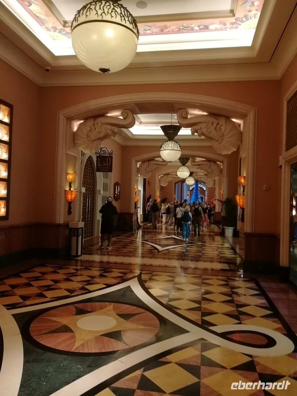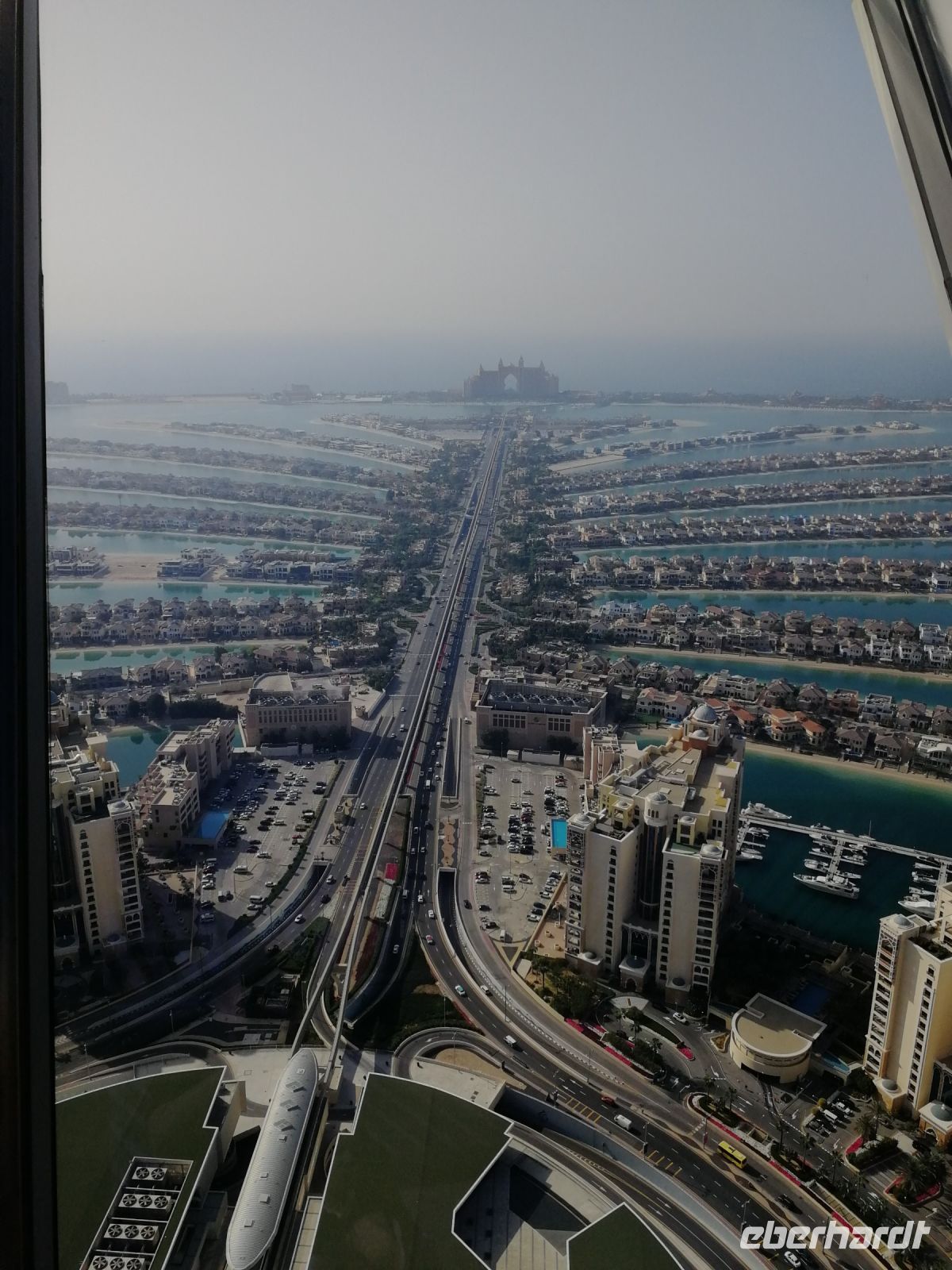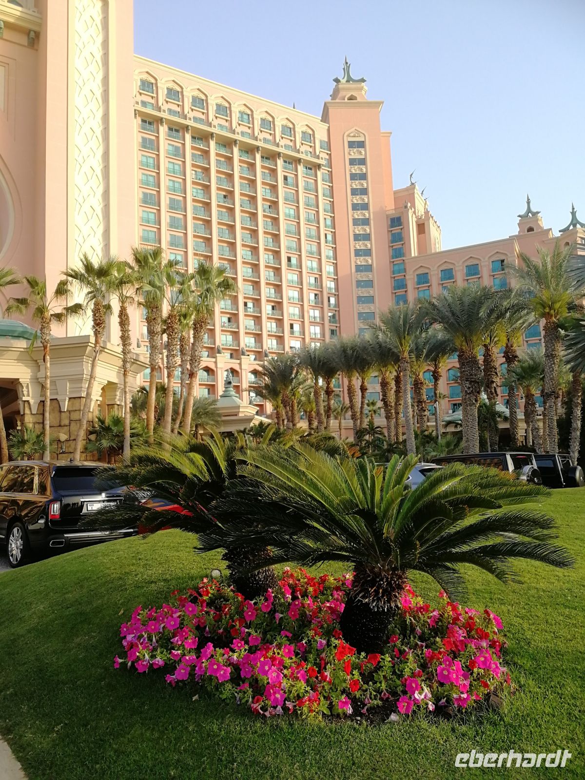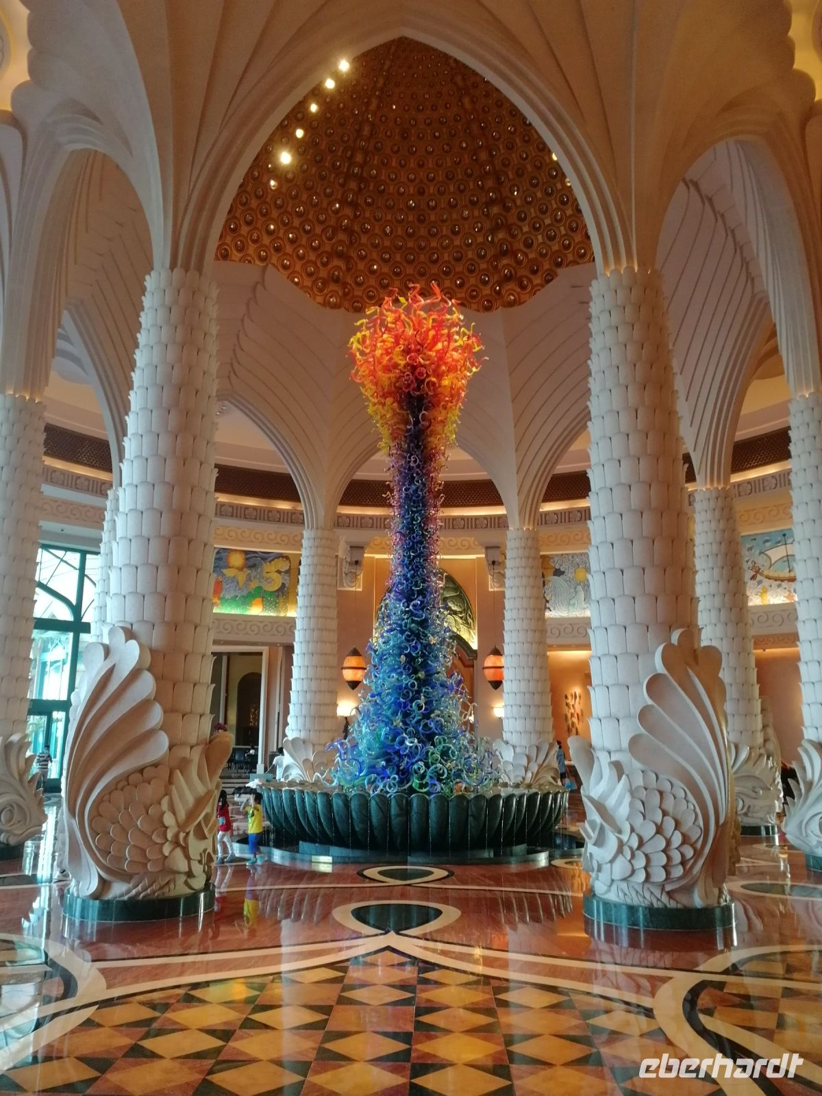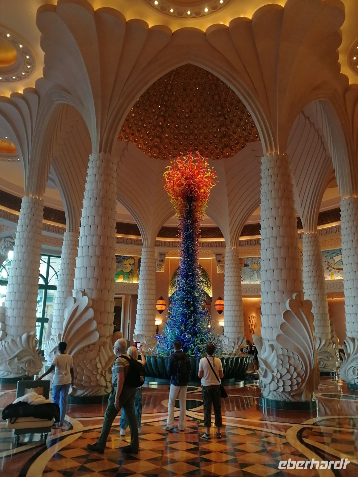 Am Ende des Tages fuhren wir mit der Monorail entlang der 14 Palmenblätter, der teilw. mit im Privatbesitz befindlichen bebauten Immobilien, zum 2008 eröffneten und 48 Hektar großen Luxus- und Themenhotel Atlantis The Palm an der Spitze der Palmeninsel, nach dem Thema der versunkenen Stadt Atlantis konstruiert. Dieses Hotel war das erste Hotel der künstlich errichteten Palmeninsel und stellt einige Superlativen auf. Wie ein eigenes Aquarium, lange Wege, über 23 Restaurants, über 5.000 Tagesbesucher z.B. im Aquarium „The Lost Chambers“, mittelgroße Einkaufszeile mit Markenangeboten, insbesondere Juwelen und Uhren, einem Aquapark (Aquaventure) oder einer eigenen Unterwassersuite. Im riesigen Saffron Restaurant konnten wir heute Abend unser Abendessen einnehmen.