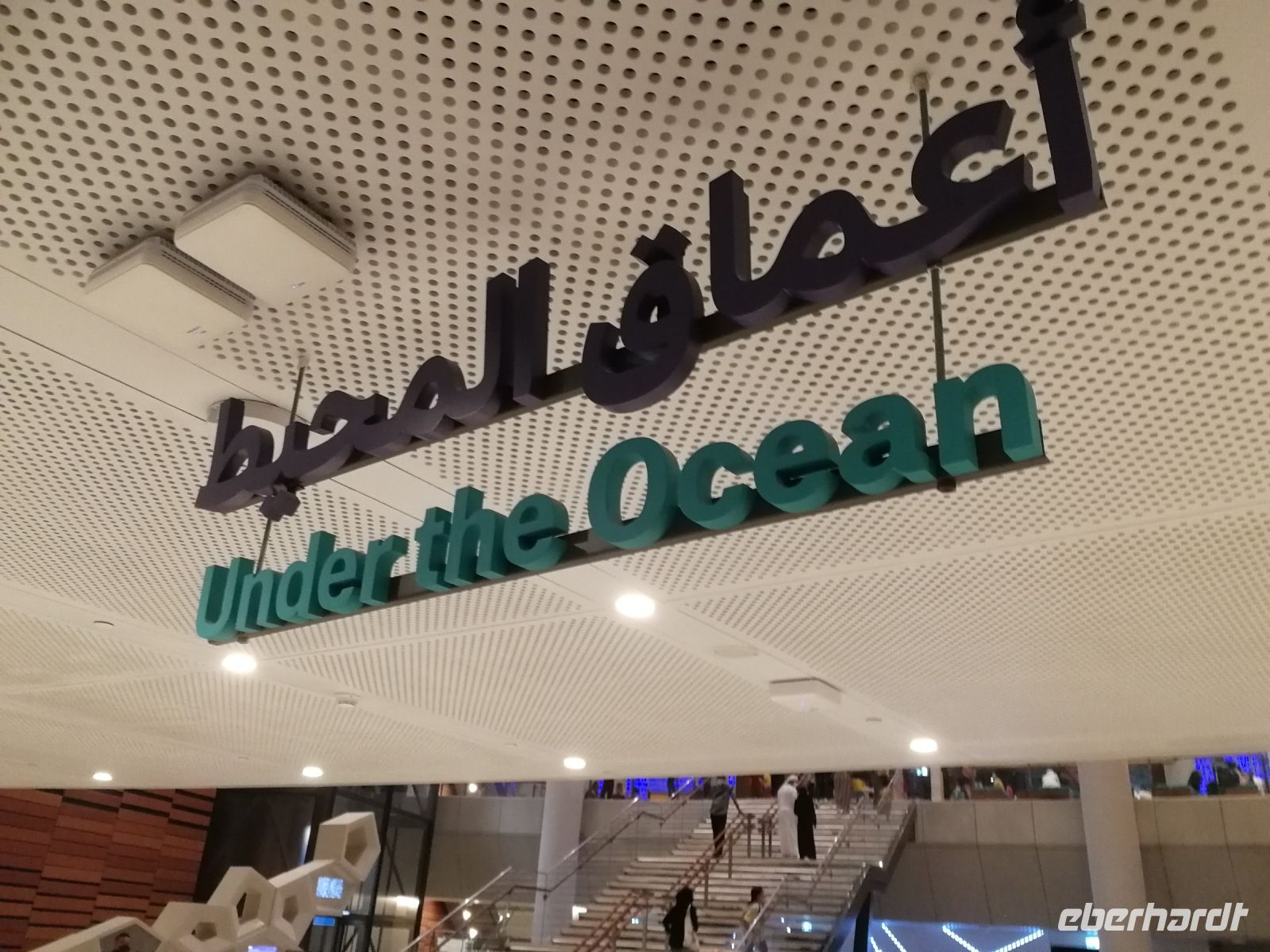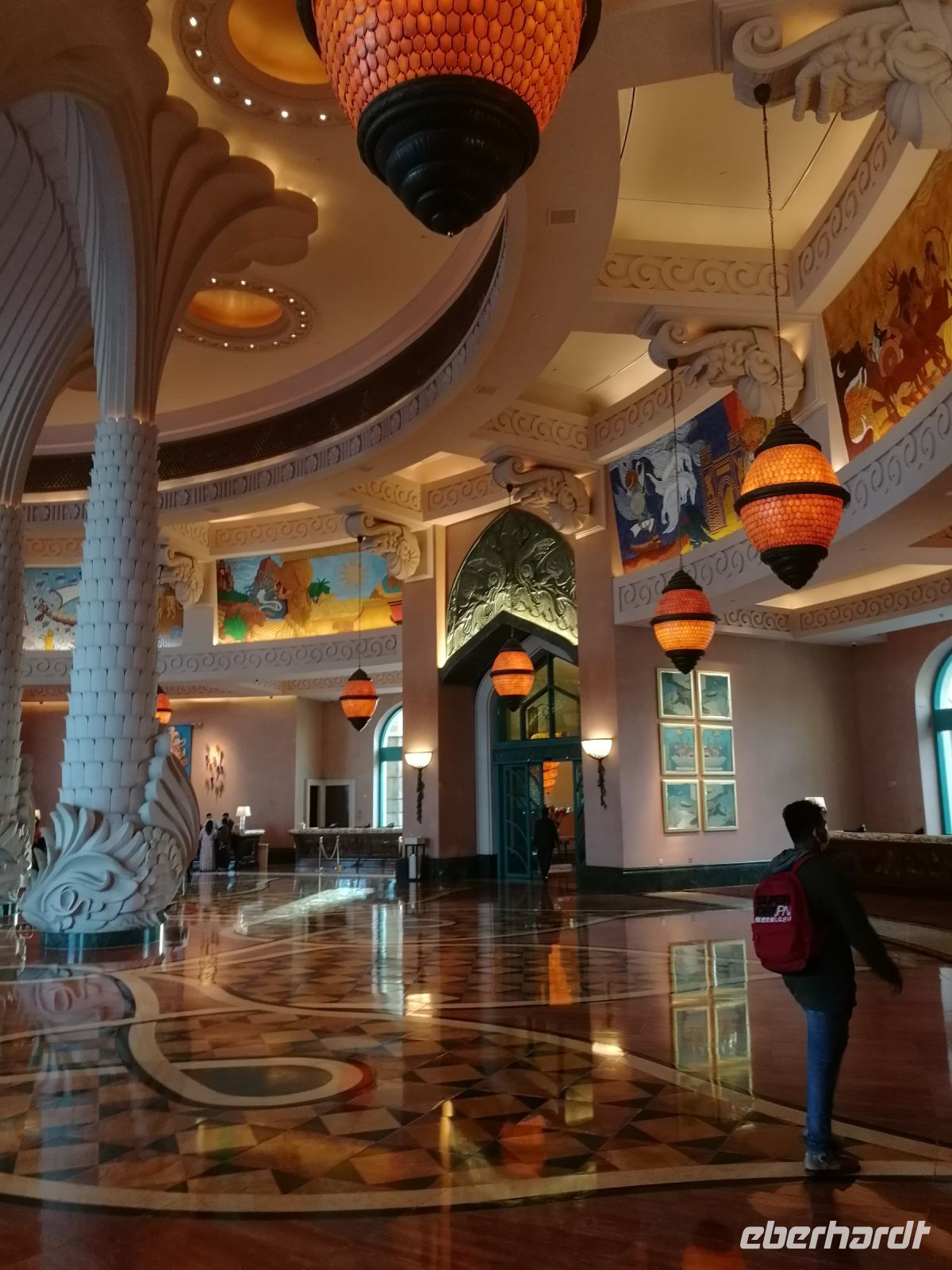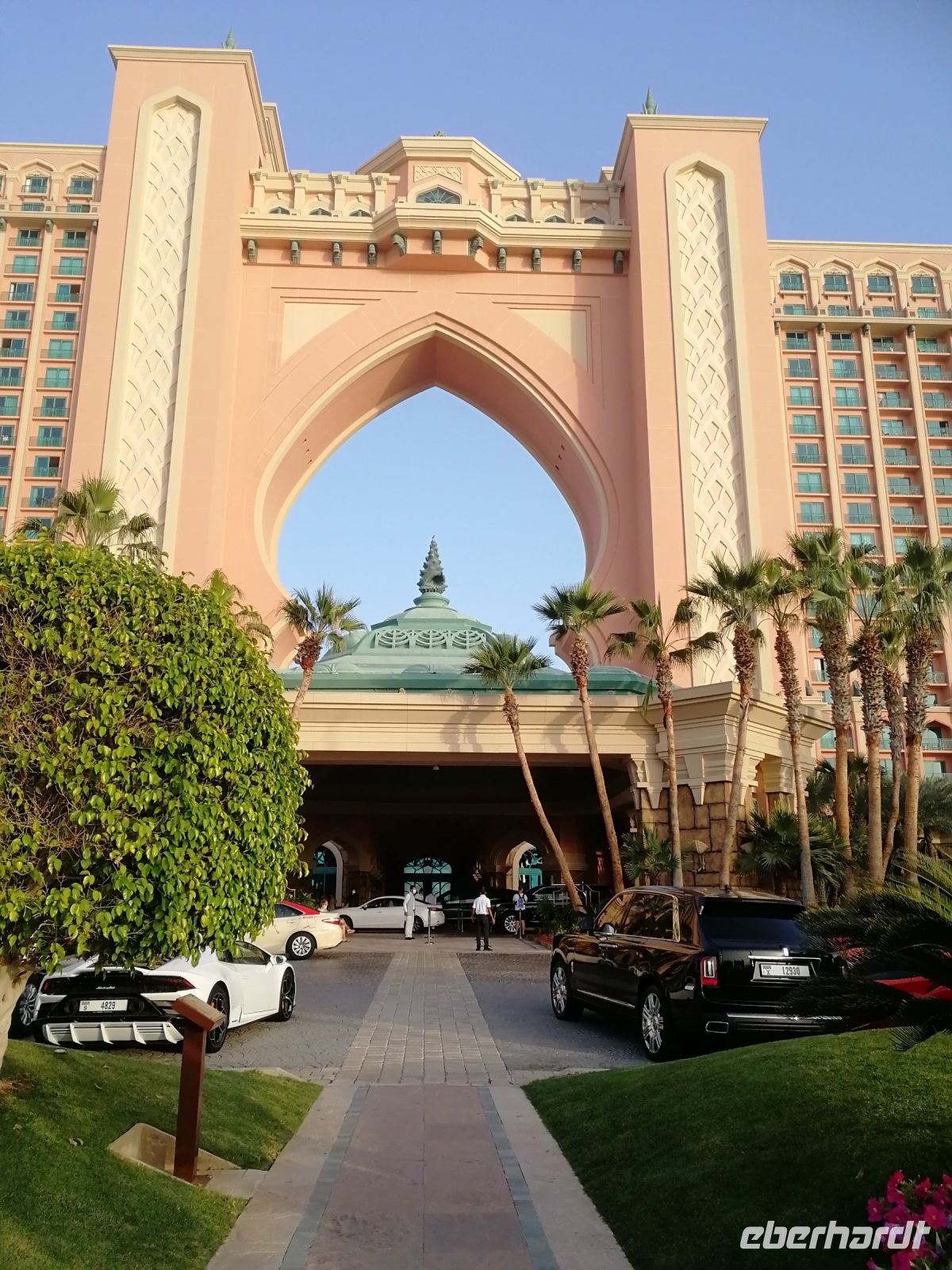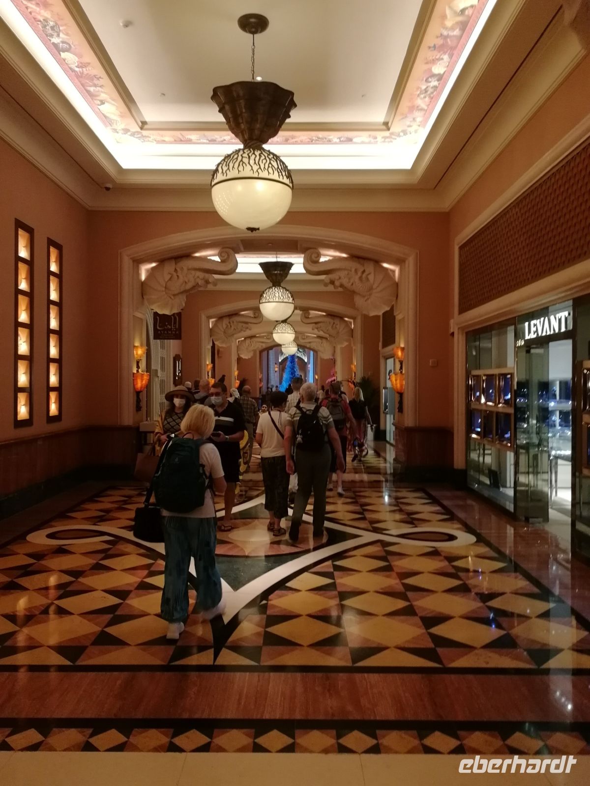 Am Ende des Tages fuhren wir mit der Monorail entlang der 14 Palmenblätter, der teilw. mit im Privatbesitz befindlichen bebauten Immobilien, zum 2008 eröffneten und 48 Hektar großen Luxus- und Themenhotel Atlantis The Palm an der Spitze der Palmeninsel, nach dem Thema der versunkenen Stadt Atlantis konstruiert. Dieses Hotel war das erste Hotel der künstlich errichteten Palmeninsel und stellt einige Superlativen auf. Wie ein eigenes Aquarium, lange Wege, über 23 Restaurants, über 5.000 Tagesbesucher z.B. im Aquarium „The Lost Chambers“, mittelgroße Einkaufszeile mit Markenangeboten, insbesondere Juwelen und Uhren, einem Aquapark (Aquaventure) oder einer eigenen Unterwassersuite. Im riesigen Saffron Restaurant konnten wir heute Abend unser Abendessen einnehmen.