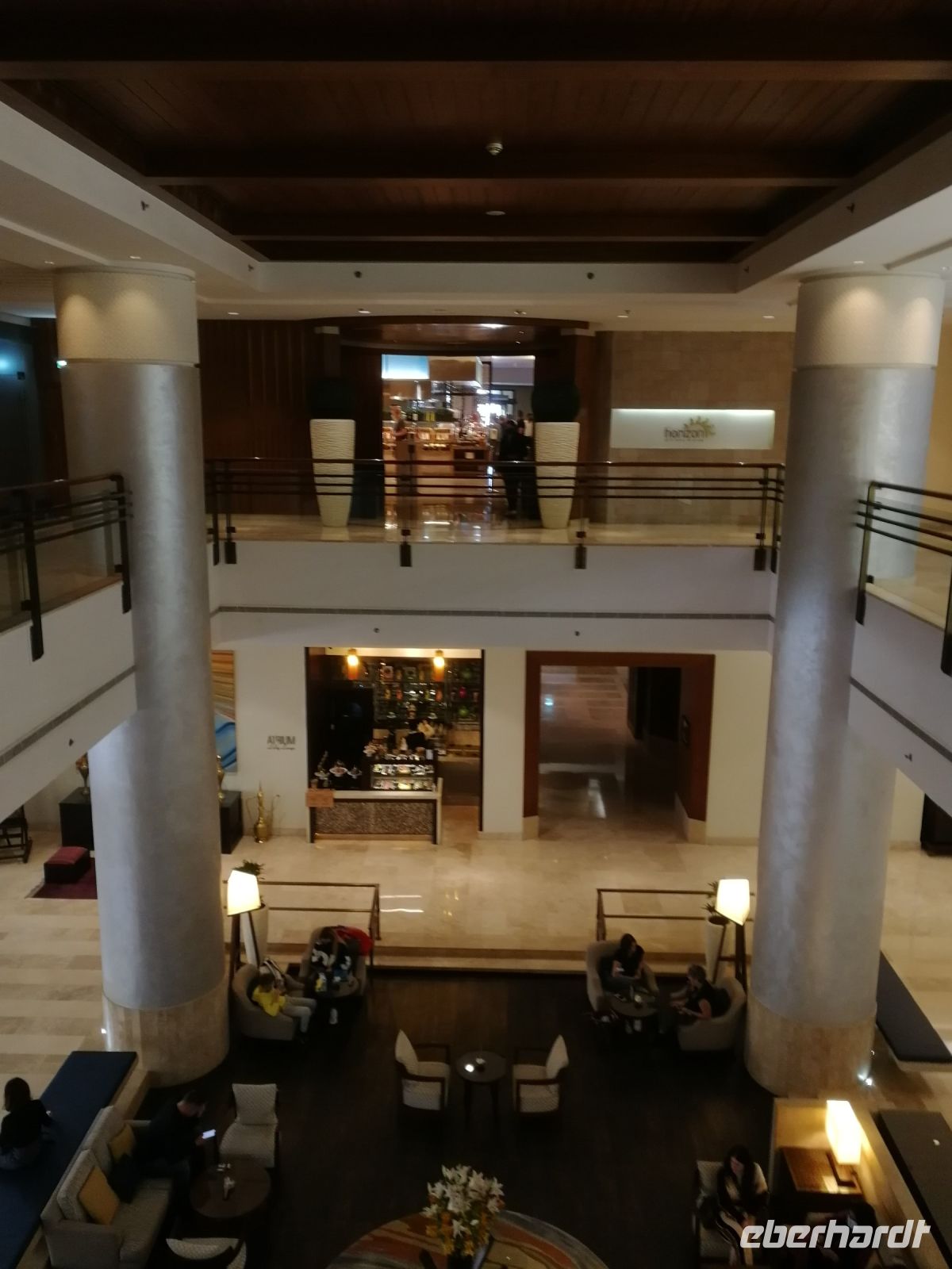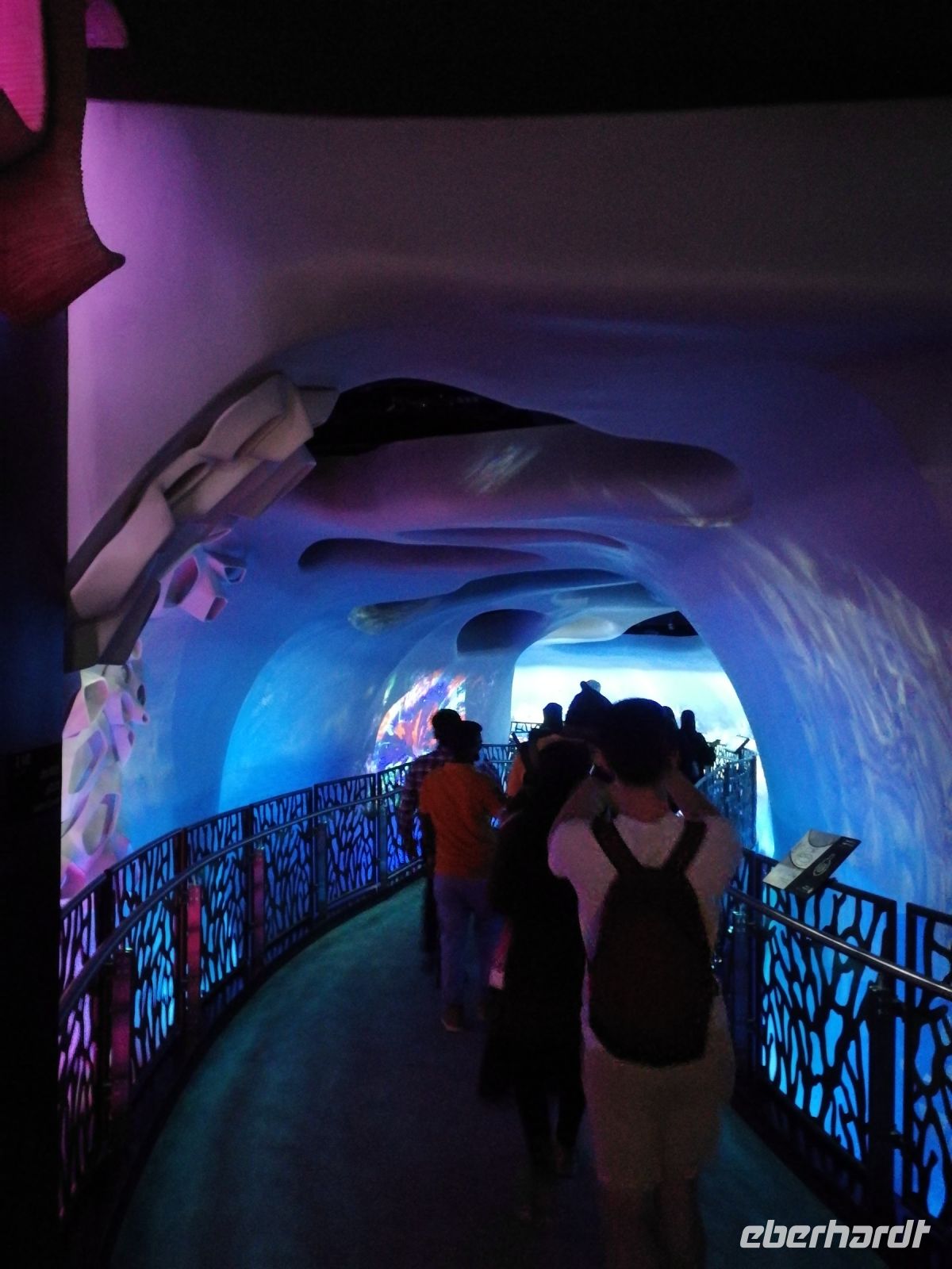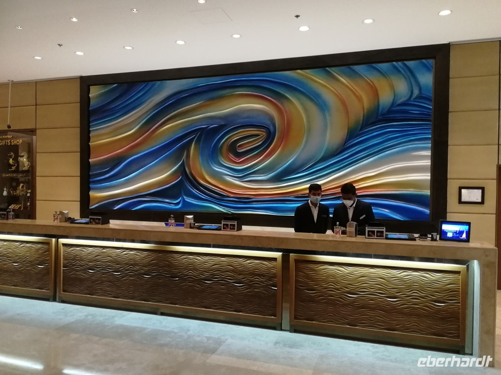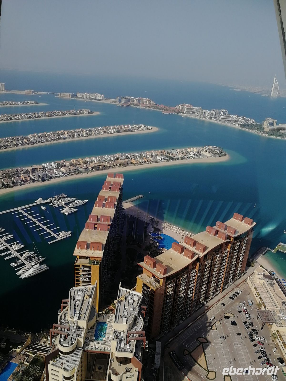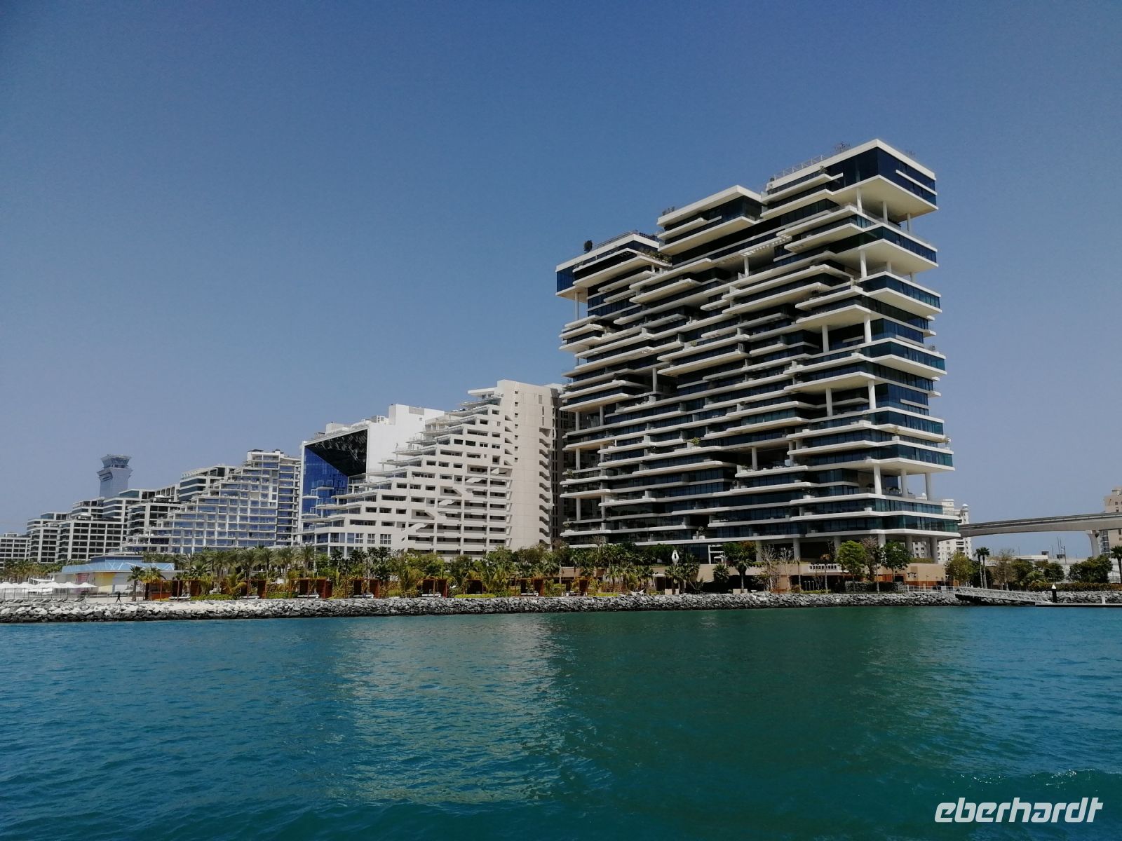 Am Ende des Tages fuhren wir mit der Monorail entlang der 14 Palmenblätter, der teilw. mit im Privatbesitz befindlichen bebauten Immobilien, zum 2008 eröffneten und 48 Hektar großen Luxus- und Themenhotel Atlantis The Palm an der Spitze der Palmeninsel, nach dem Thema der versunkenen Stadt Atlantis konstruiert. Dieses Hotel war das erste Hotel der künstlich errichteten Palmeninsel und stellt einige Superlativen auf. Wie ein eigenes Aquarium, lange Wege, über 23 Restaurants, über 5.000 Tagesbesucher z.B. im Aquarium „The Lost Chambers“, mittelgroße Einkaufszeile mit Markenangeboten, insbesondere Juwelen und Uhren, einem Aquapark (Aquaventure) oder einer eigenen Unterwassersuite. Im riesigen Saffron Restaurant konnten wir heute Abend unser Abendessen einnehmen.