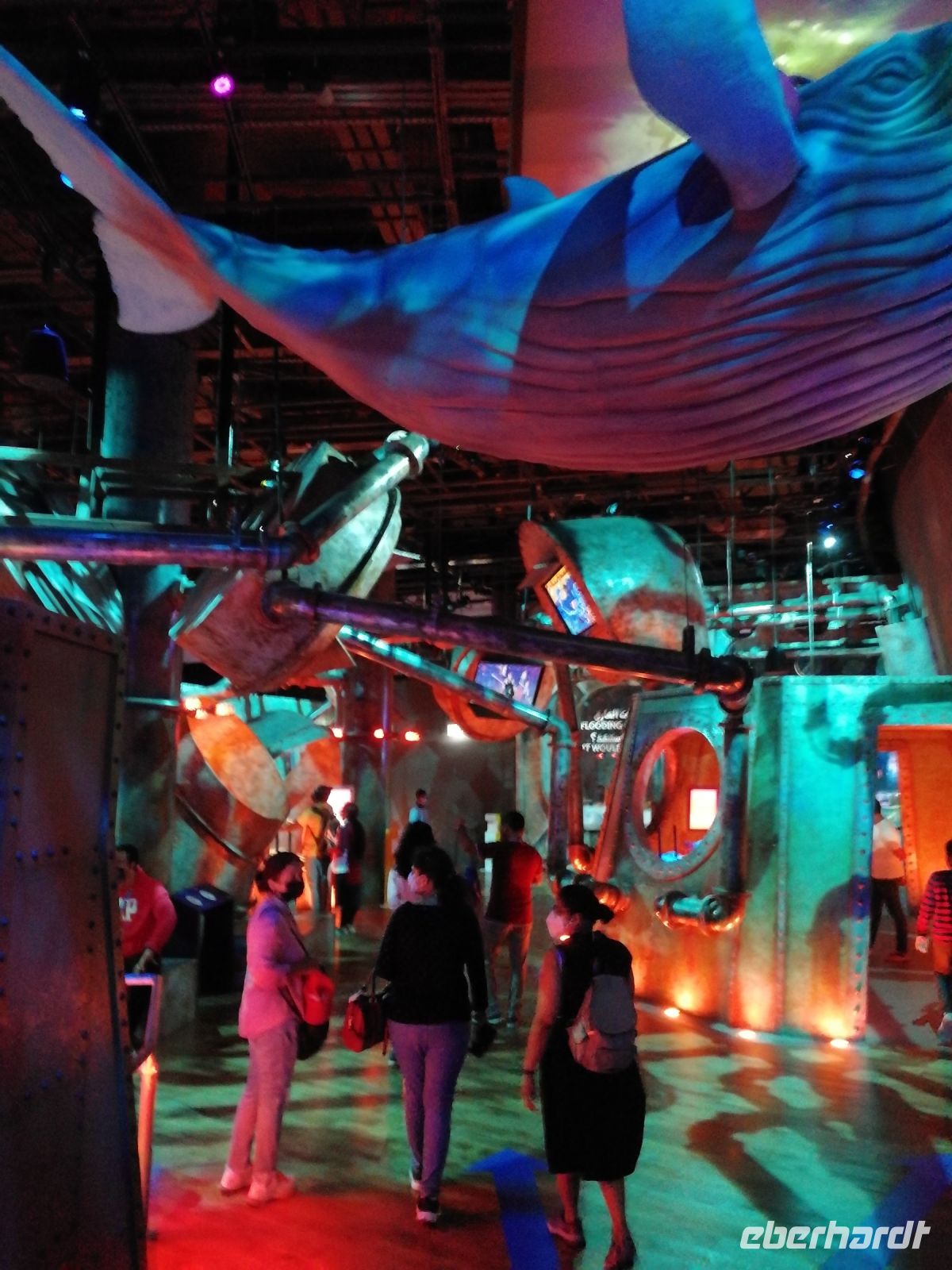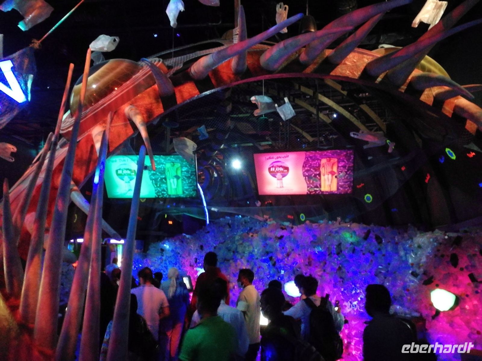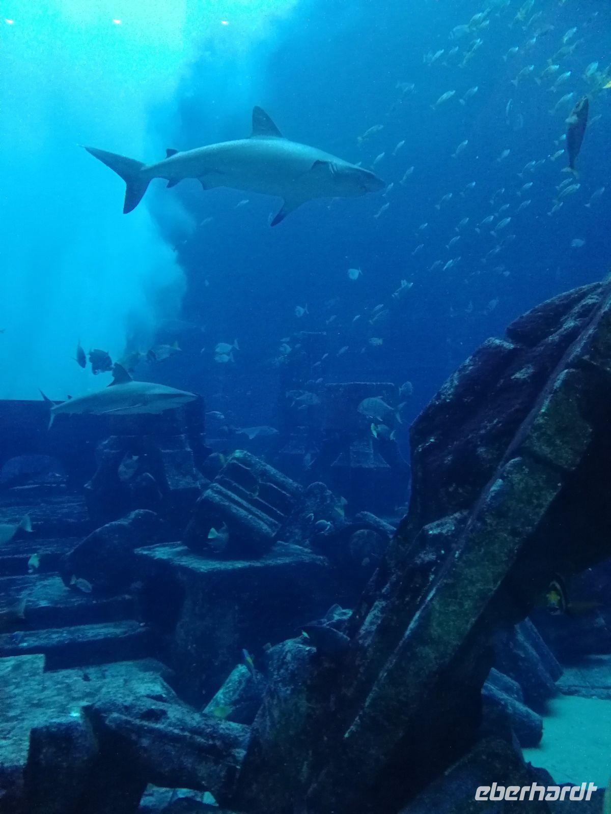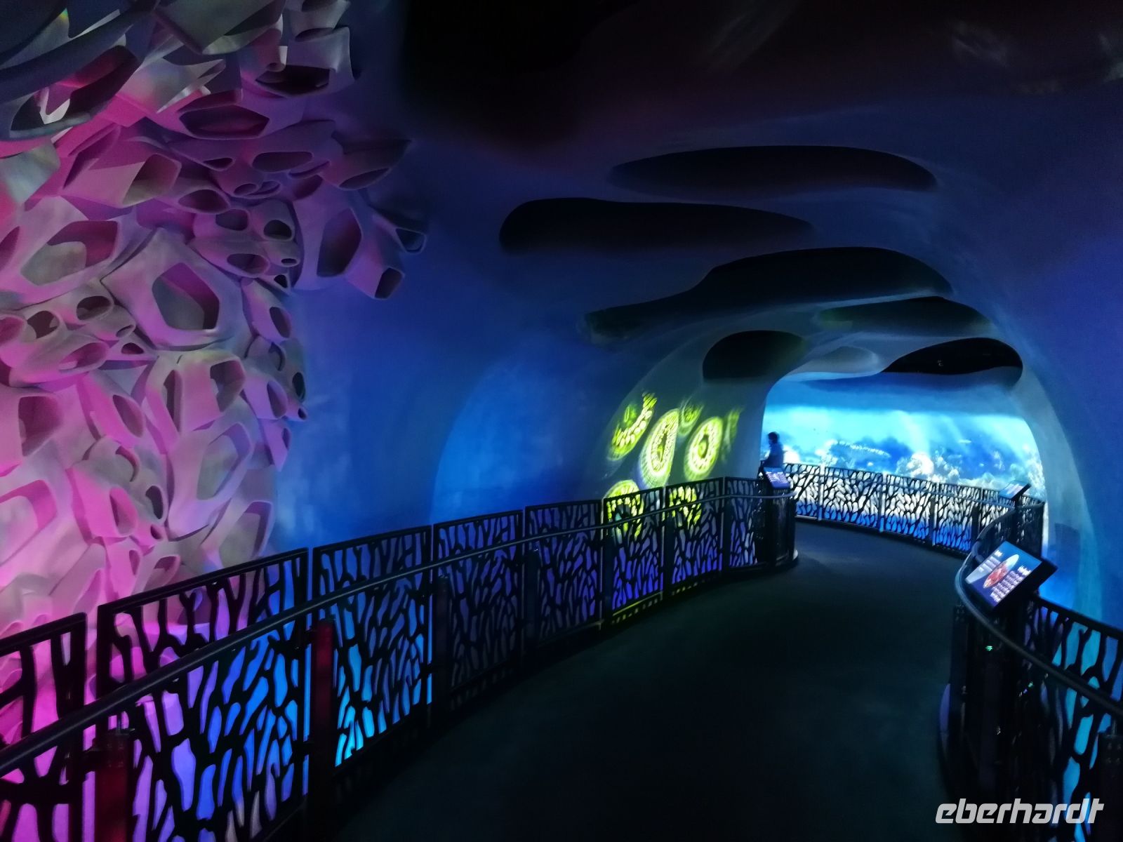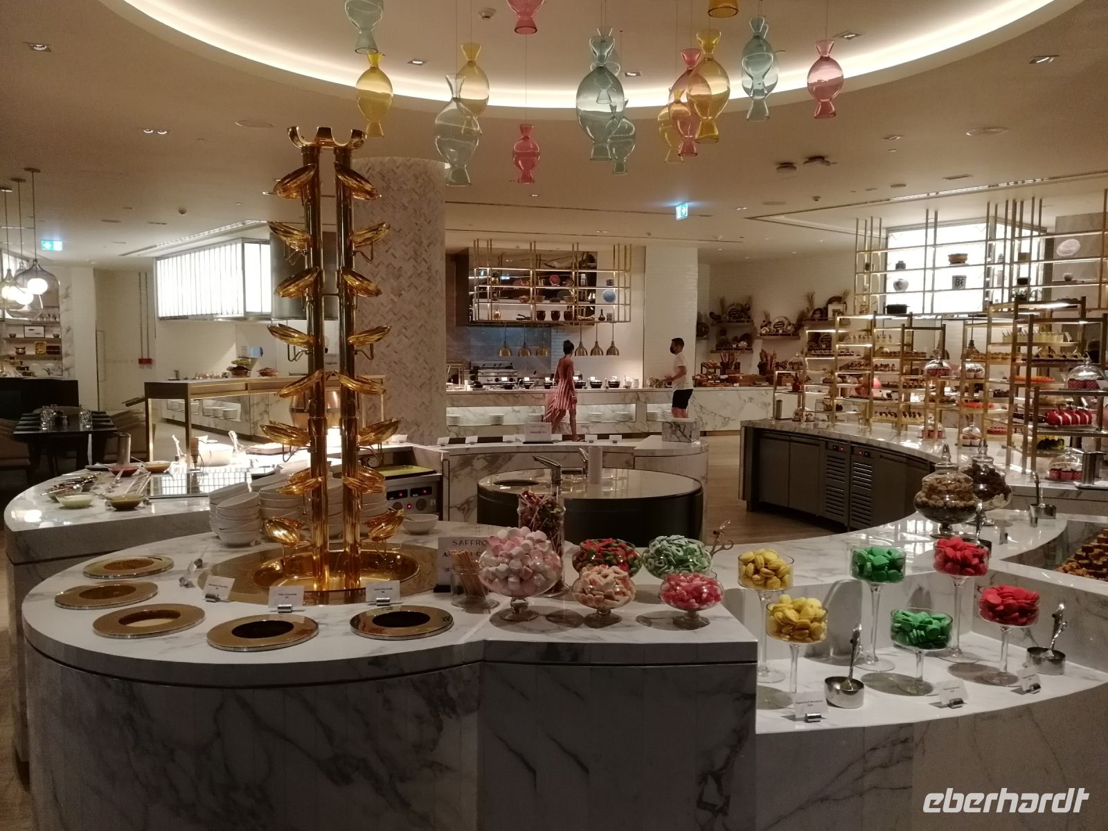 Am Ende des Tages fuhren wir mit der Monorail entlang der 14 Palmenblätter, der teilw. mit im Privatbesitz befindlichen bebauten Immobilien, zum 2008 eröffneten und 48 Hektar großen Luxus- und Themenhotel Atlantis The Palm an der Spitze der Palmeninsel, nach dem Thema der versunkenen Stadt Atlantis konstruiert. Dieses Hotel war das erste Hotel der künstlich errichteten Palmeninsel und stellt einige Superlativen auf. Wie ein eigenes Aquarium, lange Wege, über 23 Restaurants, über 5.000 Tagesbesucher z.B. im Aquarium „The Lost Chambers“, mittelgroße Einkaufszeile mit Markenangeboten, insbesondere Juwelen und Uhren, einem Aquapark (Aquaventure) oder einer eigenen Unterwassersuite. Im riesigen Saffron Restaurant konnten wir heute Abend unser Abendessen einnehmen.