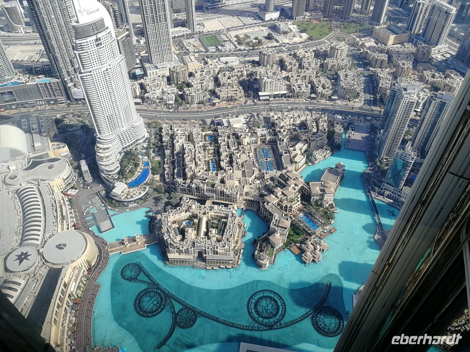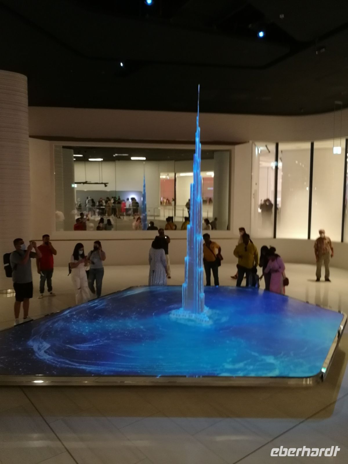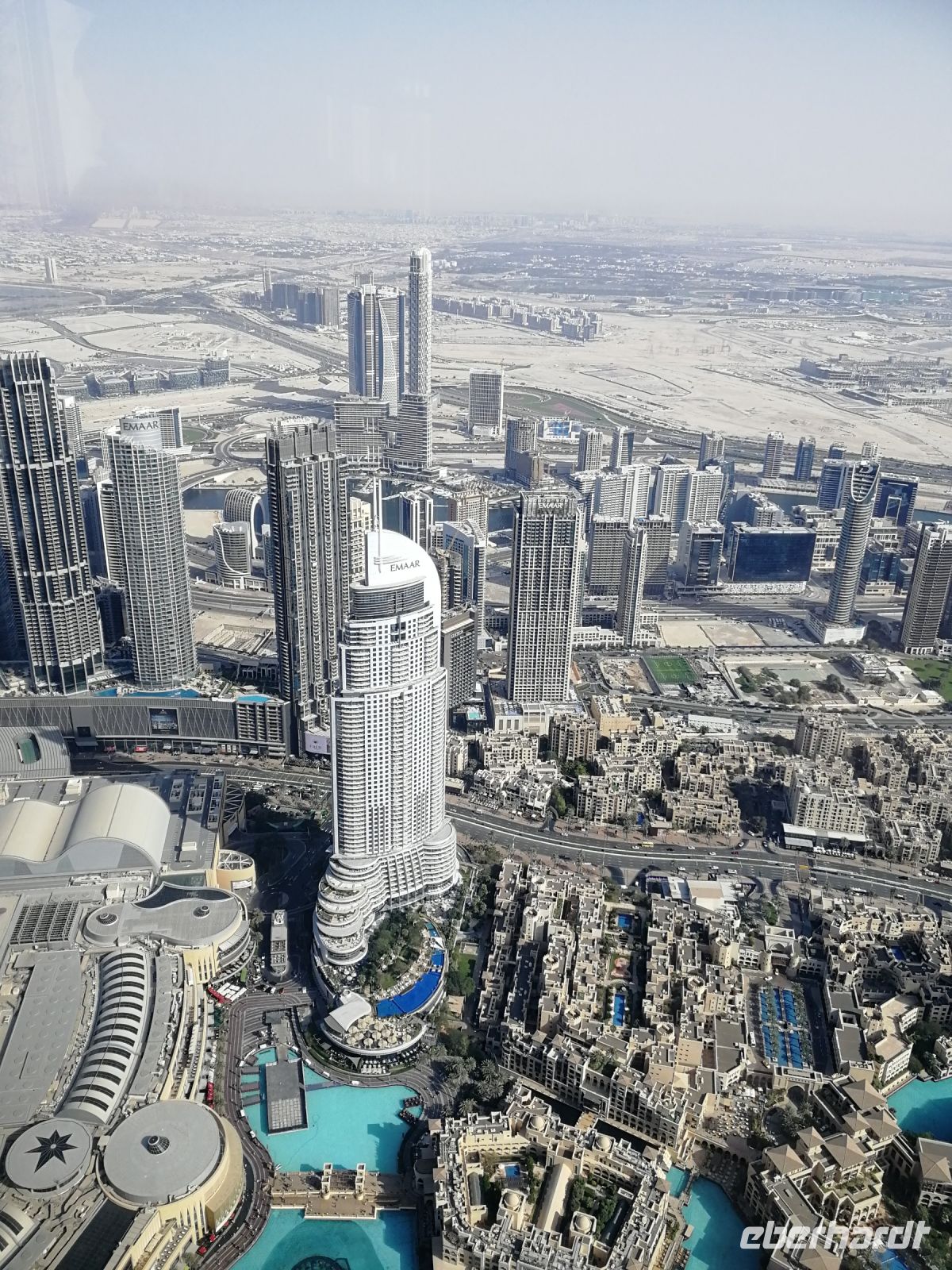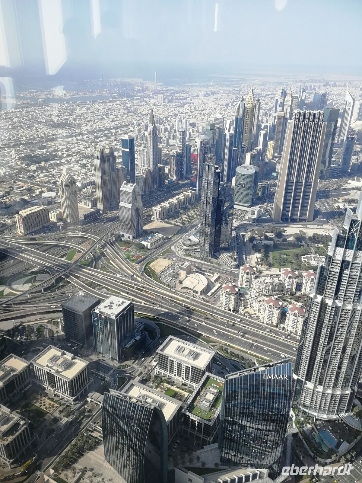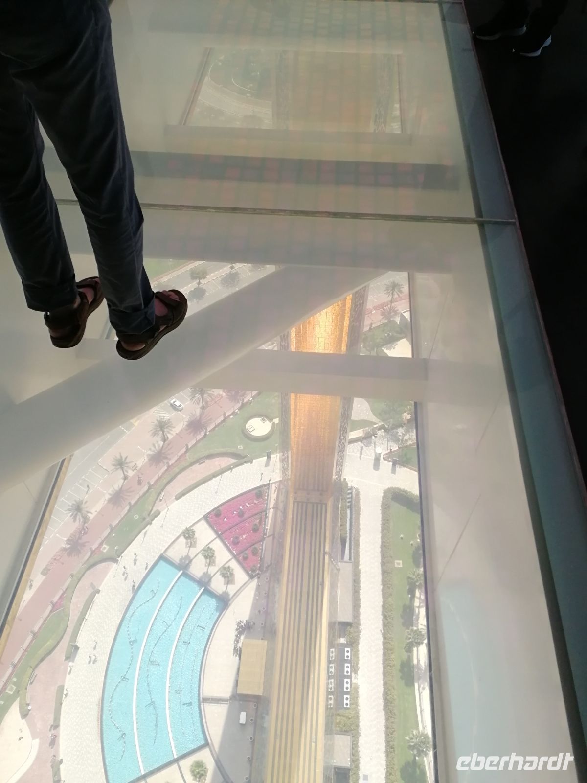 Unsere Gruppe war von der schier unendlichen Vielfalt der Läden beeindruckt. Es bleib jedoch kaum Zeit für einen ausgiebigen Shopping-Tag, da bereits die Auffahrt zum Burj Khalifa, dem höchsten Wolkenkratzer der Welt wartete. Auch dieser Turm wurde von der Emaar Properties Immobiliengesellschaft und dem Architekten Adrian Smith entwickelt. Im Jahr 2009 wurde das Gebäude mit 828m eingeweiht. Ibrahim erklärte uns, dass das Gebäude bereits verschiedene Namen trug. Von Burj Dubai seit der Einweihung bis heute Burj Khalifa, nach dem Namen des Präsidenten der VAE. Heute finden hier Hotels, Wohnungen und Büros weitere Verwendung. Wir machten uns in nur 55 Sekunden mit dem Fahrstuhl in die 124./125. Etage auf 456 Metern Höhe mit einer 360 Grad Aussicht. Hier oben waren wir nicht die einzigen Touristen. Jedoch konnten wir bei etwas gewöhnlicher diesiger Sicht die markanten Attraktionen der Stadt sichten. Von der Aussichtsplattform „At the Top“ hat man z.B. einen Blick auf Dubai Fountain.