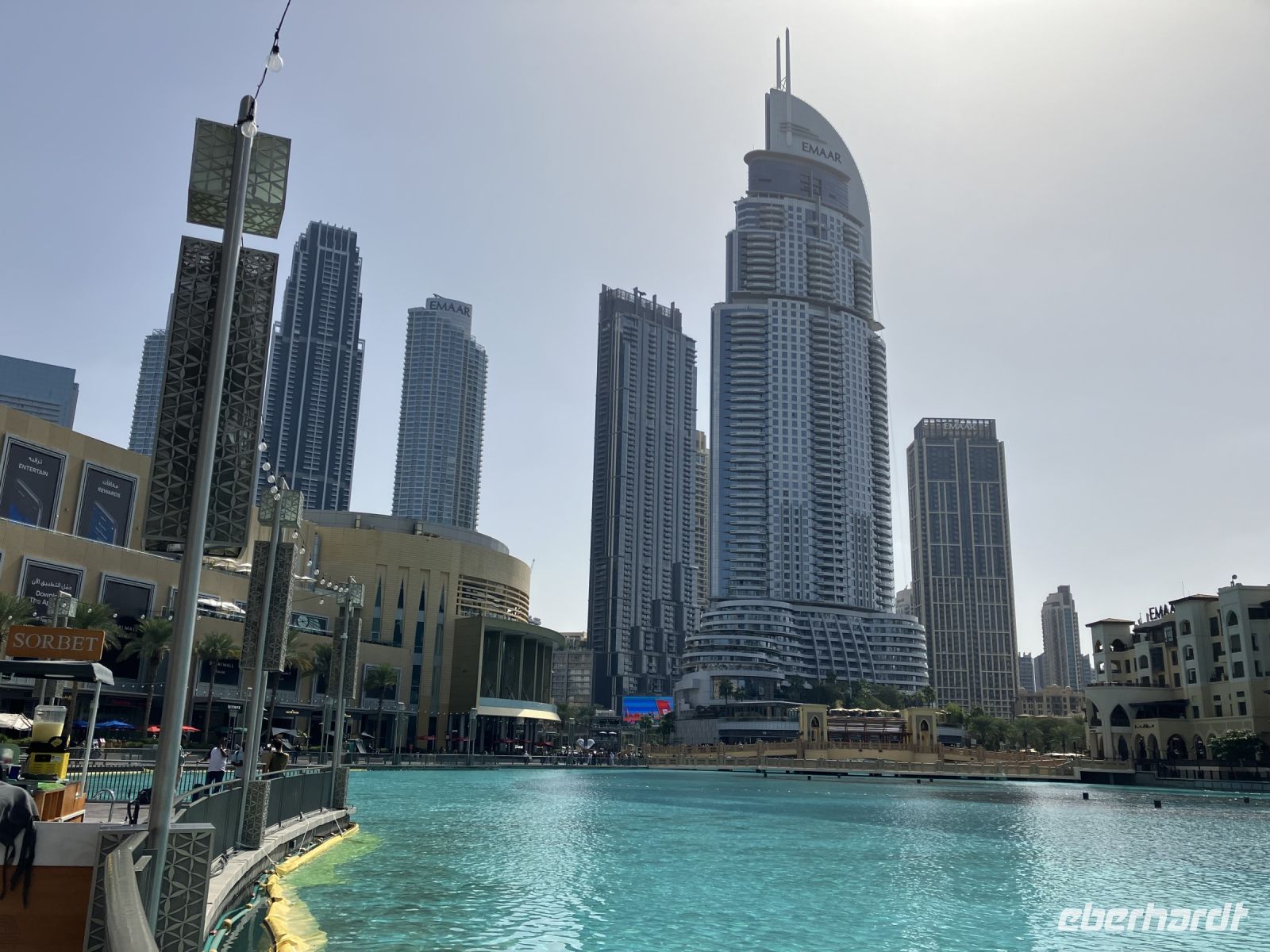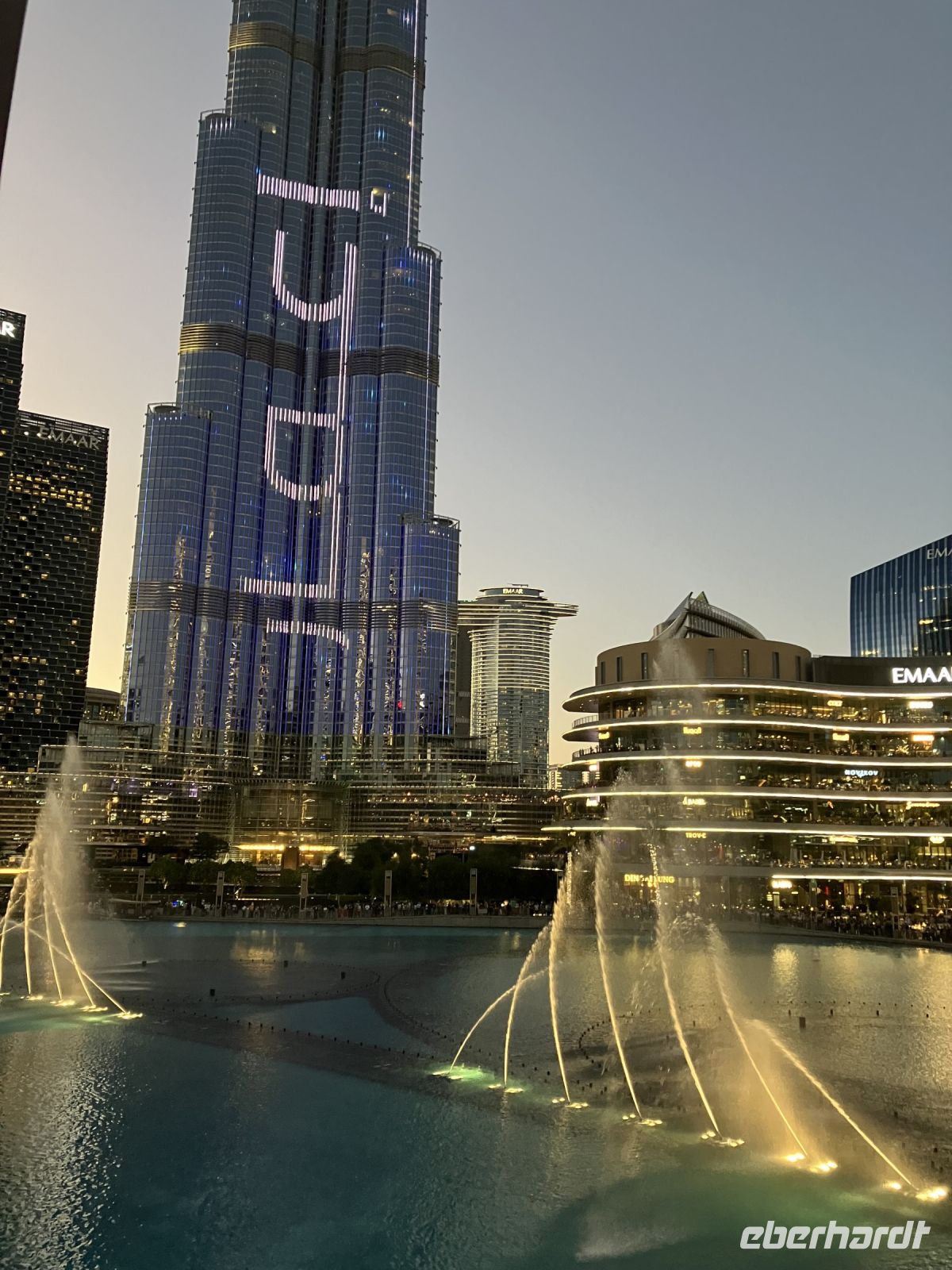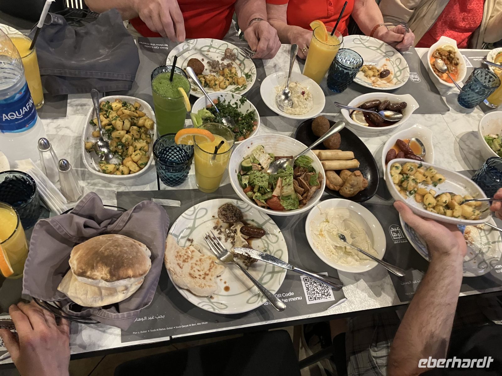 Der Abend lockte mit vorzüglichem arabischen Essen im Souk Al Bahar, aber vor allem mit den Wasserspielen und dem bunt beleuchteten Burj Khalifa, der im allgemeinen Fokus des Interesses stand. Erst nahmen die Wasserfontänen unsere volle Aufmerksamkeit in Anspruch, doch nach und nach hing der Blick auch des Öfteren an den unterschiedlichen exzellenten Speisen. Tabouleh, der Petersiliensalat mit Tomate, Lammfleisch, Hühnchen oder Hummus – für jeden Geschmack war etwas dabei und mutig probierten wir uns durch die unbekannten Gerichte.