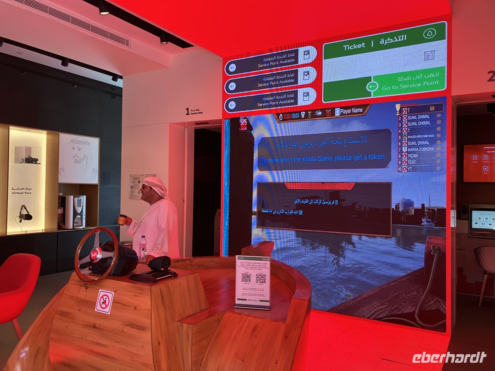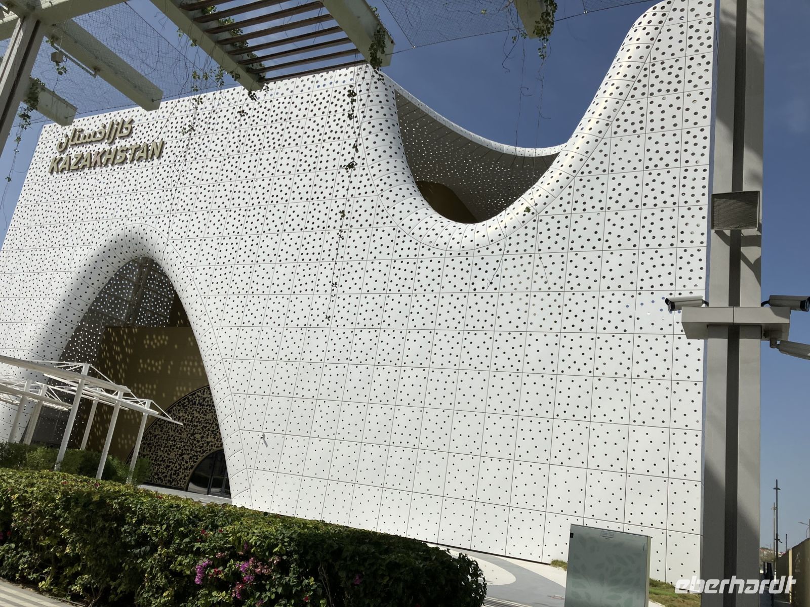 Im Anschluss genossen wir leckeres arabisches Essen und schon begaben wir uns auf weitere Erkundungstouren. Gemeinsam mit Reisebegleiterin Sabine statteten wir nun Terra, dem Nachhaltigkeits-Pavillion einen Besuch ab. Mit kleinen elektrischen Autos fuhren wir vorbei an weiteren futuristisch wirkenden Gebäuden, wie dem Haus von Kasachstan, zum Eingang. Vorbei an Flora, die aus den umliegenden Wüsten geholt und an einigen Arten, die noch nie von Menschen kultiviert wurden, ging es durch eine Art Vor-Garten hinein in den Gebäudekomplex, bei dem man die isolierenden Eigenschaften der Erde nutzbar machen wollte. Der größte Teil des Gebäudes befindet sich unterirdisch. Doch zuerst hielten uns viele kleine und große Spiele im Vorraum von unserem Rundgang ab.