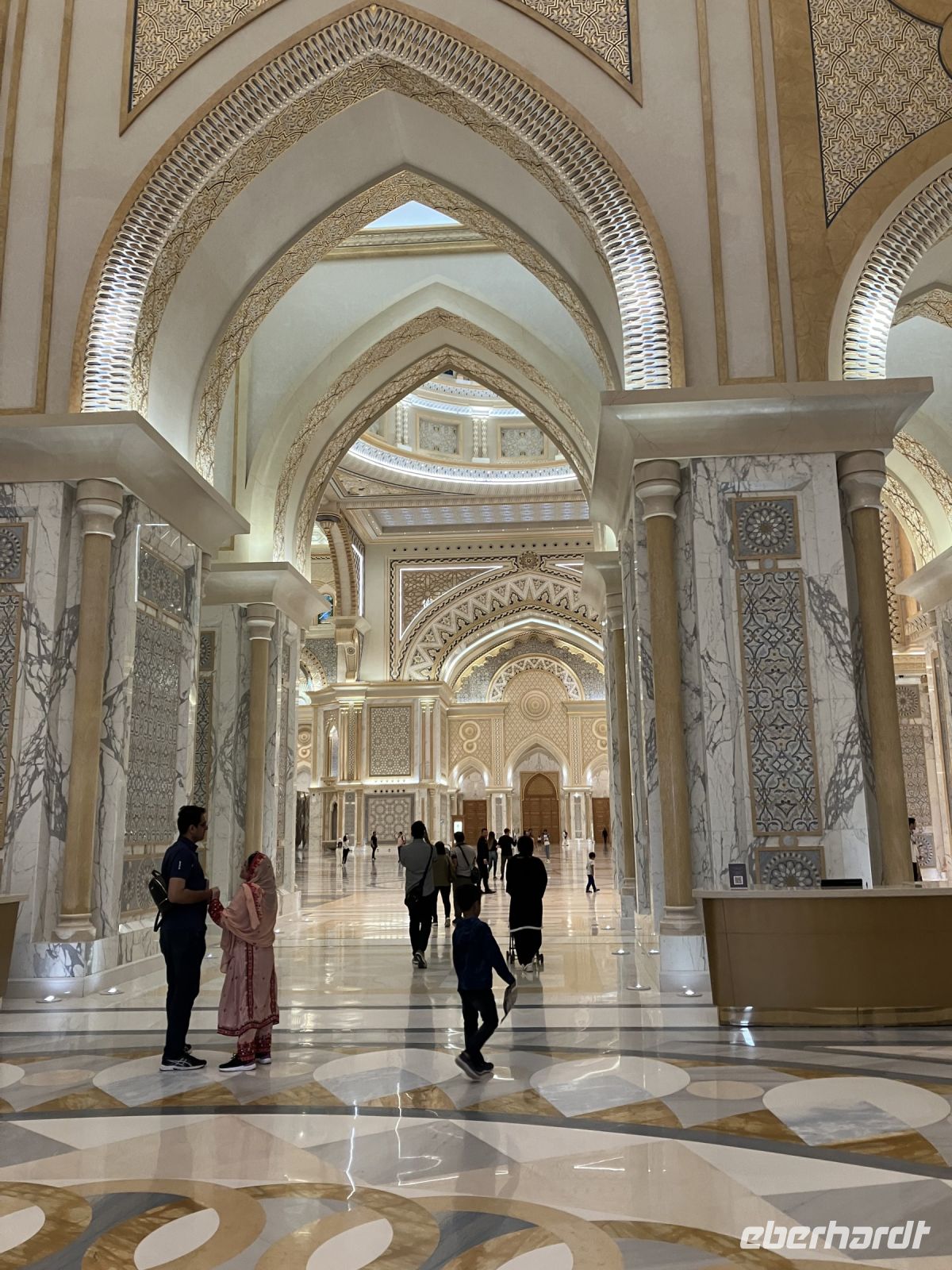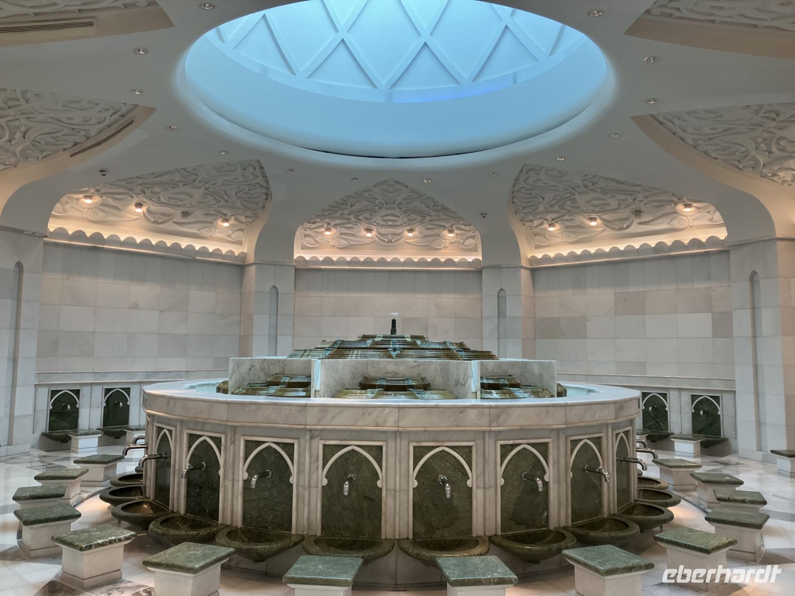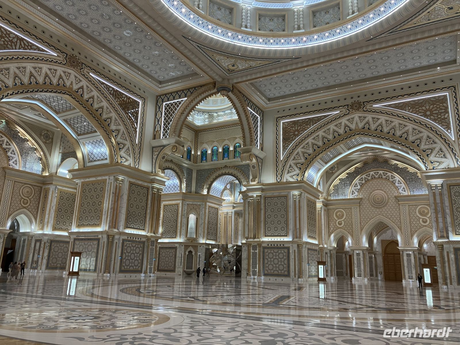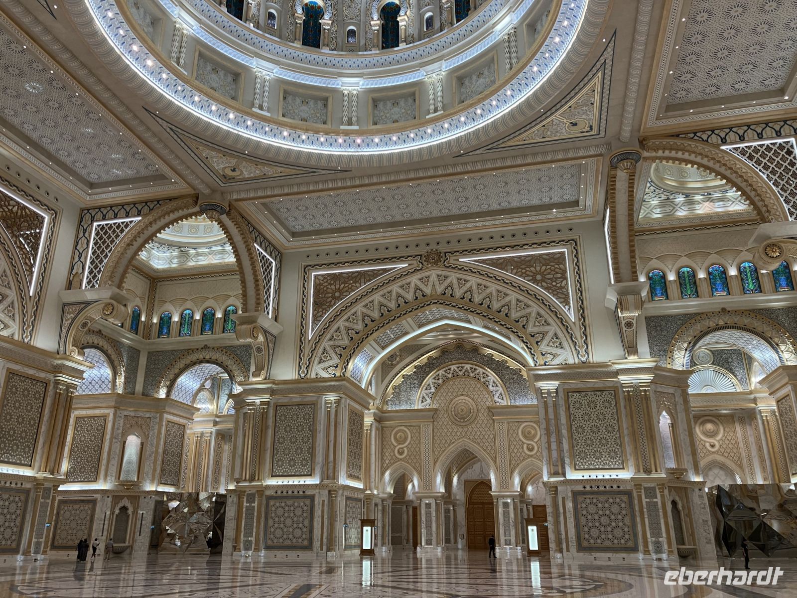 Während wir auf unsere Platz-Zuweisung warteten, standen wir staunend unter der spektakulären 72,6 Meter hohen Kuppel, die größer als die St. Paul's Kathedrale ist. Alles hier sind Superlative: mehr als 114 Kuppeln, 1.002 Kristalllüster, in etwa 92.900 m² Marmor, sage und schreibe 200 Brunnen, einen Triumphbogen und zu guter Letzt noch unberührter Sand aus Algerien für einen leuchtend weißen Strand.
