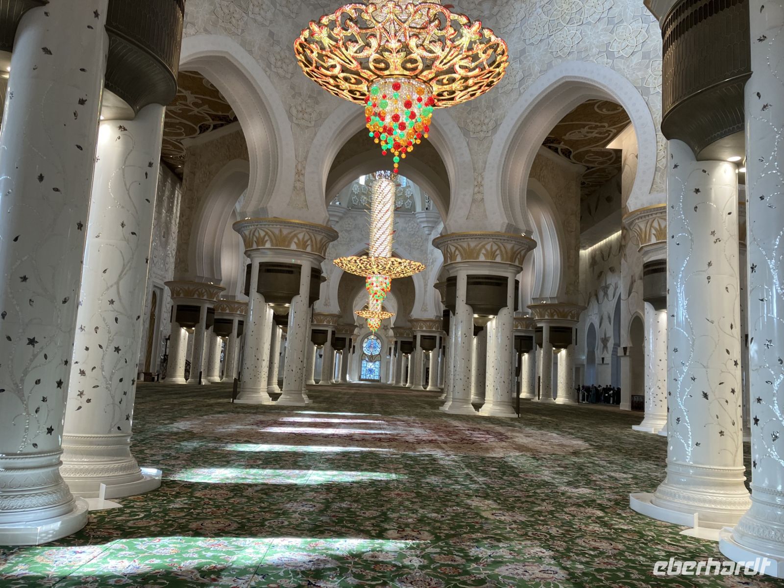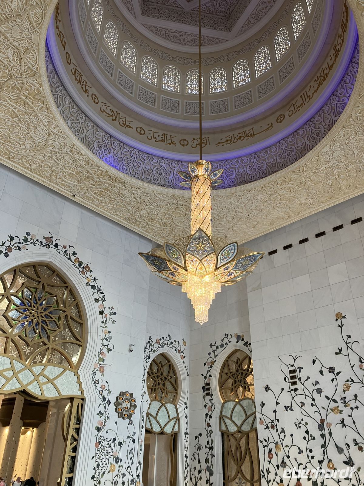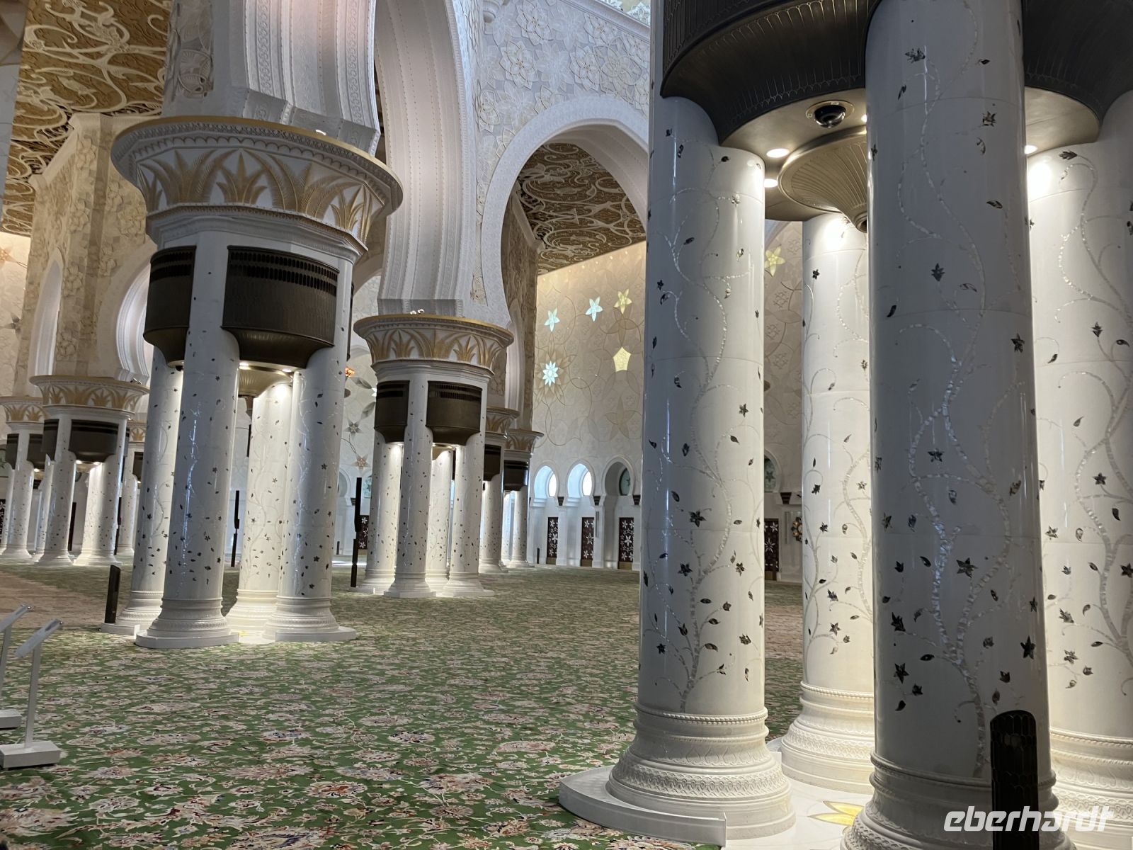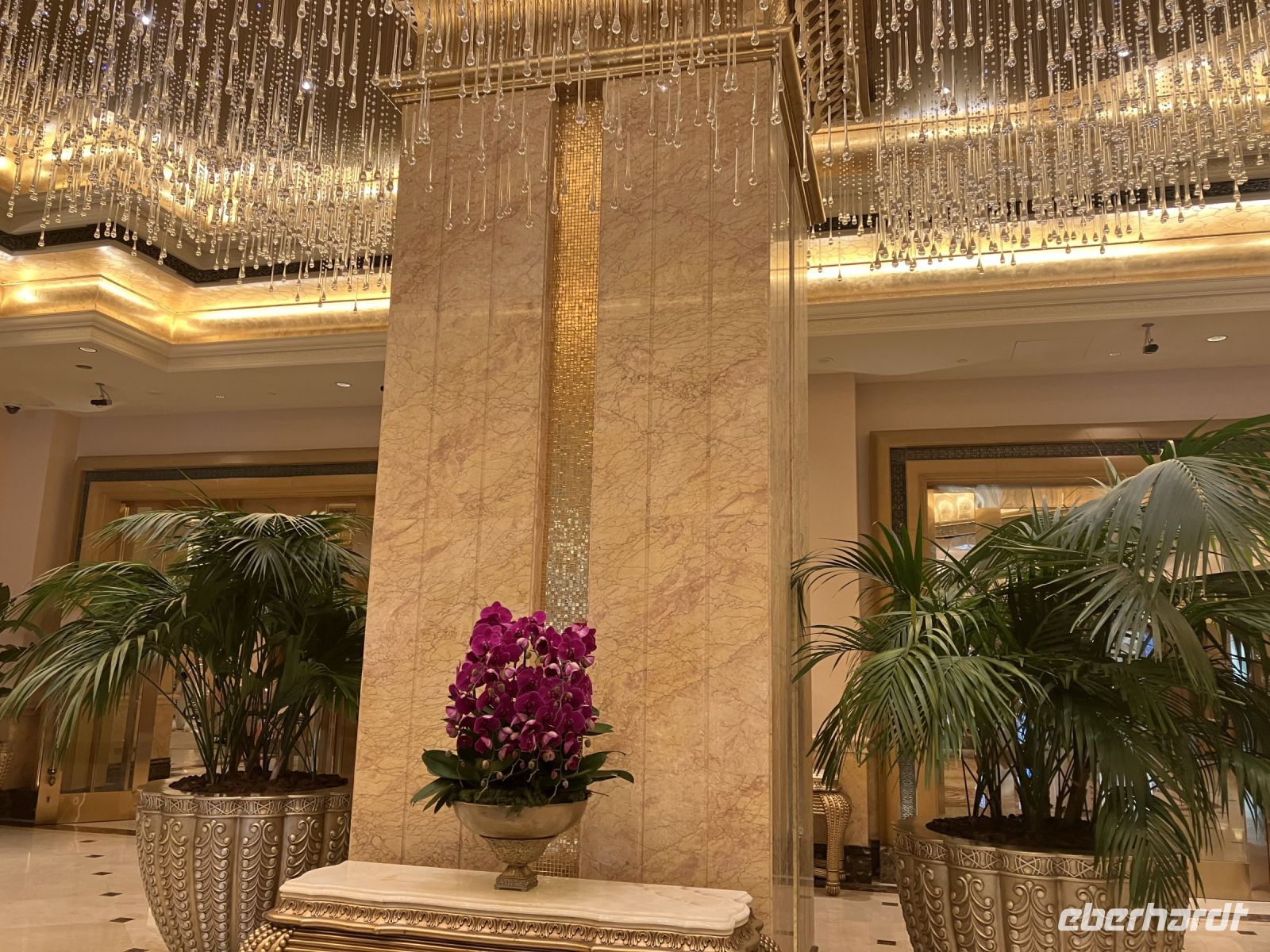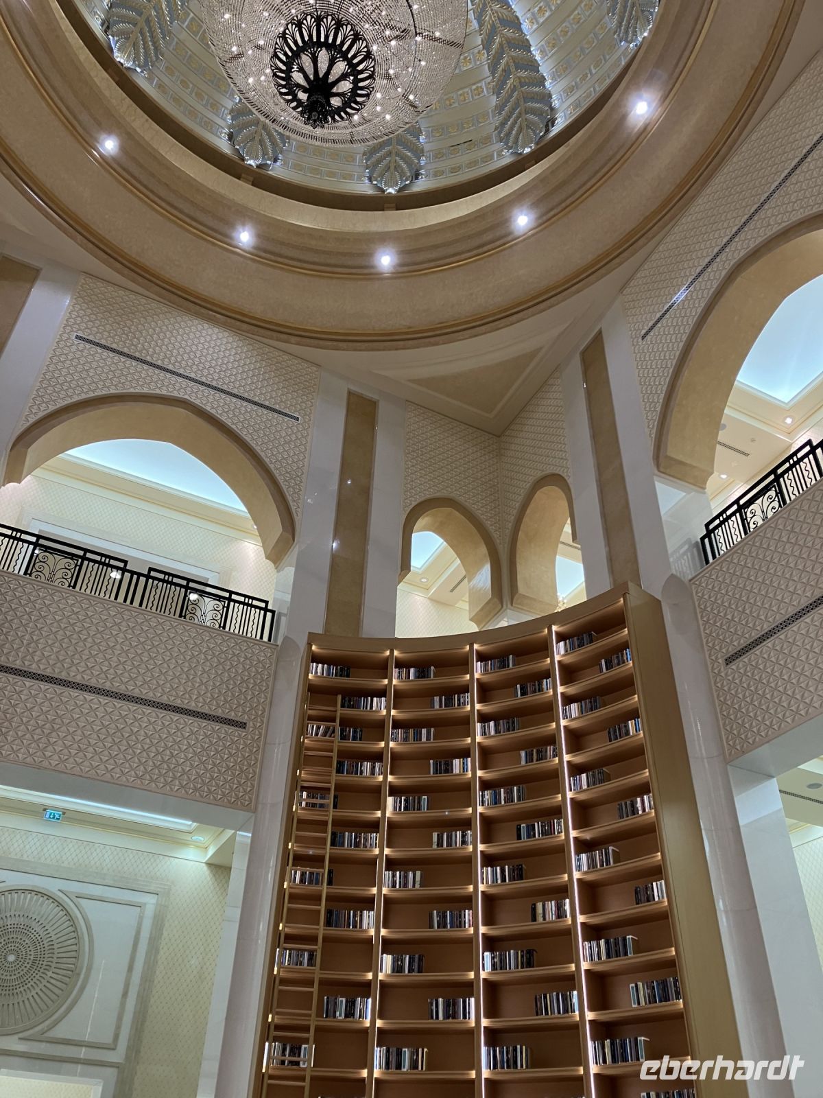 Während wir auf unsere Platz-Zuweisung warteten, standen wir staunend unter der spektakulären 72,6 Meter hohen Kuppel, die größer als die St. Paul's Kathedrale ist. Alles hier sind Superlative: mehr als 114 Kuppeln, 1.002 Kristalllüster, in etwa 92.900 m² Marmor, sage und schreibe 200 Brunnen, einen Triumphbogen und zu guter Letzt noch unberührter Sand aus Algerien für einen leuchtend weißen Strand.