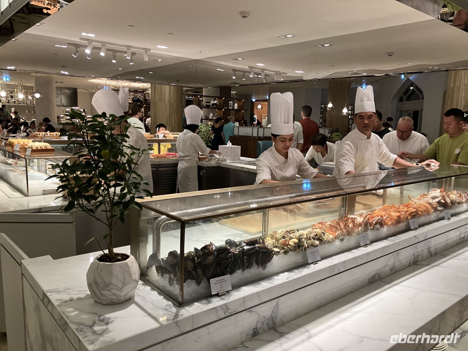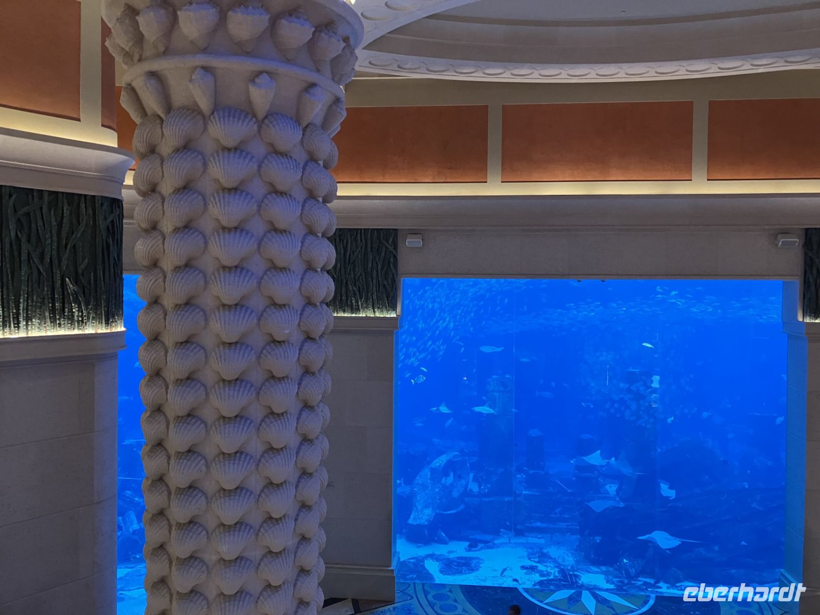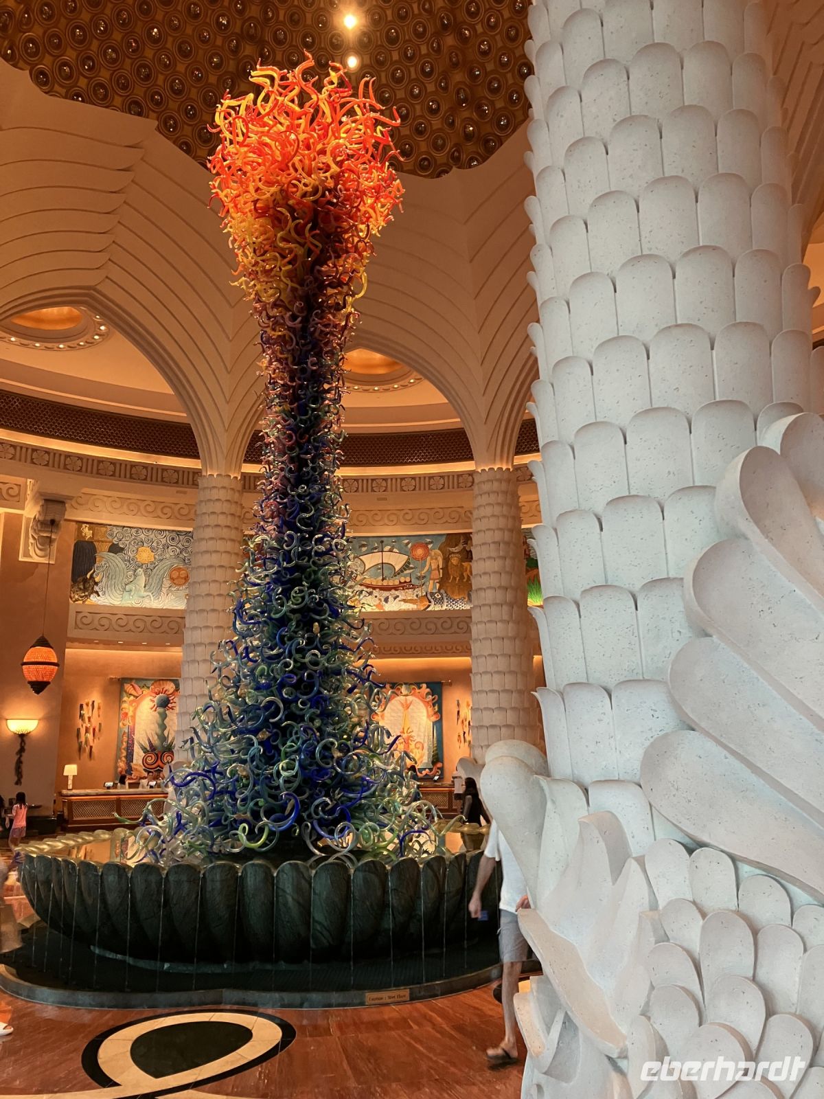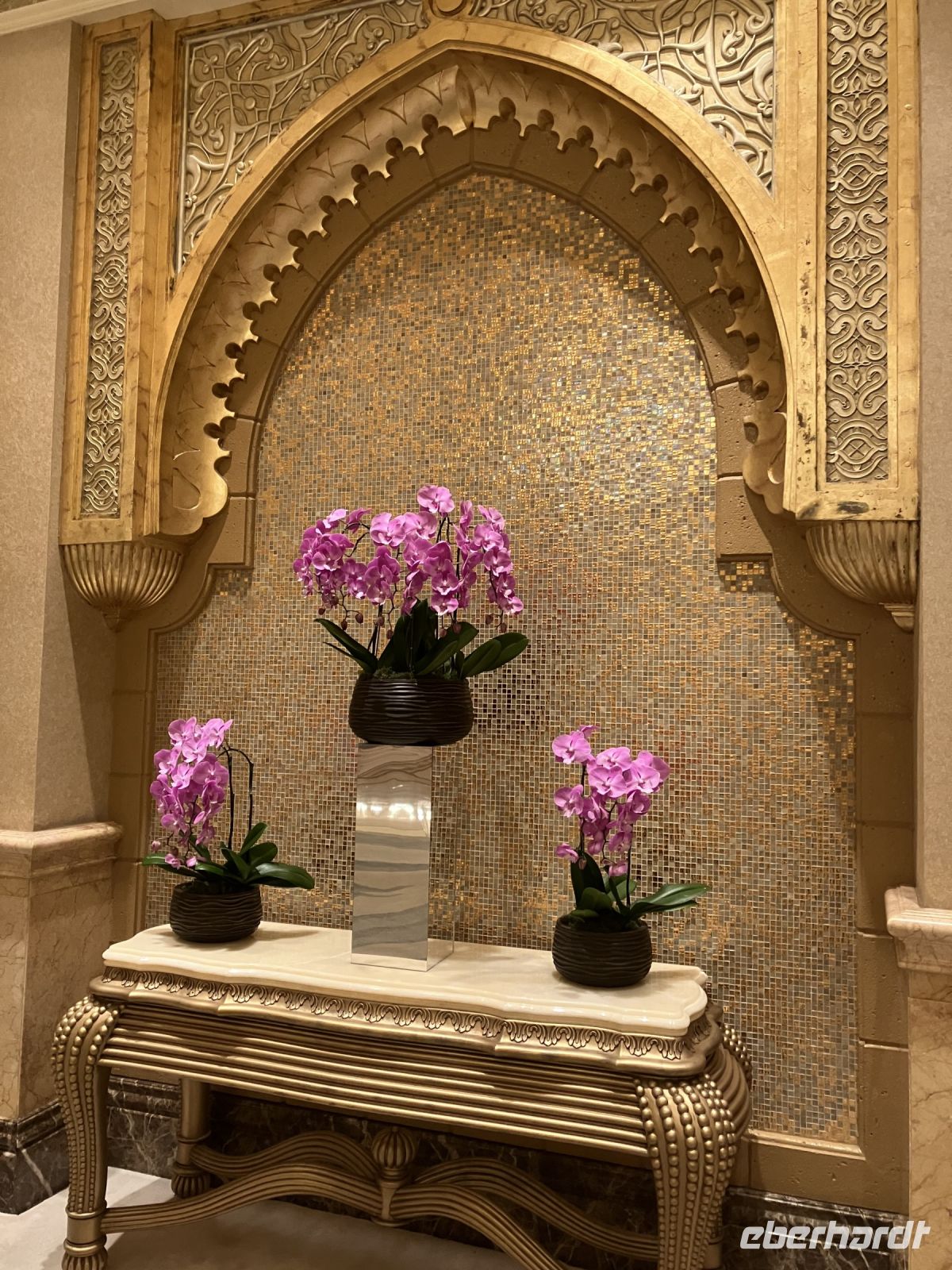 Während wir auf unsere Platz-Zuweisung warteten, standen wir staunend unter der spektakulären 72,6 Meter hohen Kuppel, die größer als die St. Paul's Kathedrale ist. Alles hier sind Superlative: mehr als 114 Kuppeln, 1.002 Kristalllüster, in etwa 92.900 m² Marmor, sage und schreibe 200 Brunnen, einen Triumphbogen und zu guter Letzt noch unberührter Sand aus Algerien für einen leuchtend weißen Strand.
