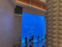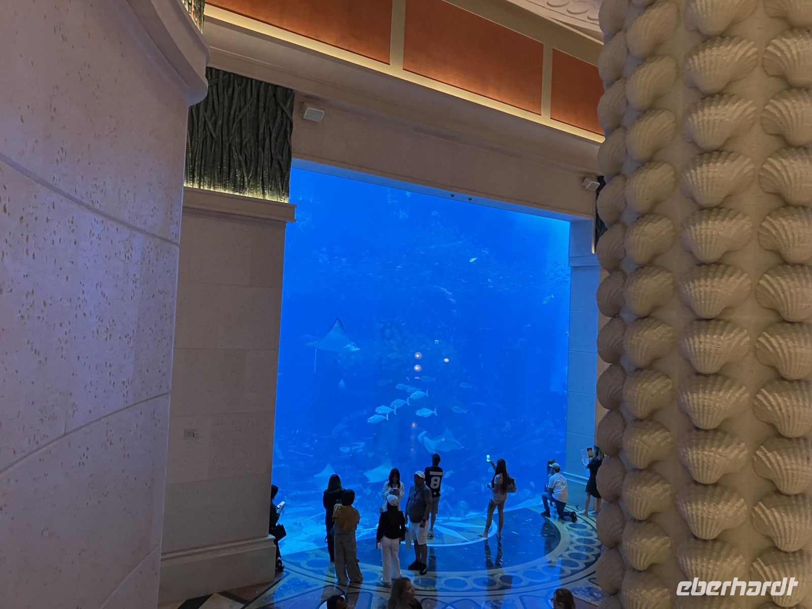 Zum Abschluss des Tages erwartete uns das rätselhafte Atlantis. Fuhren wir mit der Magnetschwebebahn wirklich Platons Insel entgegen oder blieb es nur eine Fantasie? Die Palmeninsel mit dem Hotel "Atlantis The Palm" begrüßte uns mit maritimer Dekoration und dem, sich mitten im Hotel befindlichen riesigen Meereswasser-Aquarium. Das Buffet lies keine Wünsche offen. Überall gab es kleine Stände, hier Sushi und Langusten, dort gebratene Ente, an anderer Stelle indischen Reis und nicht zu vergessen, eine große Schokoladen-Fontaine. Wir bedauerten es sehr, dass wir unmöglich von all den leckeren Speisen probieren konnten. Die kleinen Süßigkeiten sahen zu verlockend aus.