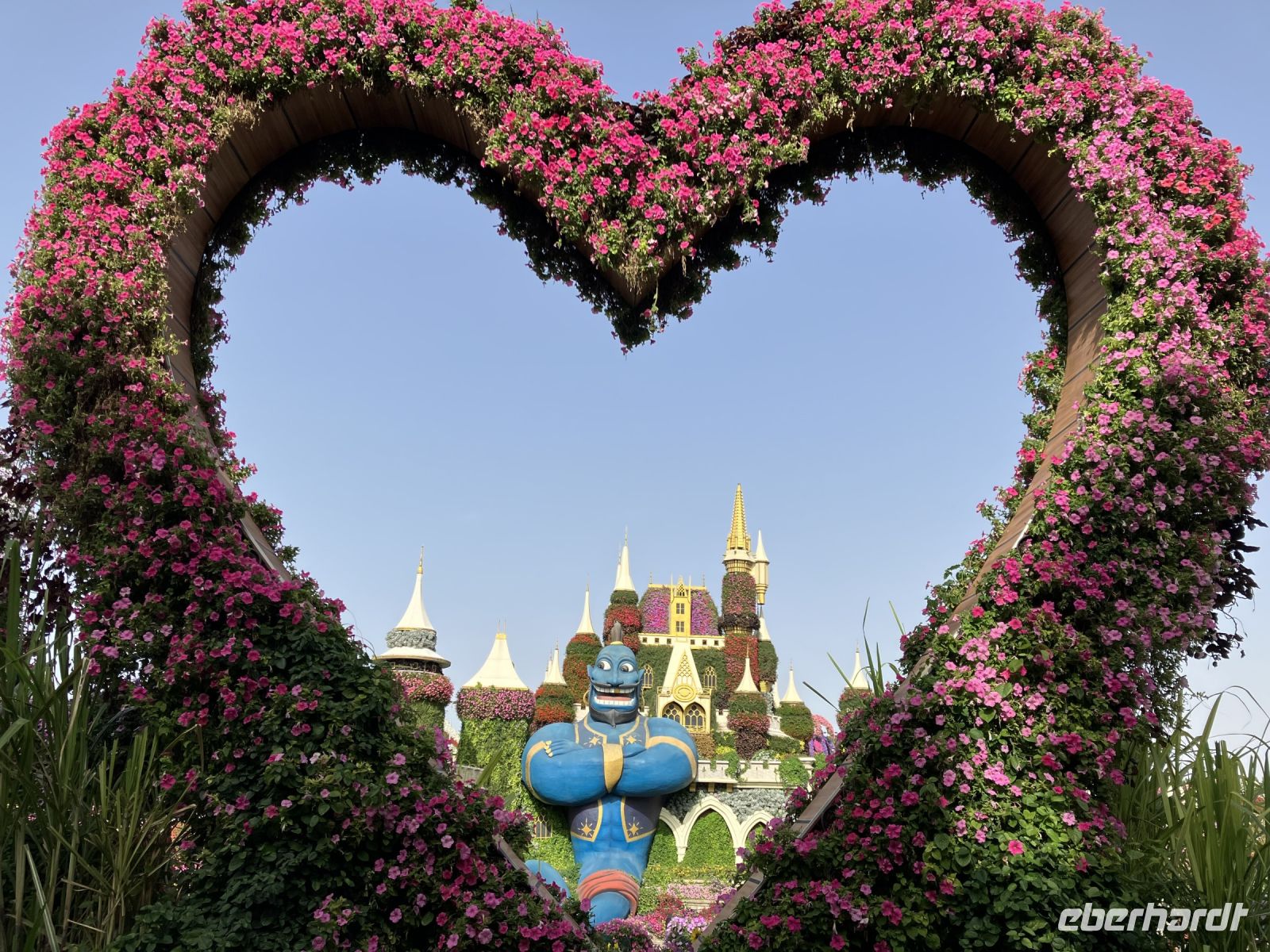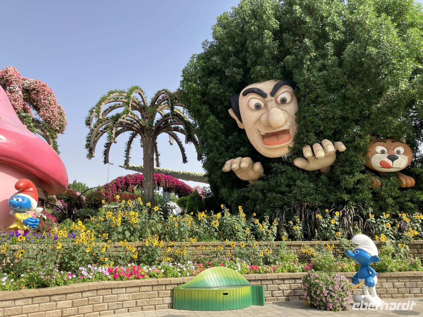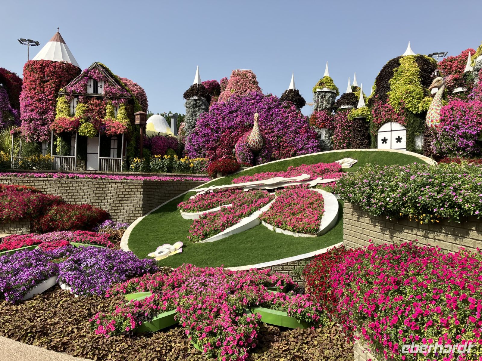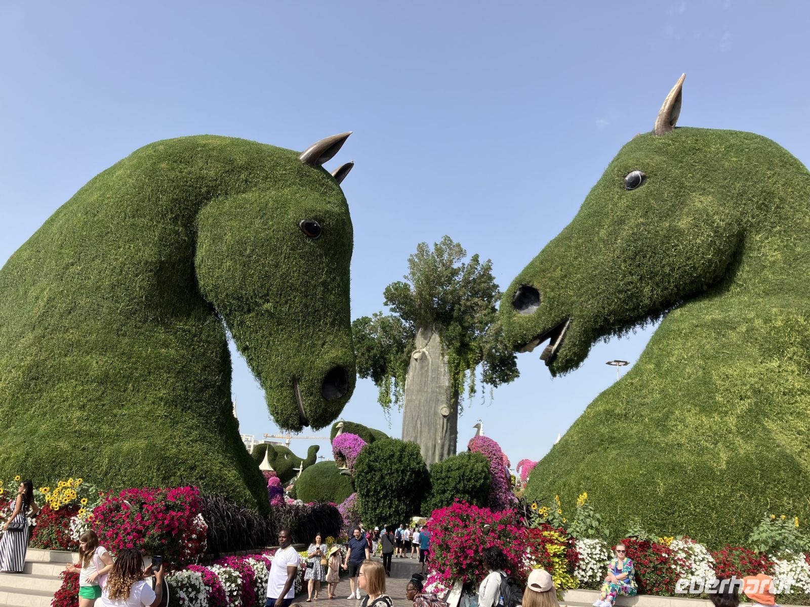 Nach so viel Historie tauchten wir ein in die Welt der Wunder. Farbenprächtig präsentierte sich uns der Miracle Garden. Plötzlich erschienen vor uns zwei riesige grüne Pferdeköpfe, begleitet von leuchtenden Pfauen an beiden Seiten und eingebettet in ein Meer von Petunien. Schaute da nicht Gargamel auf der Suche nach Papa Schlumpf zwischen den Bäumen hervor? Nur zu gern ließen wir uns von dieser Zauberwelt gefangen nehmen, bevor uns wieder die modernen Märchen aus 1001 einfingen.