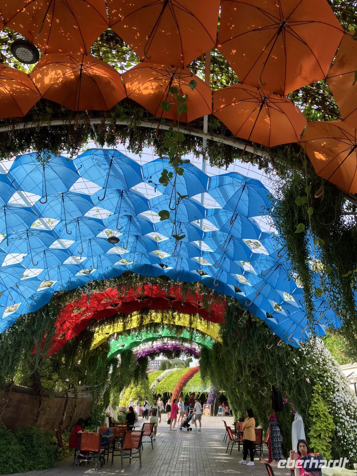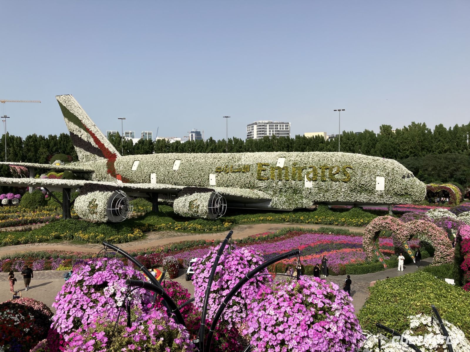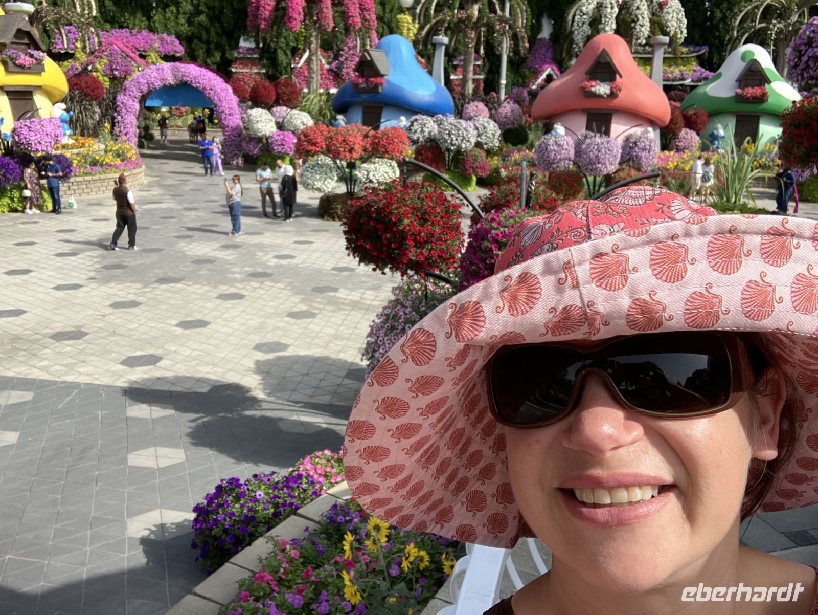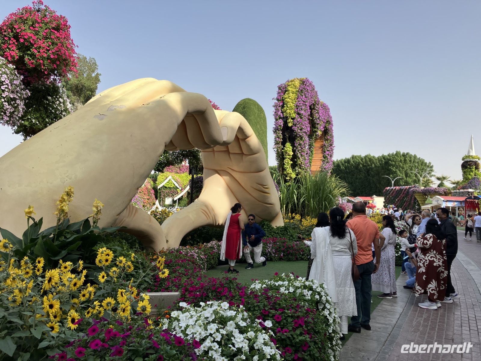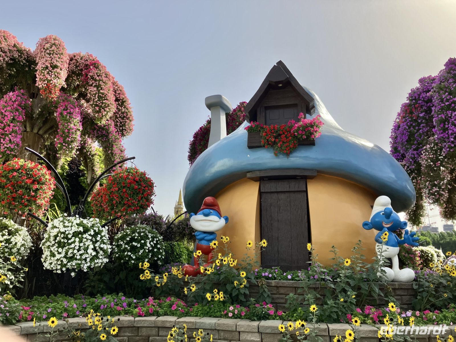 Nach so viel Historie tauchten wir ein in die Welt der Wunder. Farbenprächtig präsentierte sich uns der Miracle Garden. Plötzlich erschienen vor uns zwei riesige grüne Pferdeköpfe, begleitet von leuchtenden Pfauen an beiden Seiten und eingebettet in ein Meer von Petunien. Schaute da nicht Gargamel auf der Suche nach Papa Schlumpf zwischen den Bäumen hervor? Nur zu gern ließen wir uns von dieser Zauberwelt gefangen nehmen, bevor uns wieder die modernen Märchen aus 1001 einfingen.