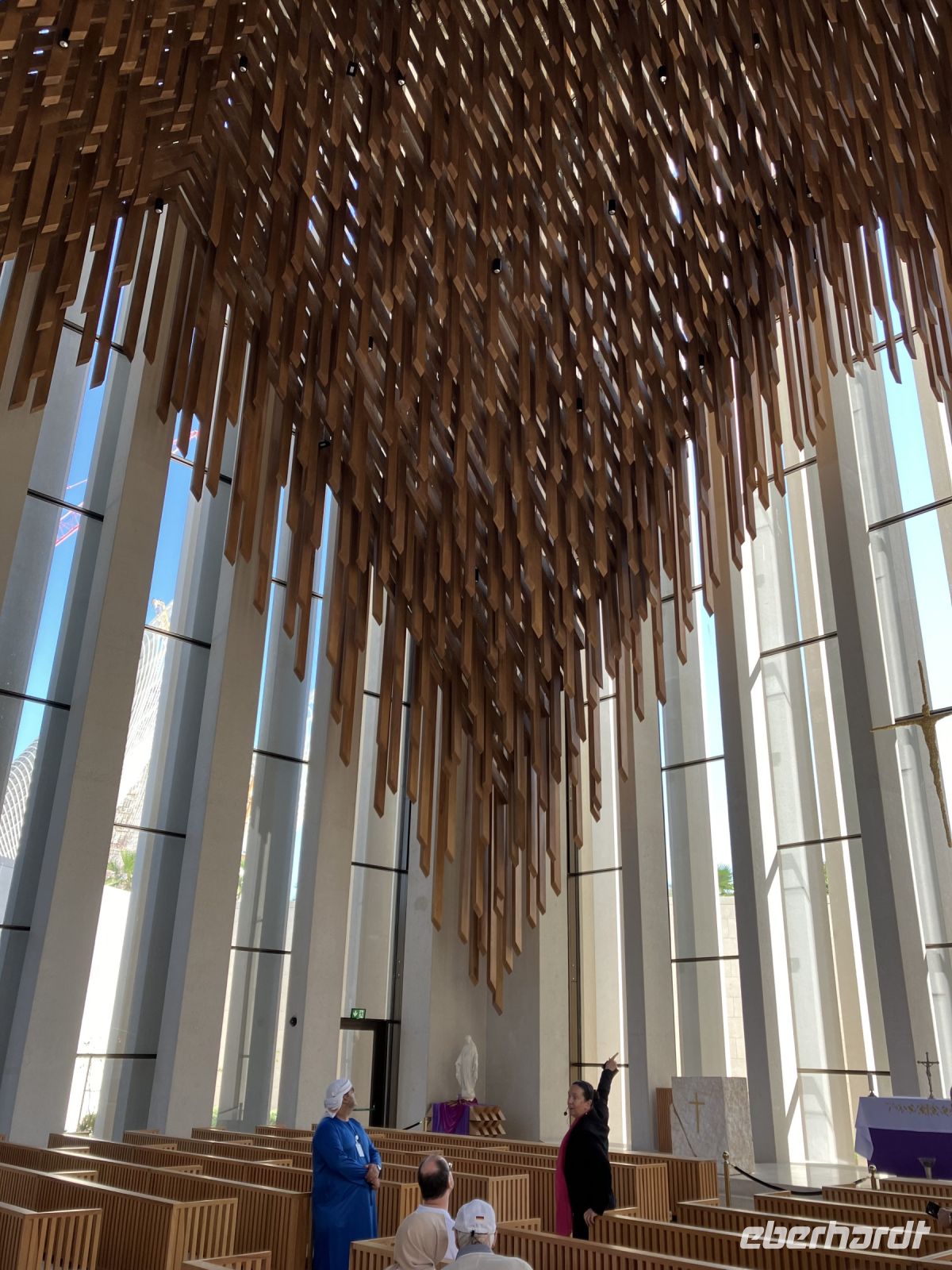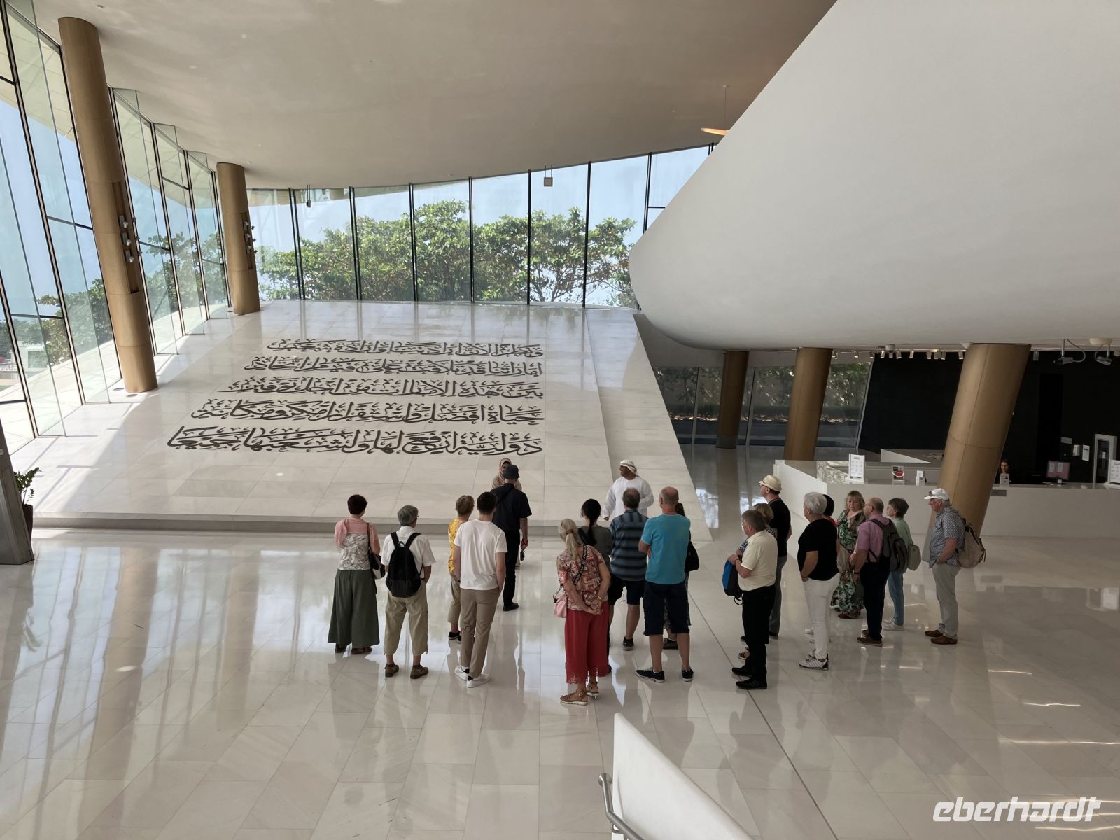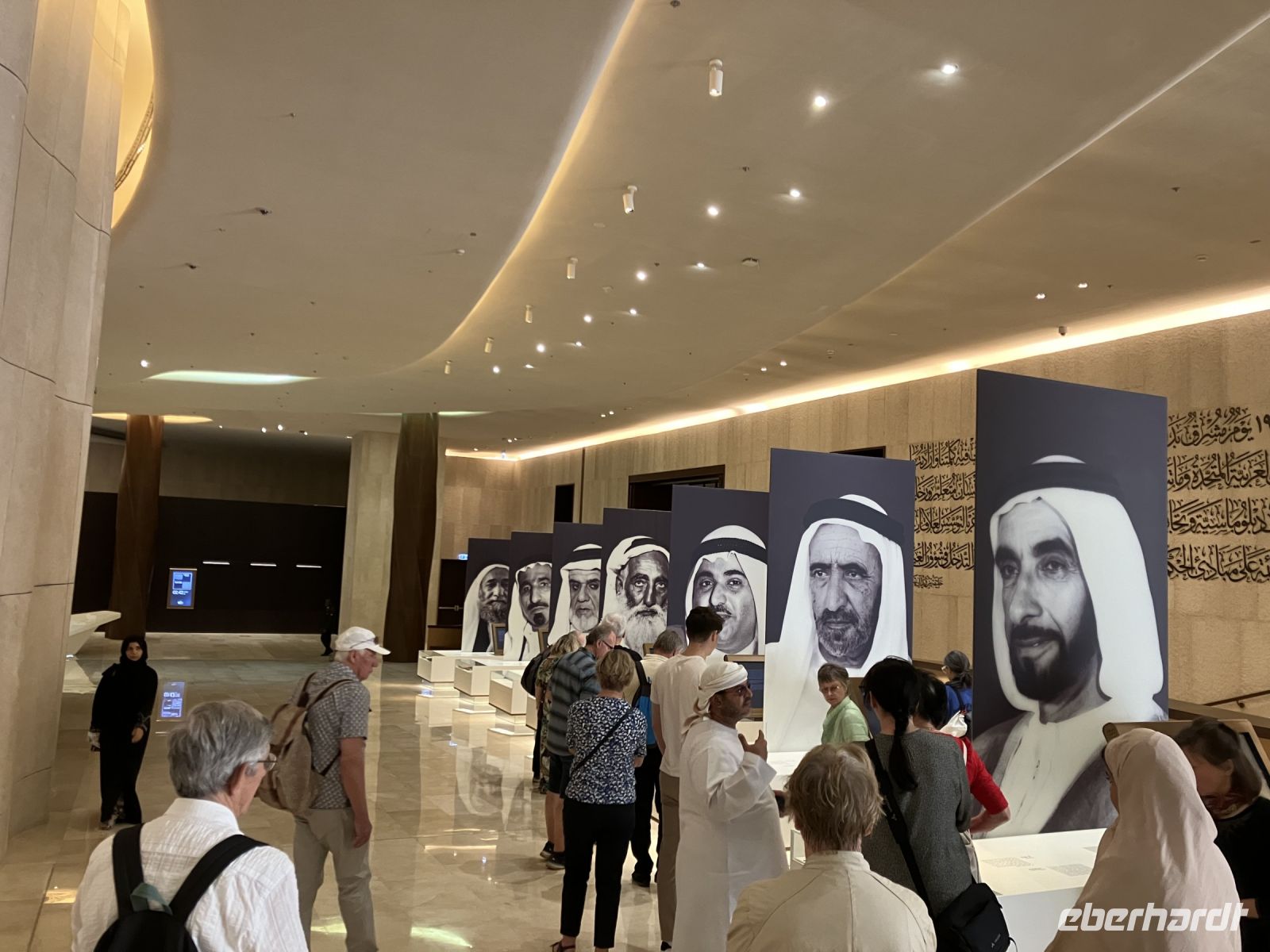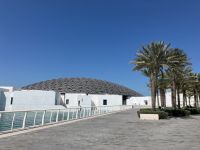 Erst im vergangenen Jahr fertig gestellt, wurde das Abrahamic Family House gleich von Eberhardt Travel als neue Attraktion mit ins Programm aufgenommen. Das Abrahamic Family House umfasst drei separate Gotteshäuser, die Scheich Ahmed El Tayeb Moschee, die Hl. Franz von Assisi Kirche Abu Dhabi und die Moses Ben Maimon Synagoge, sowie gemeinsame Räume für Begegnungen und Dialog, die wir mit einer kompetenten Gästeführerin kennenlernen durften. Außerdem stand an diesem Tag auch noch der Louvre von Abu Dhabi auf dem Programm, der sich sozusagen gleich um die Ecke befindet. Als erstes bewunderten wir die einzigartige, lichtdurchlässige Kuppel vom französischen Stararchitekt Jean Nouvel. Wie Palmenblätter in einer Oase soll sie Schatten spenden als auch das Licht einlassen. Von überall her drang Stimmengewirr an unsere Ohren; Schulklassen, Touristen aus aller Welt, Künstler. Einige junge Mädchen flitzten an uns vorbei mit dem Handy verschiedene Exponate fotografierend. Die Gruppe zerteilte sich, jeder ging in seinem Tempo oder suchte bestimmte Ausstellungsstücke, z.B. Leihgaben des Musée du Louvre, Musée d’Orsay und Centre Pompidou aus Frankreich. Sicherlich konnten wir nicht allen Objekten unsere Aufmerksamkeit schenken, da die Zeit wie immer bei Gruppenreisen begrenzt war.