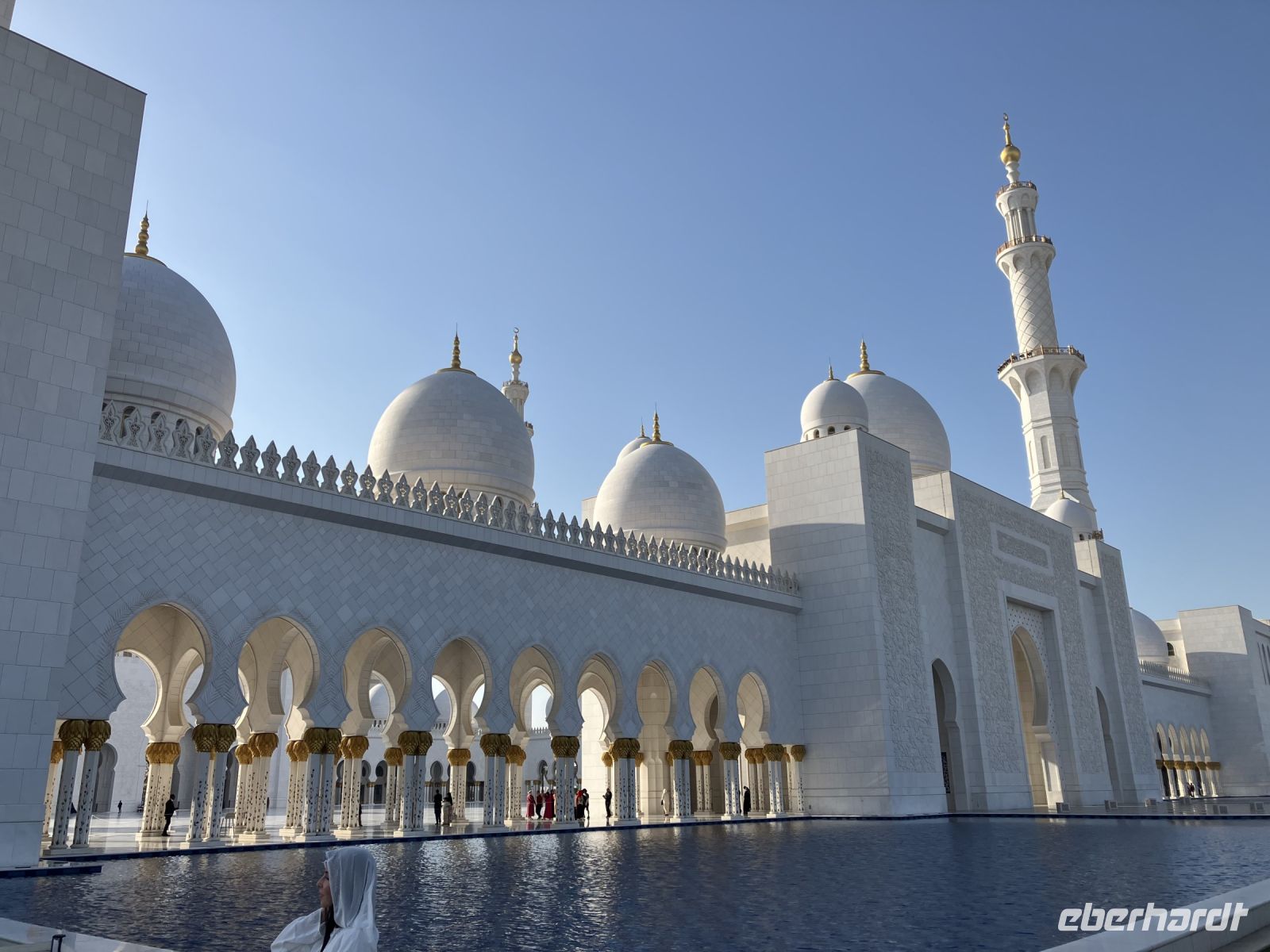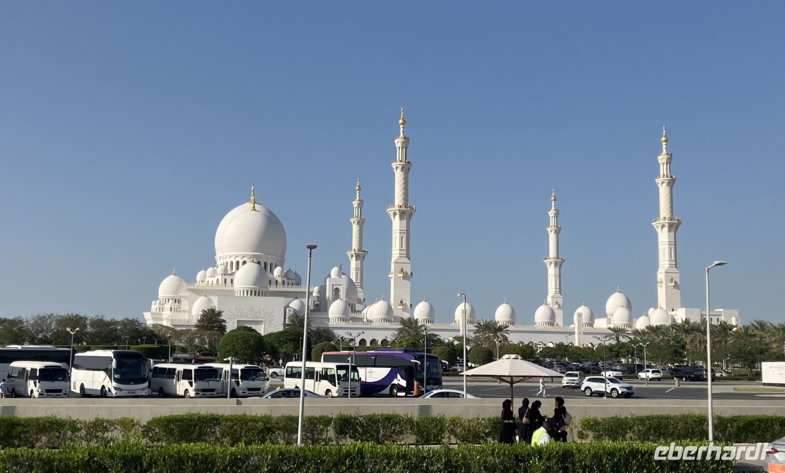Schnell die Kleidung gewechselt, die Tücher um Schulter und Kopf gewirbelt, damit wir dem Dresscode der weltberühmte Sheikh Zayed Grand-Moschee entsprachen. Die Erwartung wird auch hier von Anfang an erhöht. Erst durchquerten wir ein Einkaufszentrum, liefen durch lange Gänge über Laufbänder bis zum Eingang dieses architektonischen Kunstwerkes. Die Moschee gehört zu den größten Moscheen der Welt und bleibt uns mit ihrer weißen Pracht und den wundervoll geformten Kuppeln noch lange in Erinnerung. Der Rundgang war ein fantastischer Abschluss unserer Reise in die Vereinigten Arabischen Emirate.