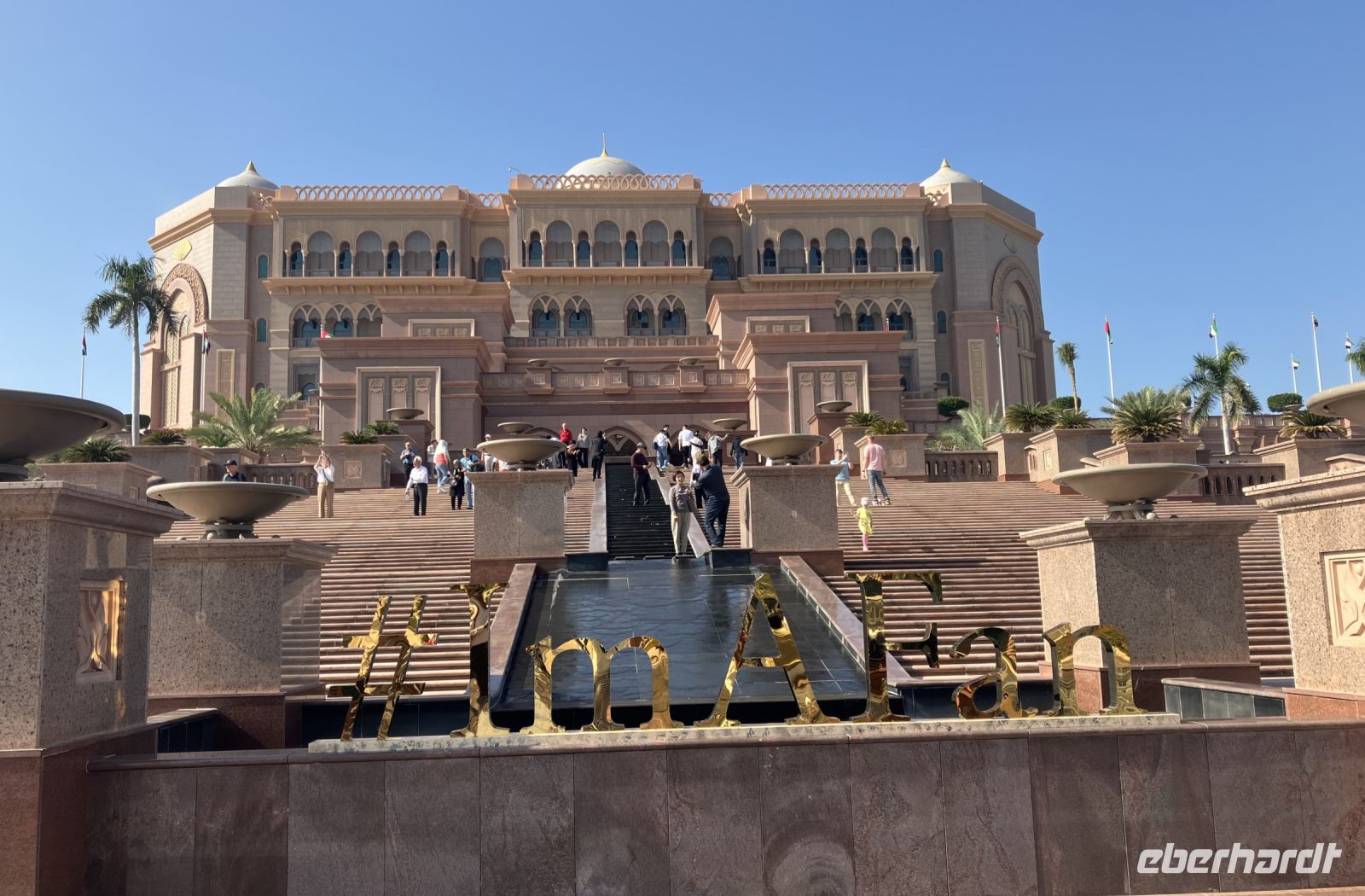 In eleganter Kleidung trafen wir uns später zu unserem heutigen Ausflug, denn schließlich geht man nicht jeden Tag zur Teestunde in den Emirates Palace, das nicht nur von unserem Hotel aus, sondern bereits aus mehreren Kilometern Entfernung zu sehen ist. Wir fuhren zum Eingang durch weitläufige Gärten, vorbei an Wasserfontänen und unter Bögen hindurch. Es stimmt, was von Jeremy Heyes, einem der Architekten gesagt wurde: "Die Ankunftssequenz soll die Erwartungen steigern.“
