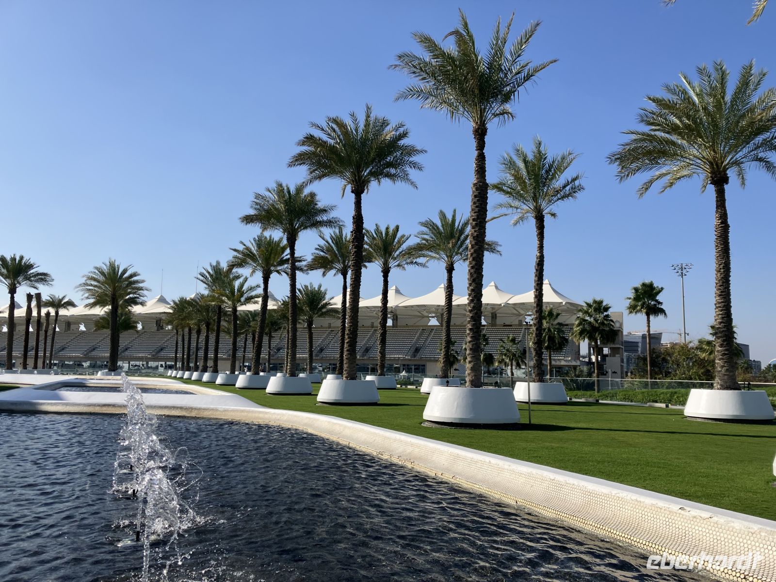 Daumen drückend fuhren wir Richtung Yas Island, eine der größten Inseln im Emirat Abu Dhabi. Wenn kein Security-Posten am Yas Hotel stand, konnten wir womöglich einen Blick auf die Formel 1-Rennstrecke werfen. Wir hatten Glück! Für einige Gäste war dies der Höhepunkt des Tages. Und es ergab sich nicht nur die Möglichkeit, einen erstklassischen Blick auf die von dem deutschen Rennstrecken-Designer Herrmann Tilke entworfene 5,281 km lange Strecke zu werfen, sondern genau vor unseren Augen rauschten die laut dröhnenden Wagen bei einer Probefahrt vorbei. Es dauerte eine Weile, bis sich alle von diesem Sound lösen konnten.