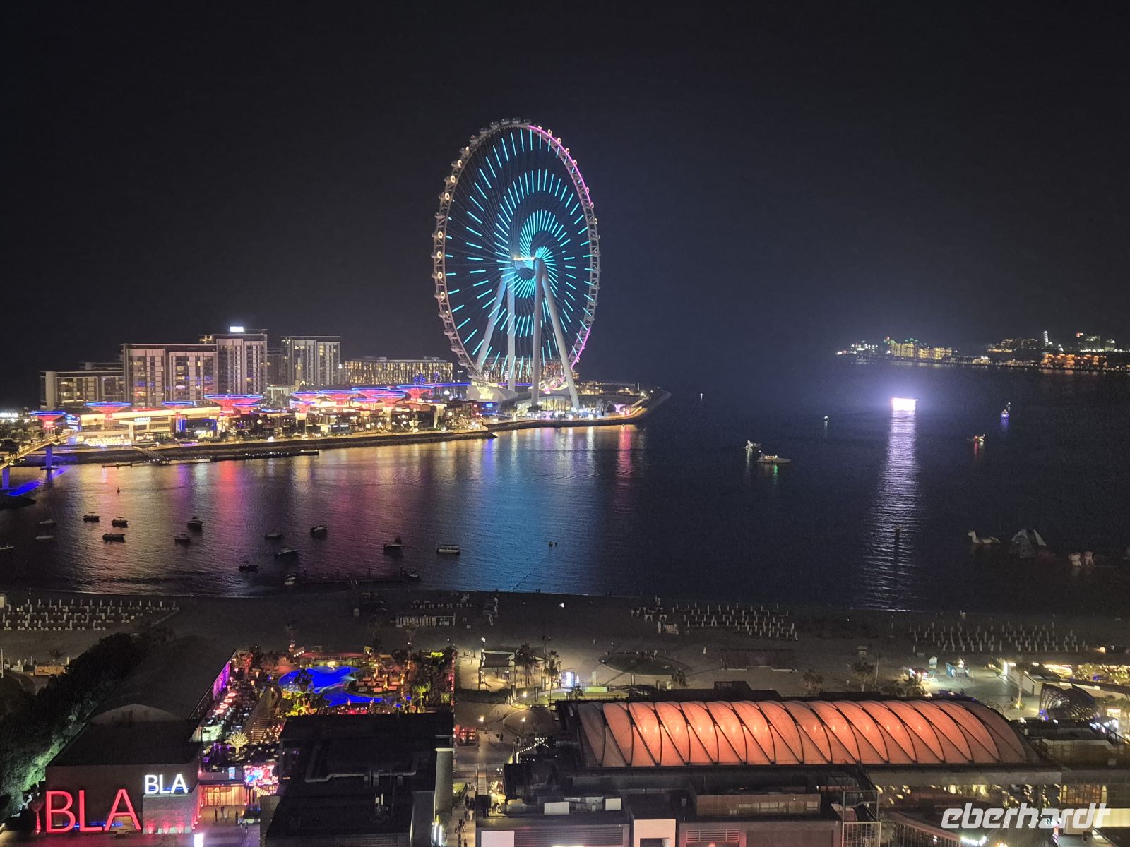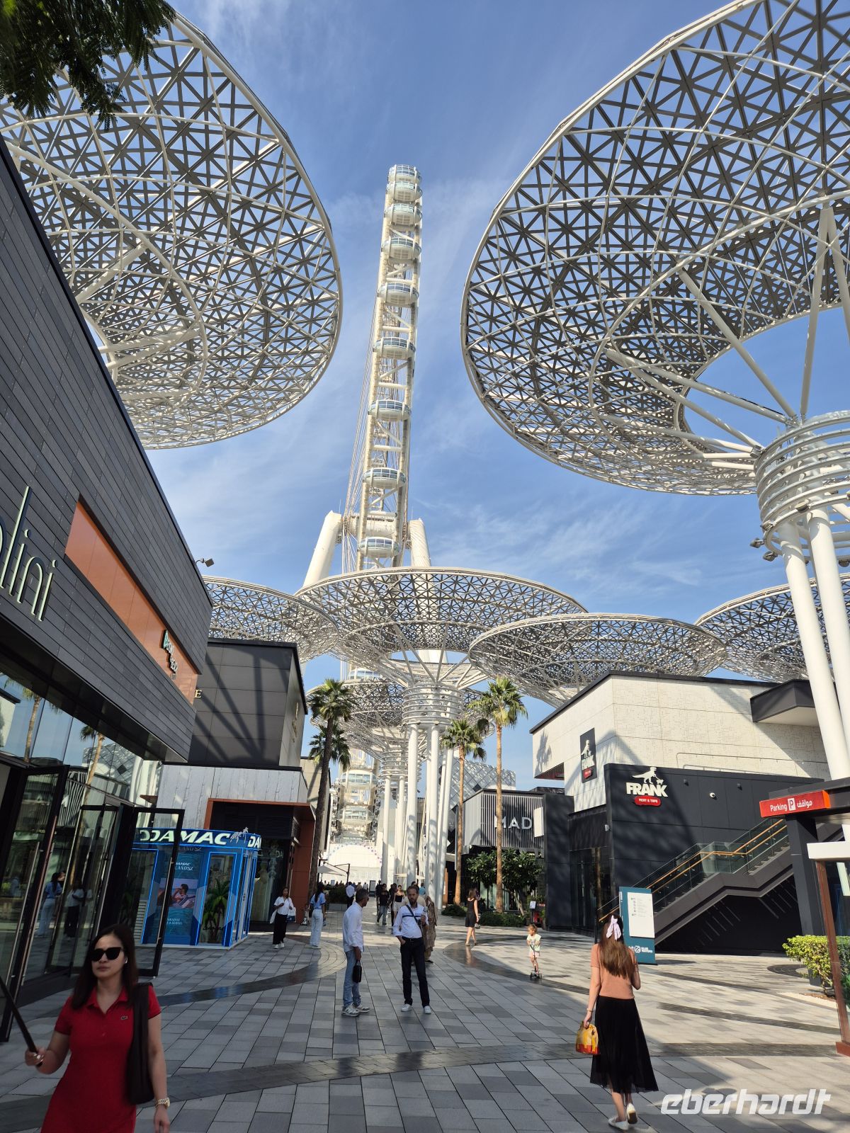 In der Dubai Marina gehen wir bei strahlendem Sonnenschein und sommerlichen Temperaturen von heute bis zu 30 Grad an Bord einer Yacht, die exklusiv für uns gebucht wurde. Die zweistündige Yachtfahrt führt uns durch Dubai Marina Richtung Palminsel Palm Jumairah bis zur Aussicht auf den Burj Al Arab. Nach einer Pause in der Marina Mall für Geldtausch und Snackeinkauf geht es weiter zum dieses Jahr wieder eröffneten Dubai Eye. Der 21.10.21 war das Eröffnungsdatum des Ain Dubai, englisch Dubai Eye, wie man das Riesenrad hier nennt. Es ist mit 250 Meter das weltgrößte Riesenrad. Nach einem Sandsturm und nicht näher genannten Gründen, war es drei Jahre außer Betrieb. Bei laufender Fahrt des Riesenrades betreten wir eine der 48 Gondeln. Diese haben wir exklusiv für uns allein. Die Sicht ist gut, wir haben einen tollen Ausblick auf die Wolkenkratzer der Marina, das markante Adress Hotel riesigem Pool in der Höhe, auf den Arabischen Golf und die Palminsel. Nach einer Umdrehung in 40 Minuten ist die Fahrt beendet. Wir haben heute noch zwei Besichtigungen geplant: Am Nachmittag sind wir im Stadtteil Jumairah am Ufer des Arabischen Golfs, um den Souk Madinat Jumeirah zu besuchen. Manche hier bezeichnen das Viertel aufgrund der Kanäle auch als „Kleinvenedig“. Aber die Bauweise mit der traditionellen Windturmarchitektur hat hier in der Golfregion ihre Ursprünge. Ein beliebtes Fotomotiv ist der Blick von hier auf das Luxushotel Burj Al Arab.