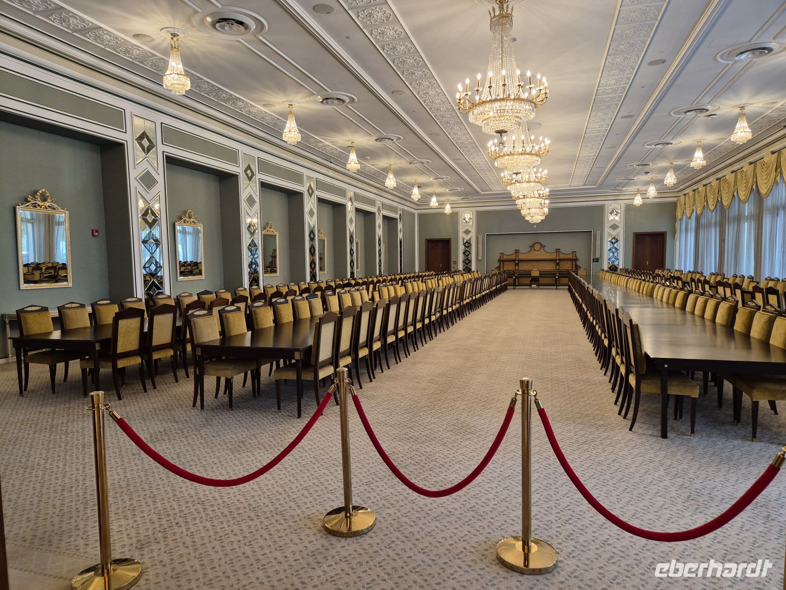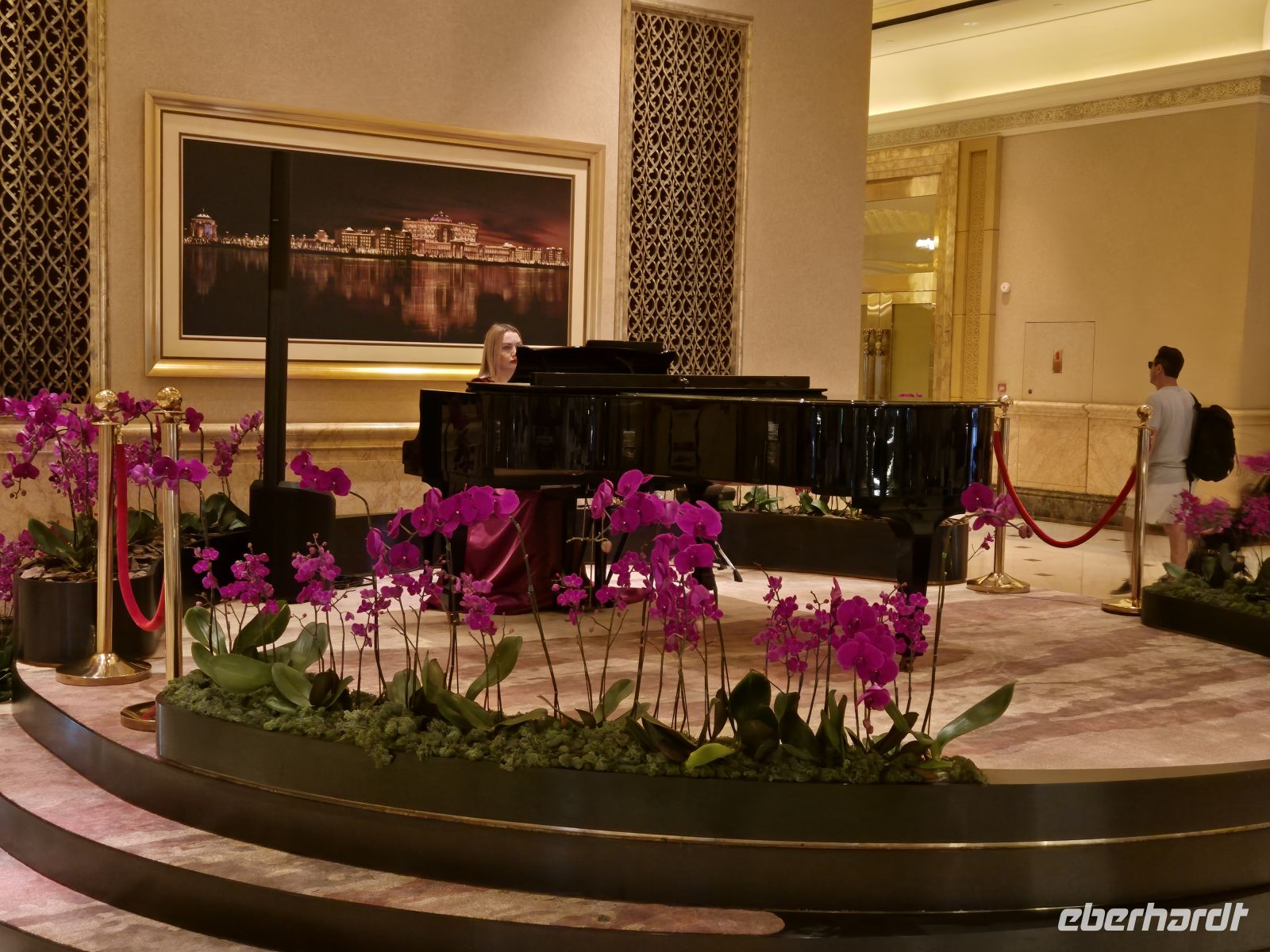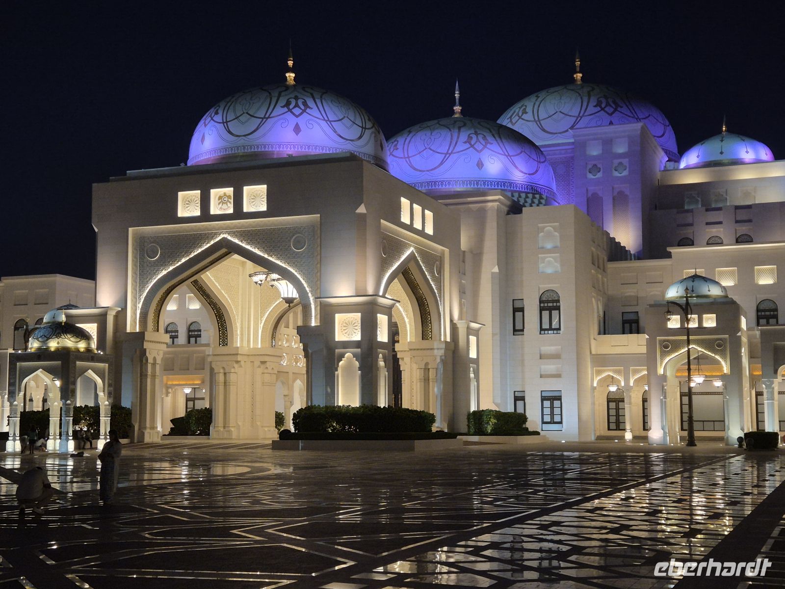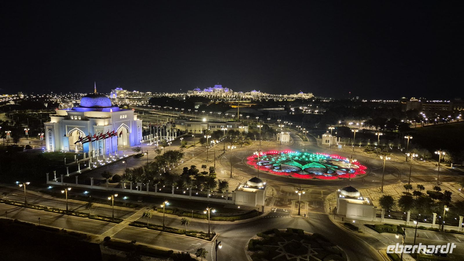 Am Nachmittag checken wir in unser Hotel ein. Es befindet sich direkt neben der Zufahrt des Präsidentenpalastes der Vereinigten Arabischen Emirate. Einige Gäste können den Palast auch vom Zimmer aus sehen. Mit einem Palast eigenen Bus fahren wir vom Besucherzentrum zum Hauptpalast, wo die Staatsgäste empfangen werden. Auch Herr Trump war dieses Jahr hier und vorgestern erst der südkoreanische Präsident. Im Palast können wir Räumlichkeiten besichtigen, die sonst nur Staatsgästen zugänglich sind. Wir kommen in den prunkvollen und riesigen Empfangssaal. Wir sehen den Bankettsaal, den großen Saal für internationale Konferenzen (Arabische Liga, Islamische Konferenz, Golfkooperationsrat), die Sammlung der Staatsgeschenke (Deutschland hat Falkenkappen geschenkt), einen Sitzungssaal und die Bibliothek. Unser „Staatsbesuch“ hier endet mit einer Licht- und Tonschau, die „Palace in Motion“ Show. Diese zeigt Motive aus der Geschichte, Gegenwart und Zukunft des Landes.