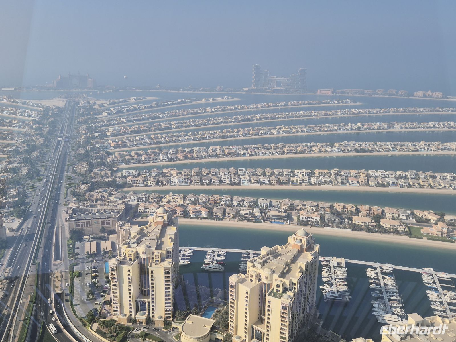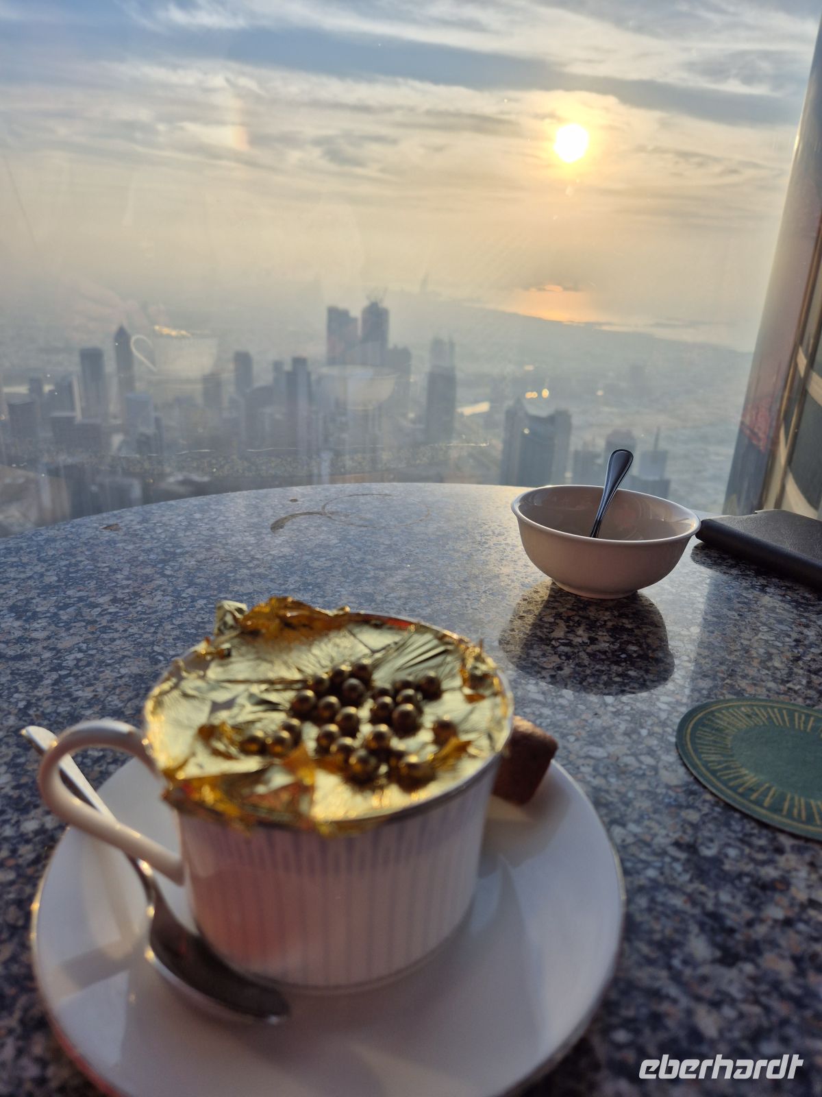 Ein Highlight heute ist zweifellos die Auffahrt auf den Burj Khalifa. Wir haben für uns exklusiven Zugang zum Armani Hotel und von hier aus ins Atmosphere in der 122. Etage. Da lassen wir es uns bei einigen Trinks oder einem Goldcappuccino gut gehen und genießen die Aussicht.