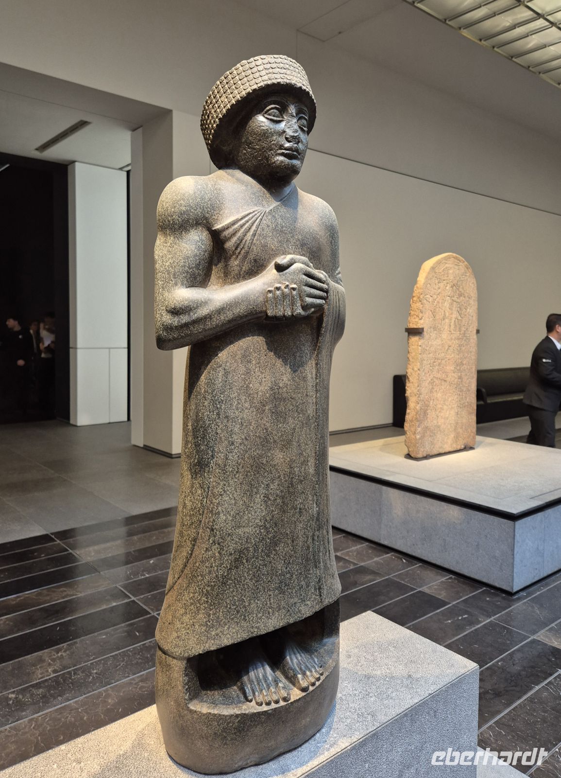 Wir besuchen den 2017 eröffneten Louvre Abu Dhabi. Zu Beginn genießen wir Architektur: Es ist ein ganz besonderes Erlebnis, unter der 180 Meter messenden Kuppel des Museums zu stehen und dabei das Spiel von Licht und Schatten zu erleben. Die Kuppel wurde so entworfen, dass einzelne Sonnenstrahlen durchdringen – ähnlich wie in einer Oase oder einem mit Dattelpalmenwedeln überdachten Souk. Der Louvre erhielt den Beinamen „Archipel der Kunst“, denn er wurde ins Meer gebaut und ist von drei Seiten vom Arabischen Golf umspült. Darüber hinaus ist es ist ein Hinweis auf das Ausstellungskonzept: ein Platz an dem Kunstwerke aus verschiedenen Kulturen der Welt unter einem schützenden Schirm vereint sind.