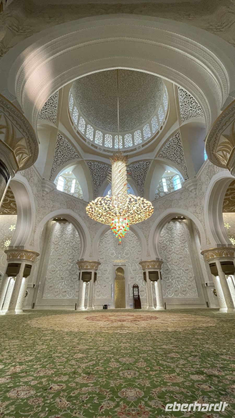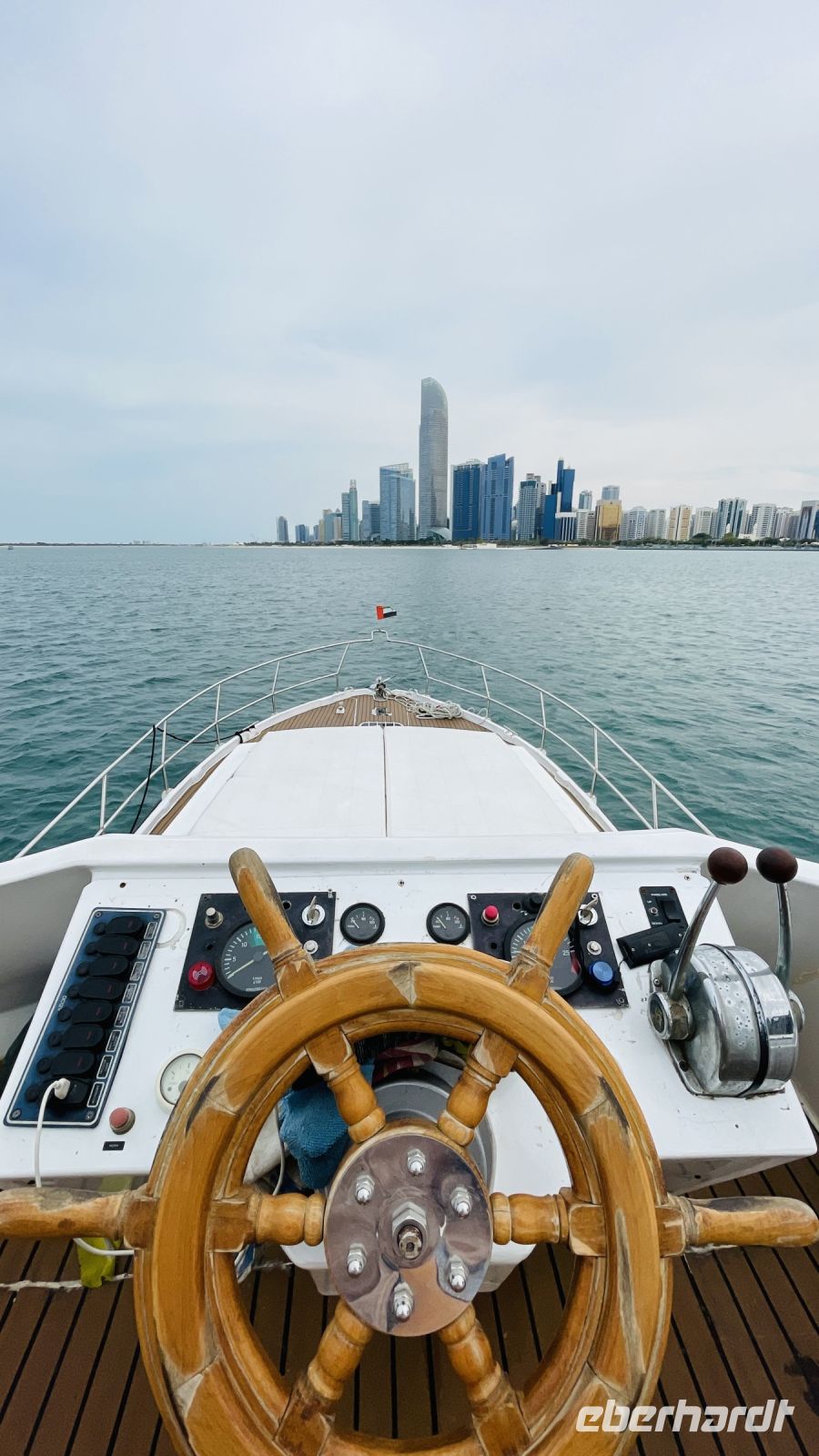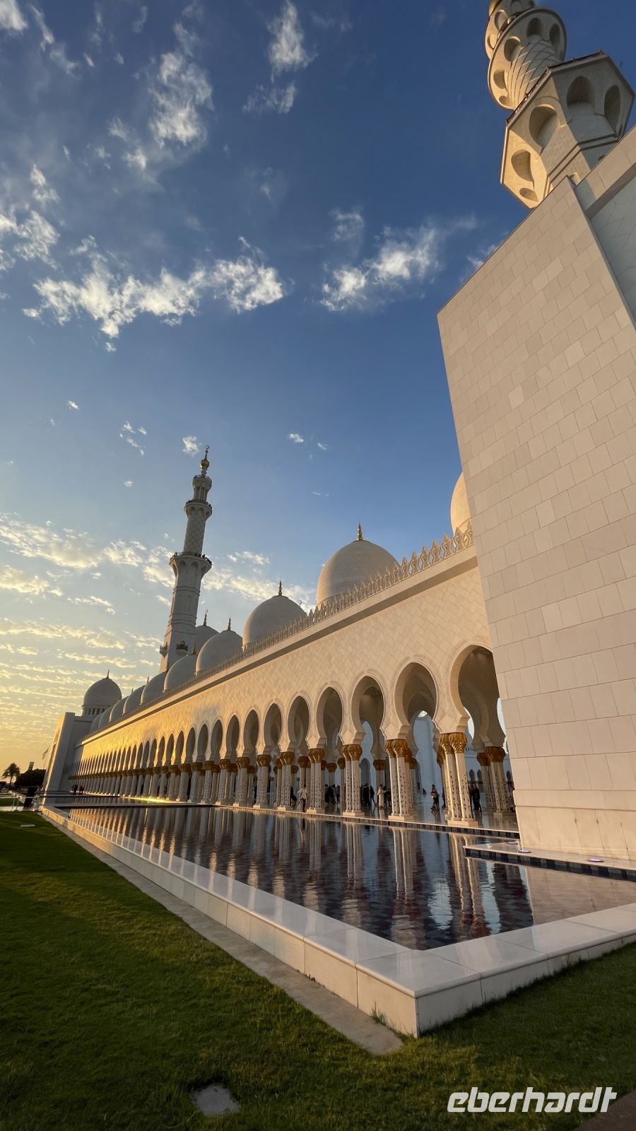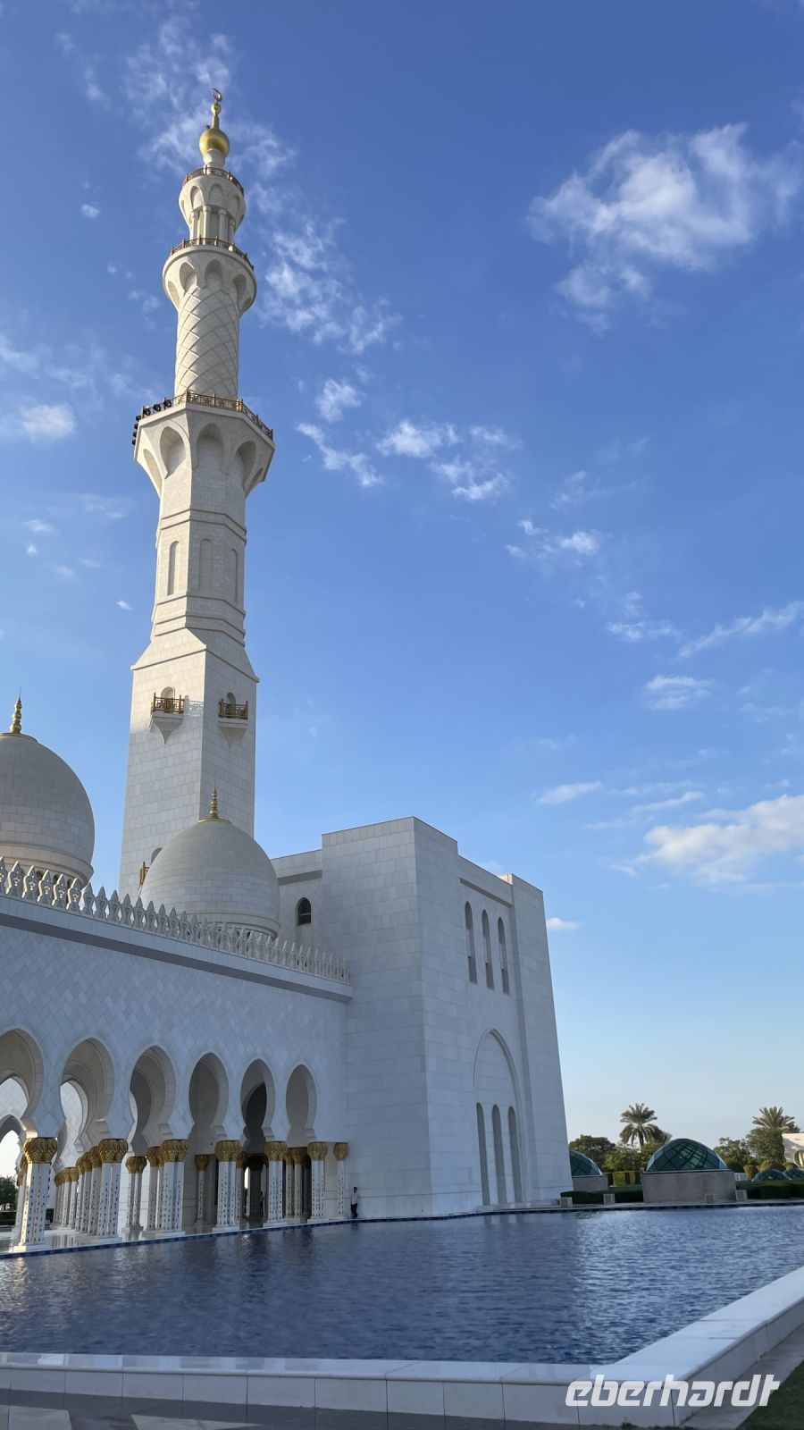 Der Tag beginnt abermals mit einem ausgewogenen Frühstück. Im Anschluss daran begeben wir uns zum Treffpunkt, wo bereits unser örtlicher Reiseleiter Peter auf uns wartet. Als erstes besuchen wir die Falkenklinik von Frau Dr. Müller – einer deutschen Tierärztin. Vor Ort werden wir vom Gästeführer Hasan herzlich begrüßt und durch die Klinik geführt. Wir dürfen sogar bei einer Routineuntersuchung über die Schultern schauen und erhalten dabei Erklärungen von den Tierpflegern. Anschließend besichtigen wir die Käfiganlagen der Falken sowie ein kleines Museum, in der man die Möglichkeit hat Fotos mit den Falken zu knipsen. Nach diesen einmaligen Eindrücken geht es zurück nach Abu Dhabi. Gegen späteren Mittag erreichen wir die „Heritage Village“, wo wir einen Rundgang einlegen und die imposante Skyline fotografisch festhalten. Weiter geht es zur „Marina Mall“, wo wir unsere Mittagspause einlegen. Gut gesättigt geht es weiter in Richtung Scheich-Zayid-Moschee. Dort angekommen spazieren wir unterirdisch durch eine große Mall und schließlich durch die Sicherheitskontrolle. Nach einem weiteren langen Gang erreichen endlich die 4. größte Moschee der Welt. Auch hier unternehmen wir mit Peter einen ausführlichen Rundgang. Leider sind über Weihnachten und Silvester besonders viele Touristen in der Stadt, weshalb die meisten Sehenswürdigkeiten sehr gut besucht sind. Beeindruckt von so vielen, diversen Eindrücken, fahren wir zurück ins Hotel. Allerdings endet damit unser Tag noch nicht, denn ein weiteres Highlight wartet noch auf uns – eine Dhau Bootsfahrt inkl. 4 Gänge-Menü an Board. Wir fahren ca. 2 Stunden entlang der Corniche und blicken auf die eindrucksvolle Skyline.